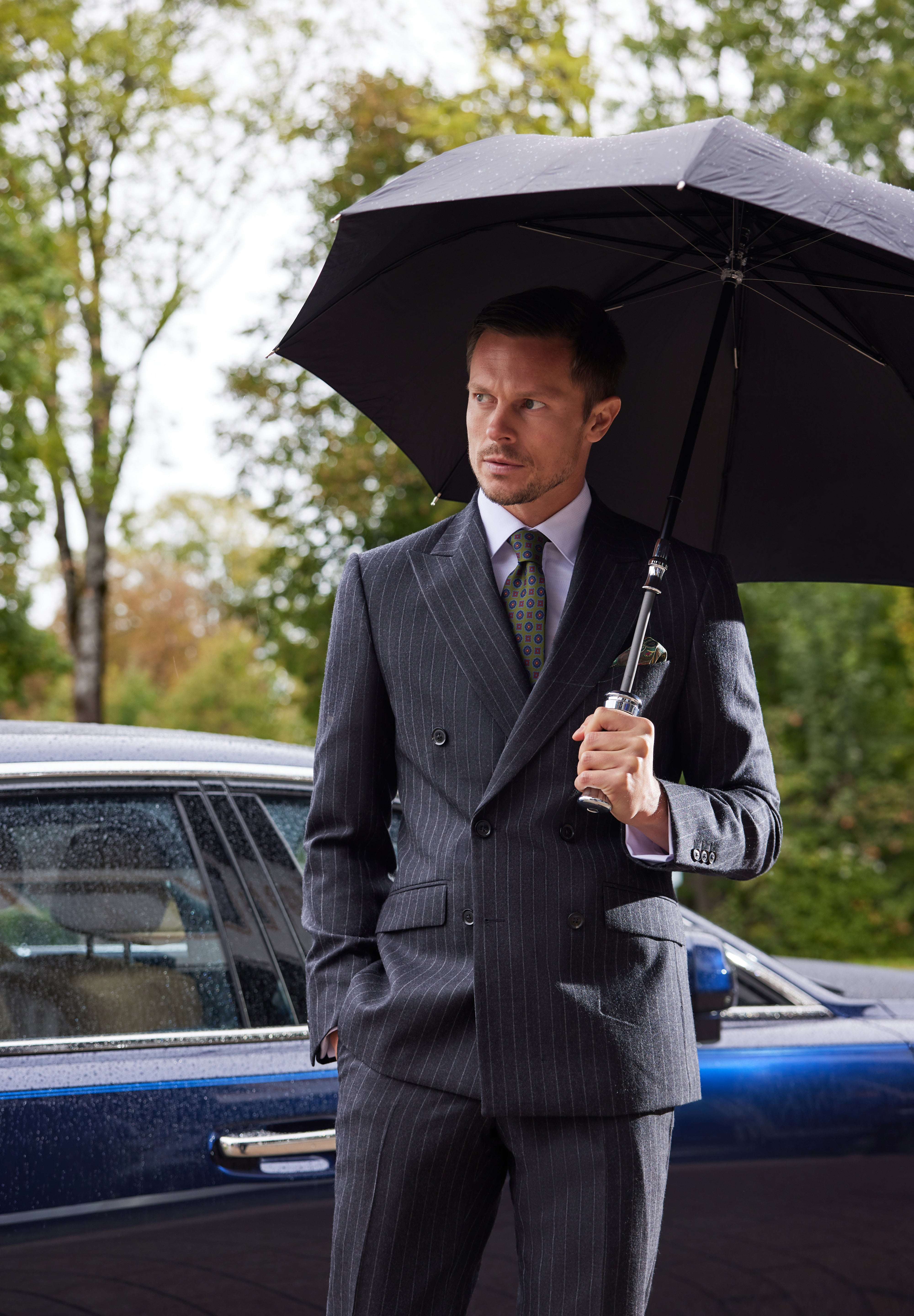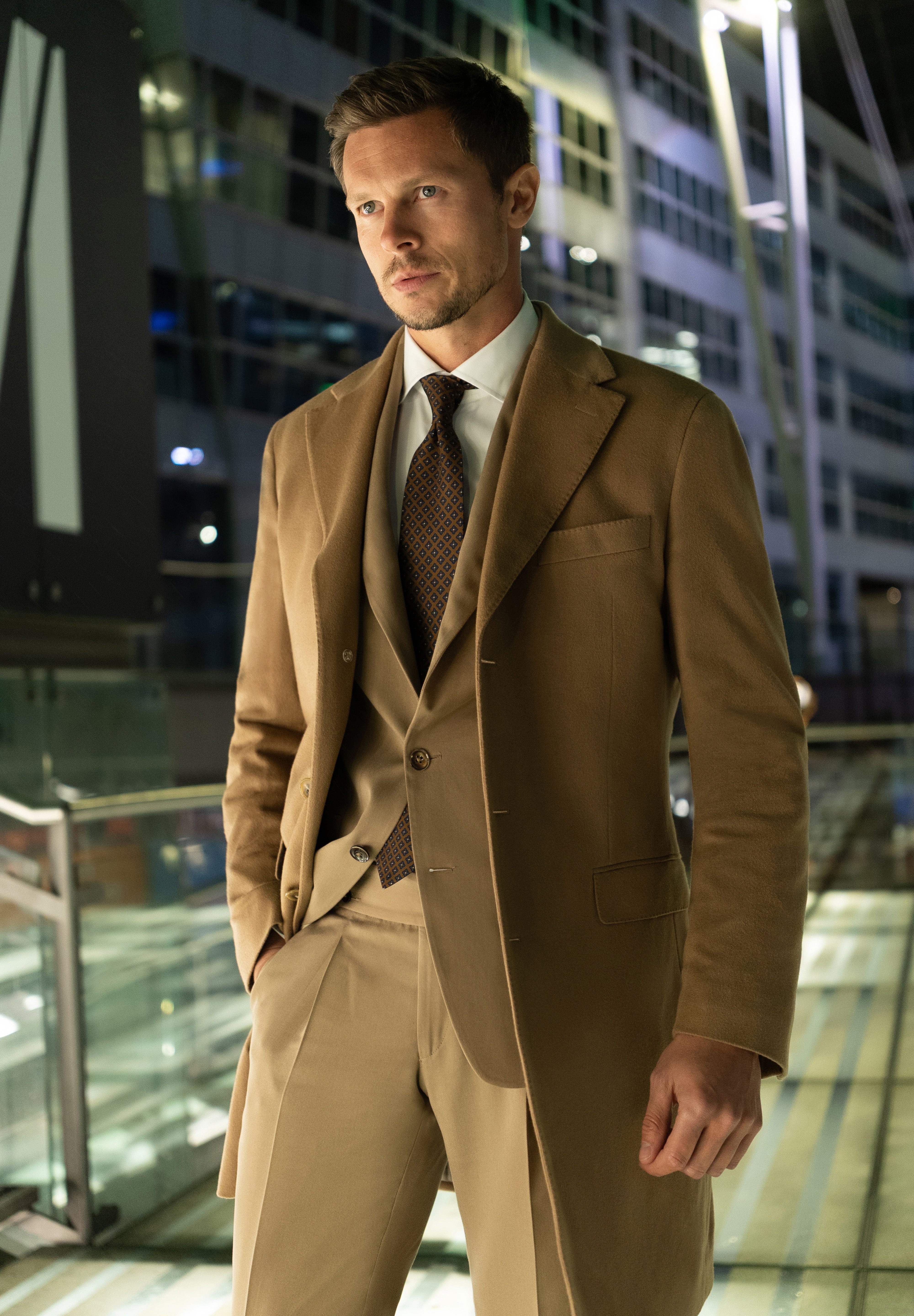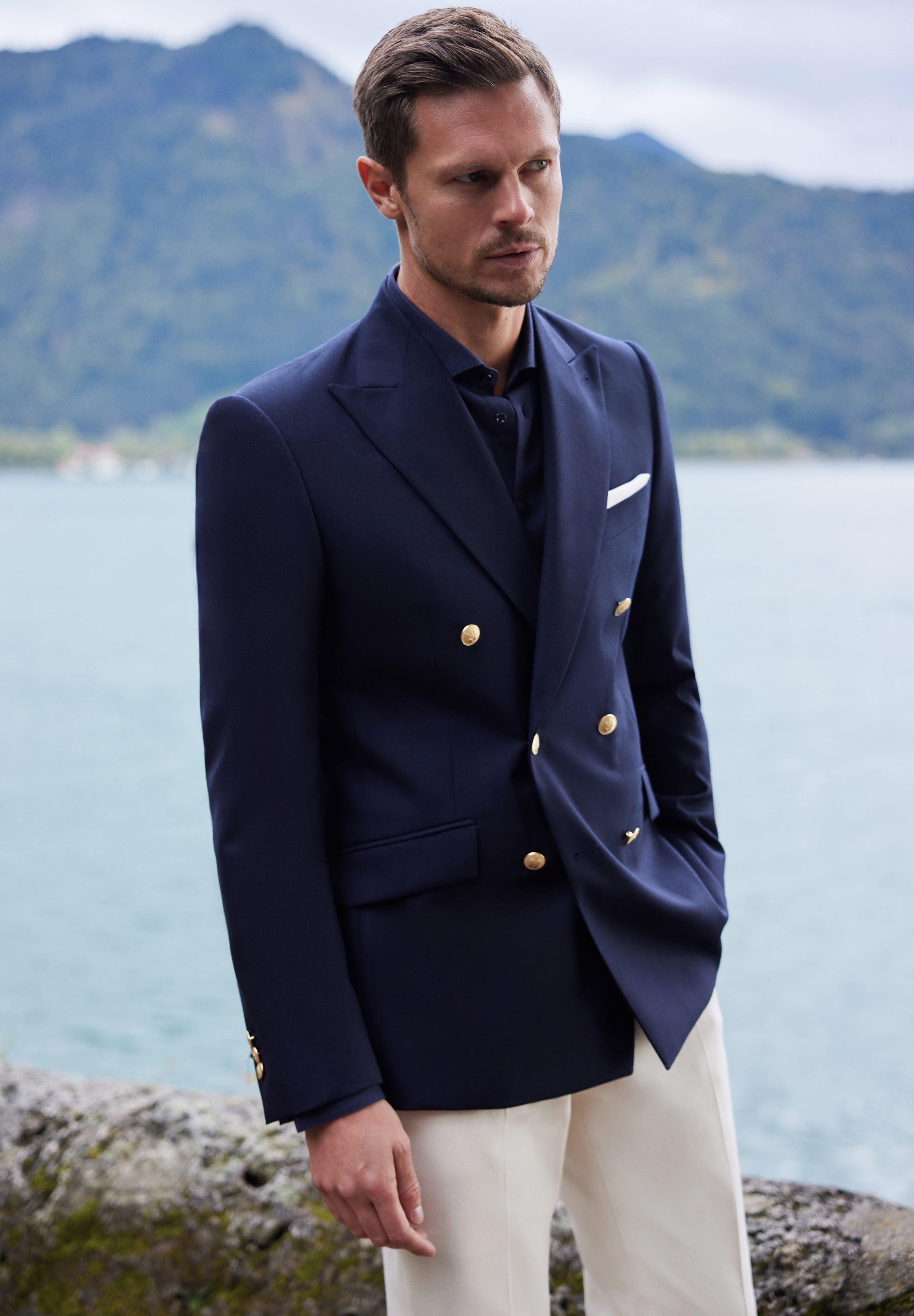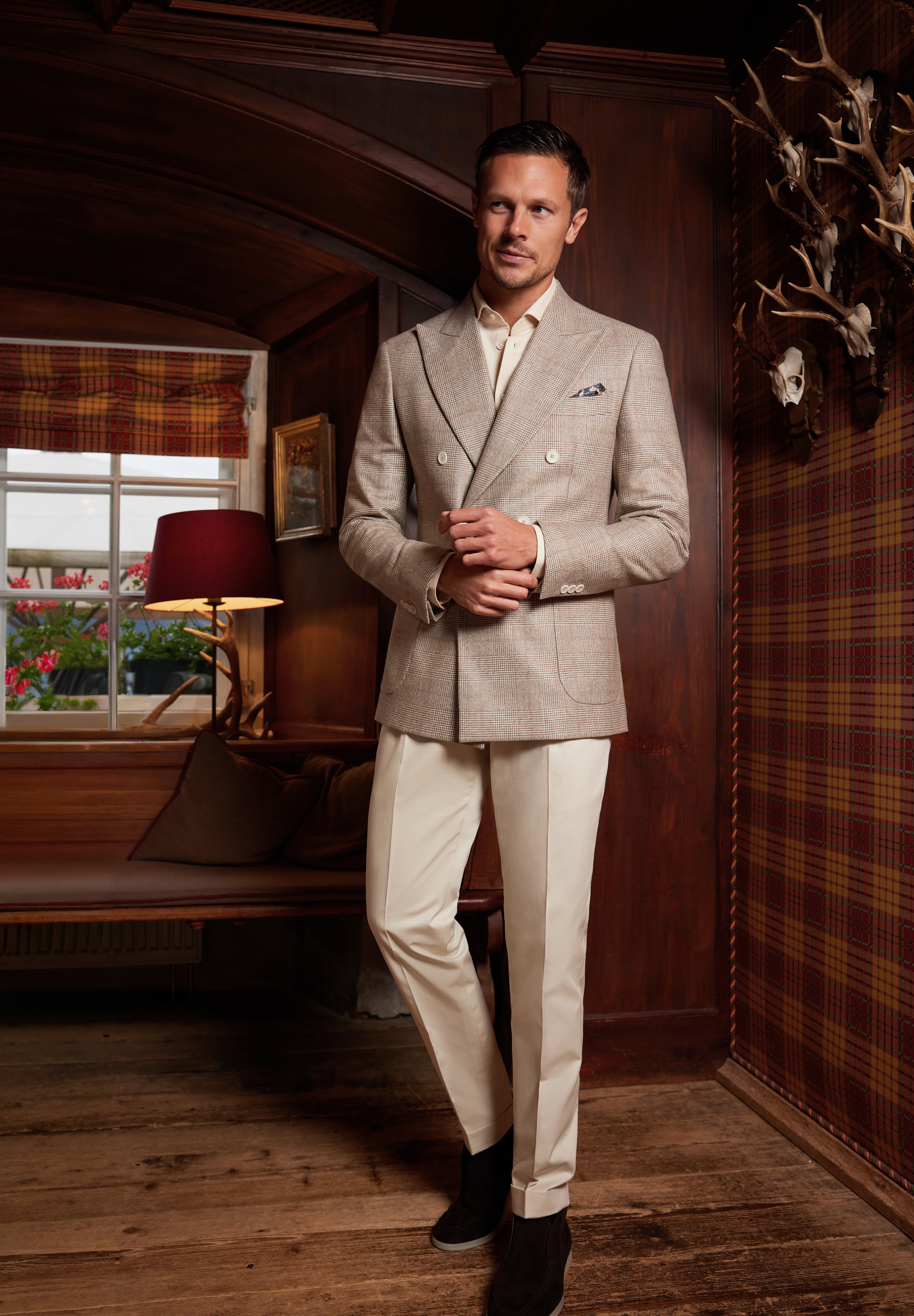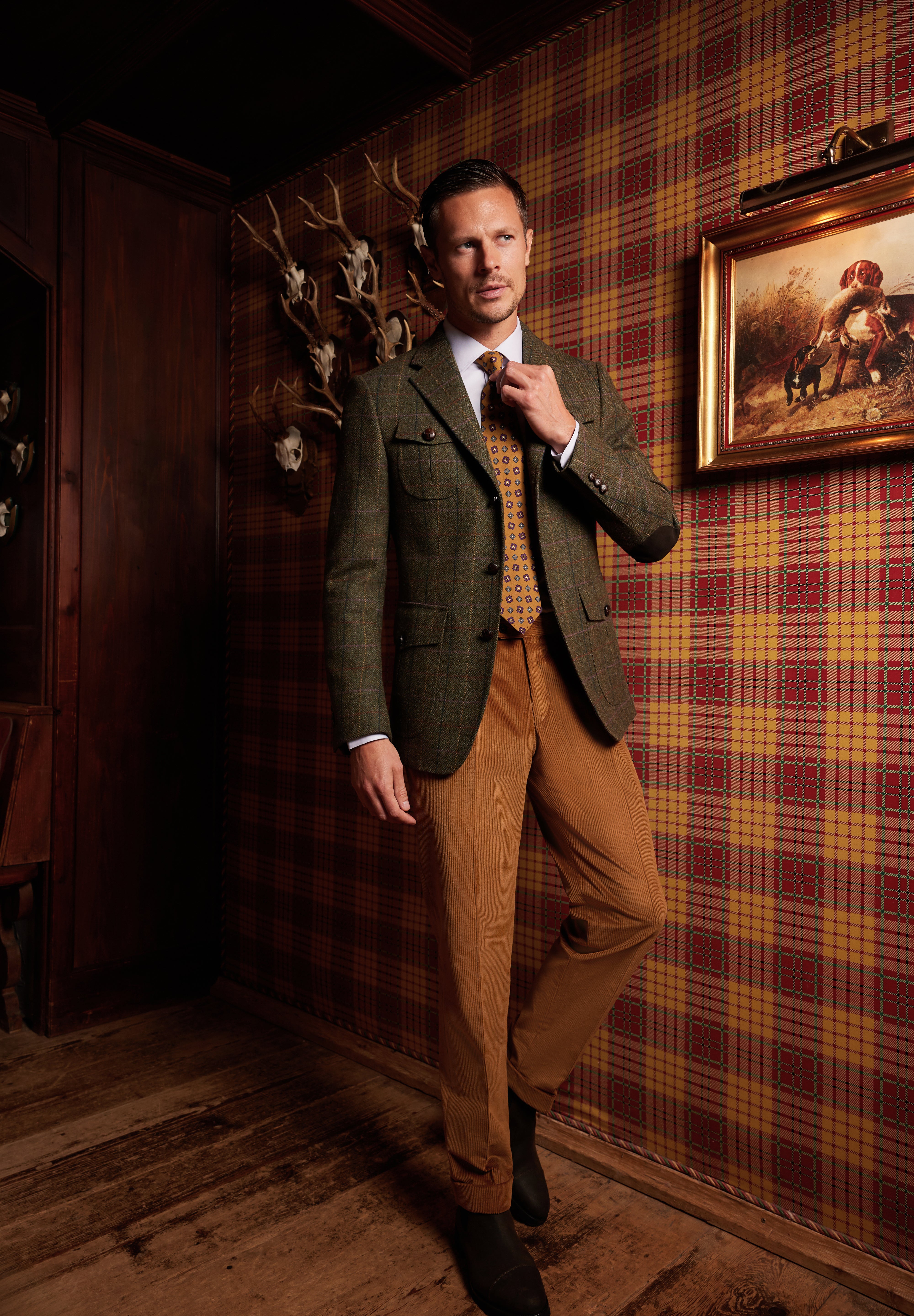 De la sacouri din cașmir Loro Piana și tweed dens Holland & Sherry, până la costume double-breasted din lână Alfred Moon și smochinguri din țesături rafinate Ermenegildo Zegna — fiecare piesă vorbește despre echilibrul dintre forță și eleganță, tradiție și modernitate.