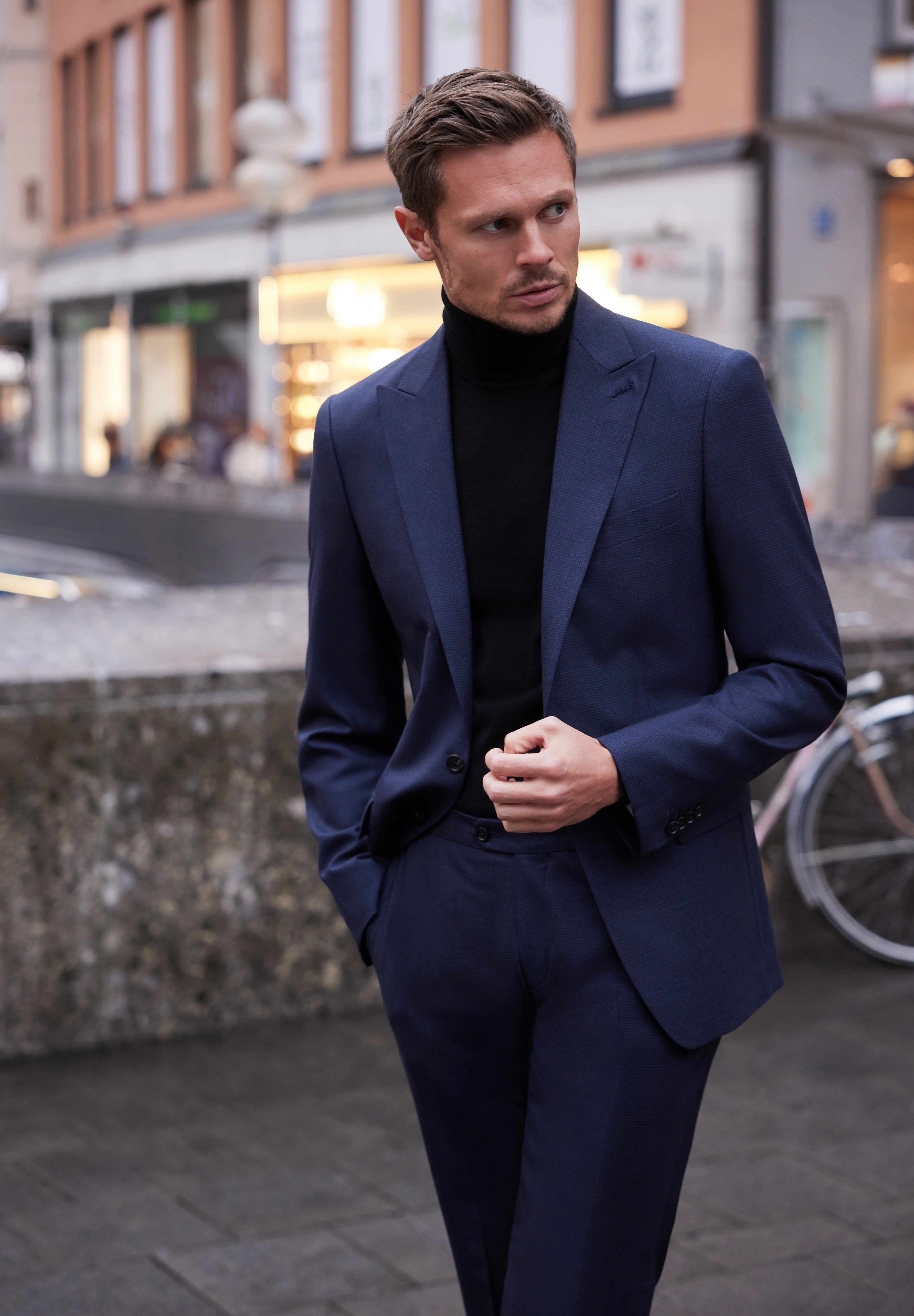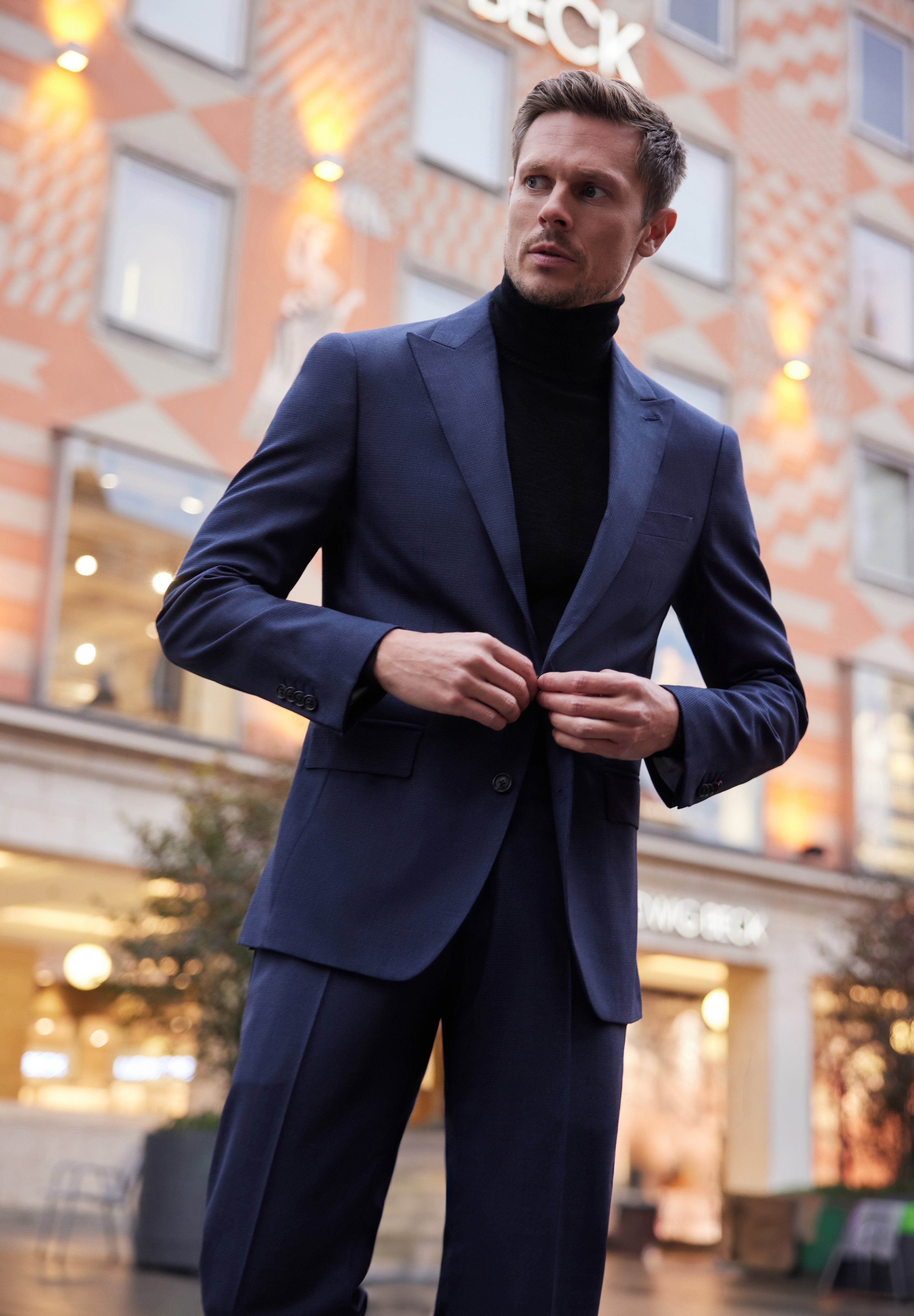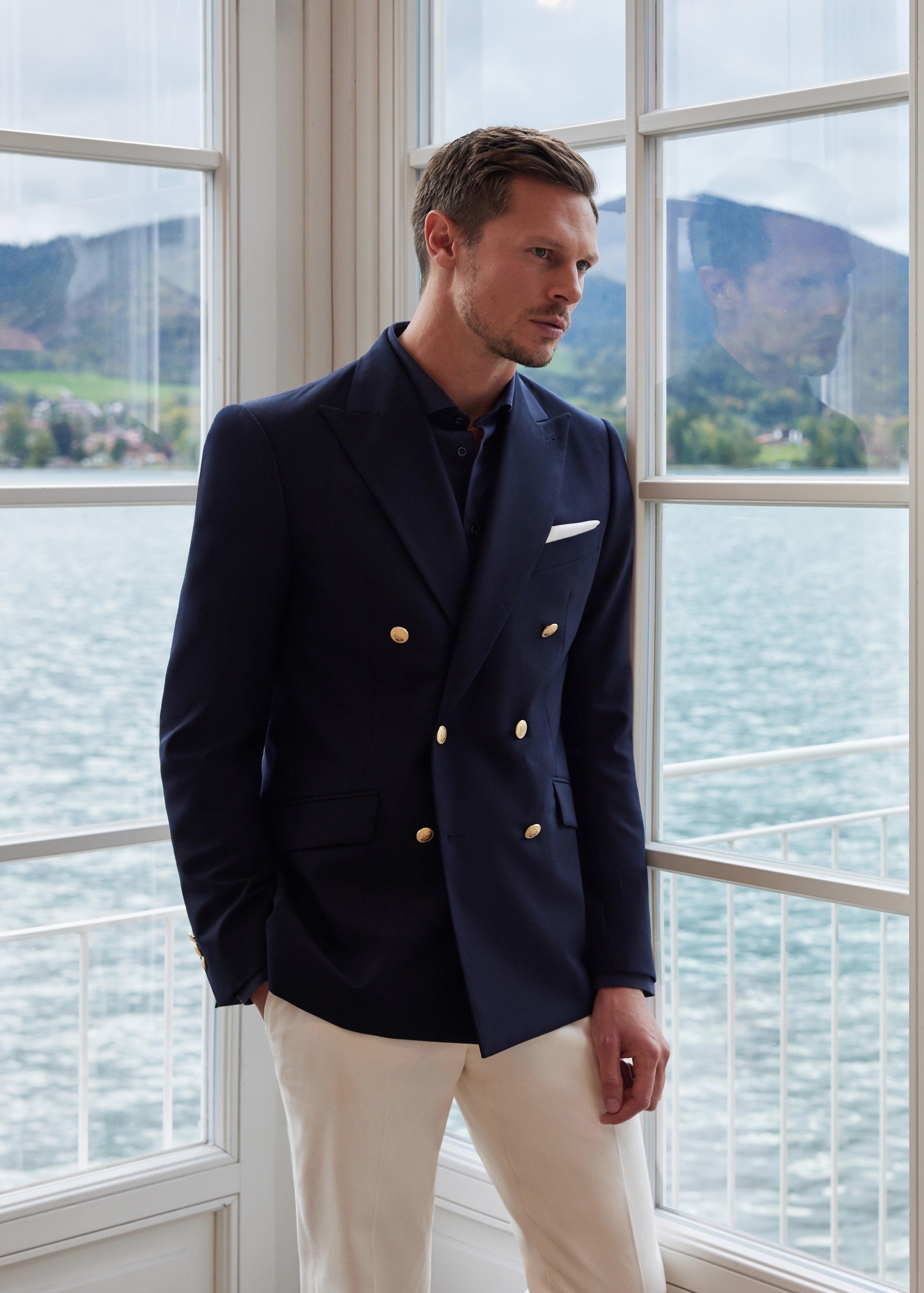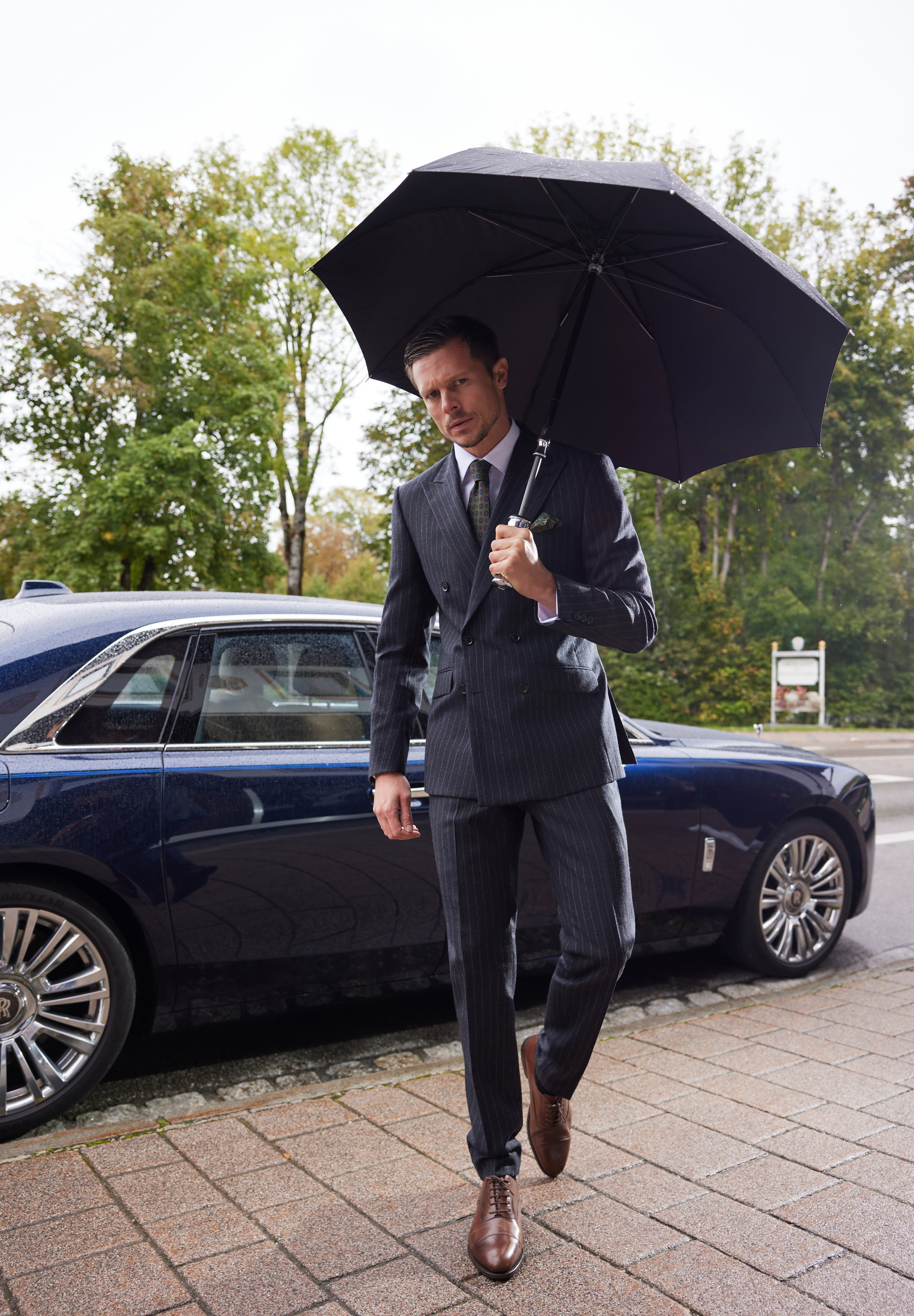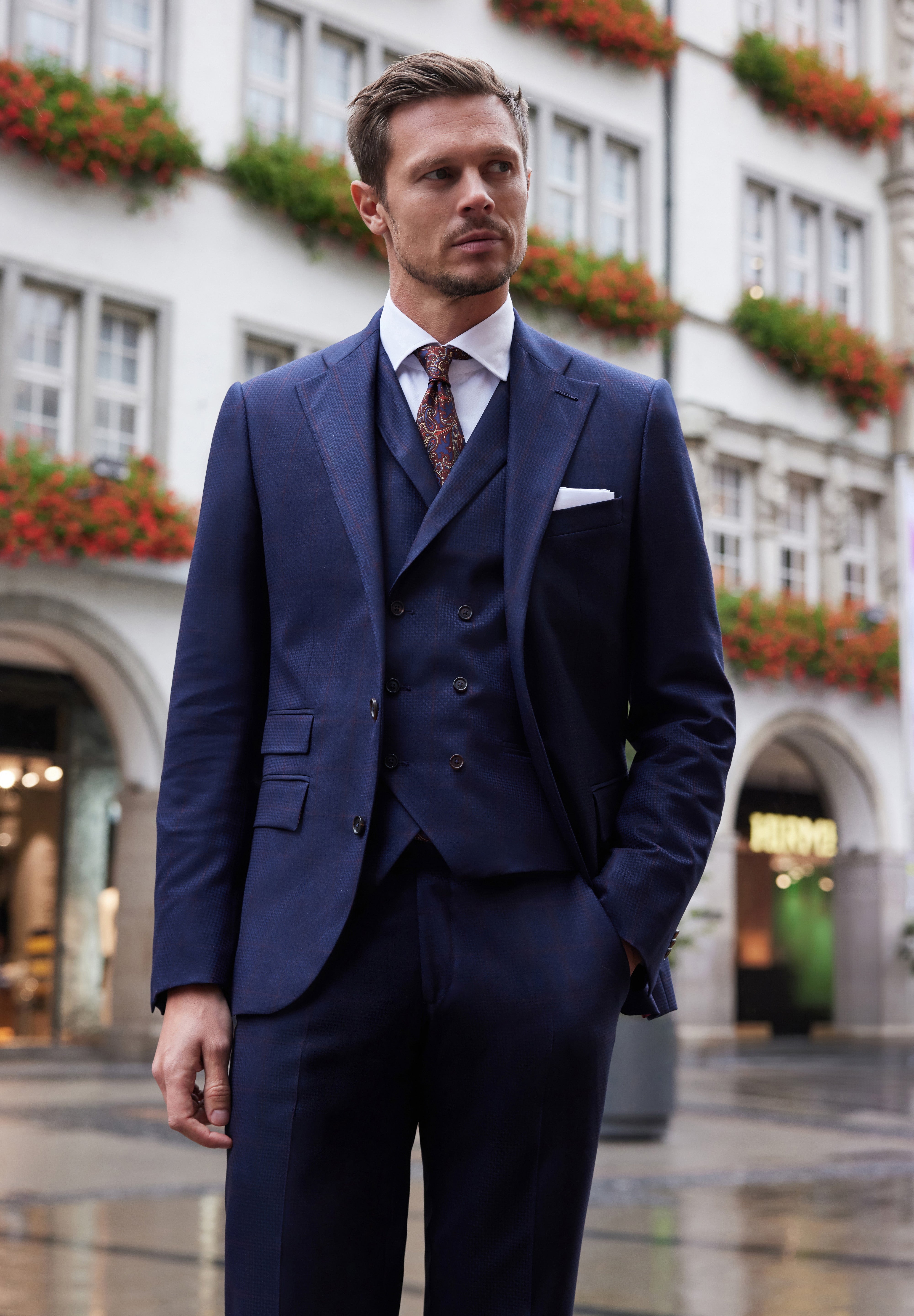 De la sacouri din cașmir Loro Piana și tweed dens Holland & Sherry, până la costume double-breasted din lână Alfred Moon și smochinguri din țesături rafinate Ermenegildo Zegna — fiecare piesă vorbește despre echilibrul dintre forță și eleganță, tradiție și modernitate.