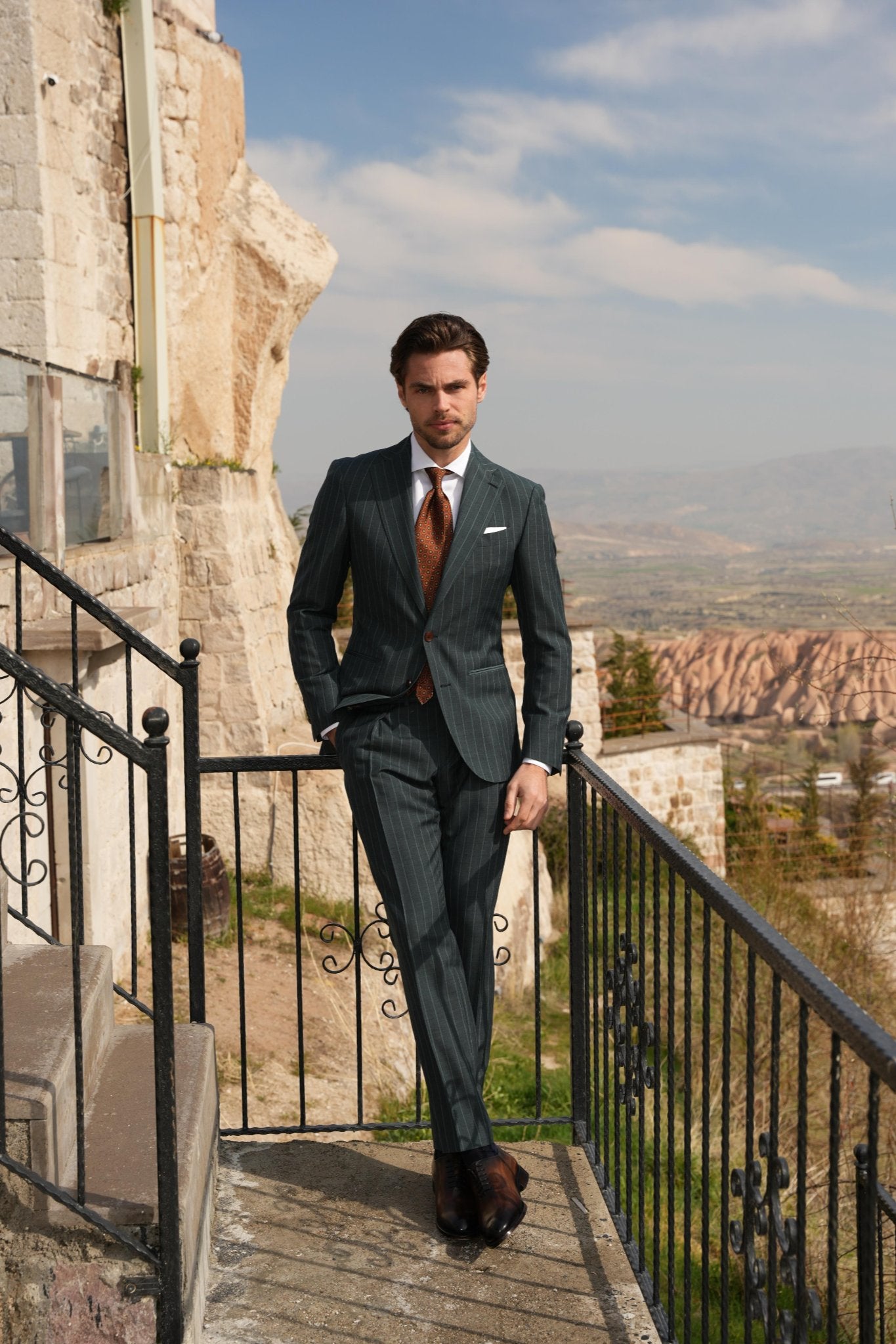 Verdele Teal al costumului Archelais este complementat jovial de modelul dungilor verticale, creând o siluetă alungită și elegantă. Fabricat dintr-o combinație de lână și mohair, acest costum oferă o textură premium și un confort deosebit. Archelais este ideal pentru evenimentele speciale unde eleganța și unicitatea sunt esențiale, aducând un plus de distincție oricărei apariții.