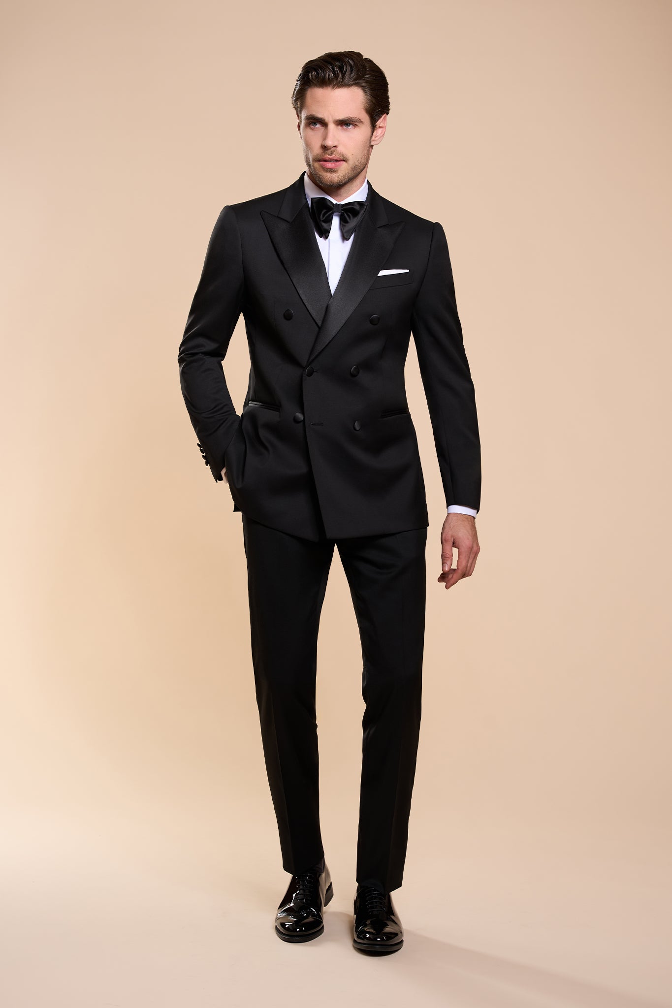 Perfect elegance down to the smallest details, prestige and refinement, quality and excellence, are the qualities that this Black Tie Suit envelops you with, which we highly recommend for the important events in your life.