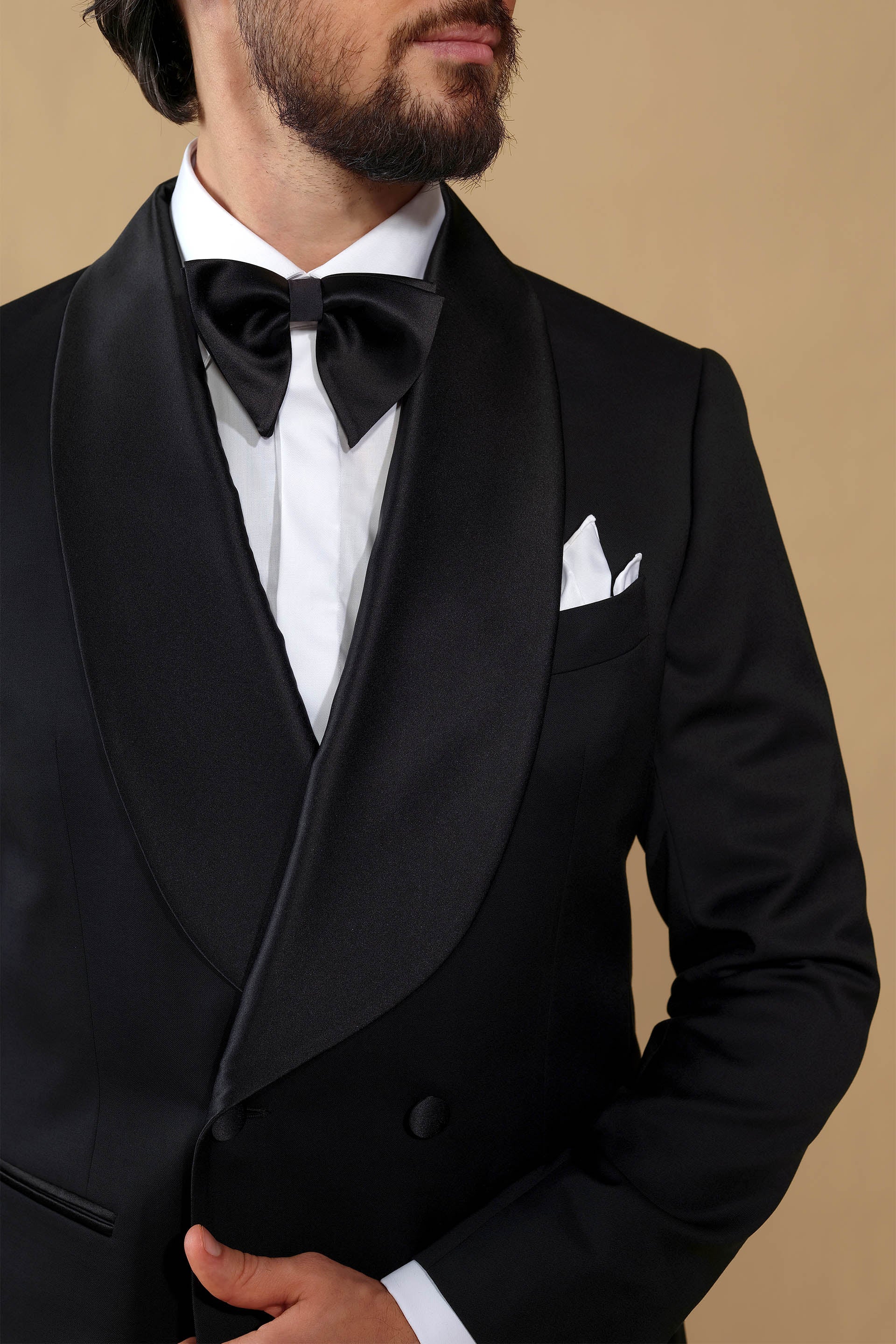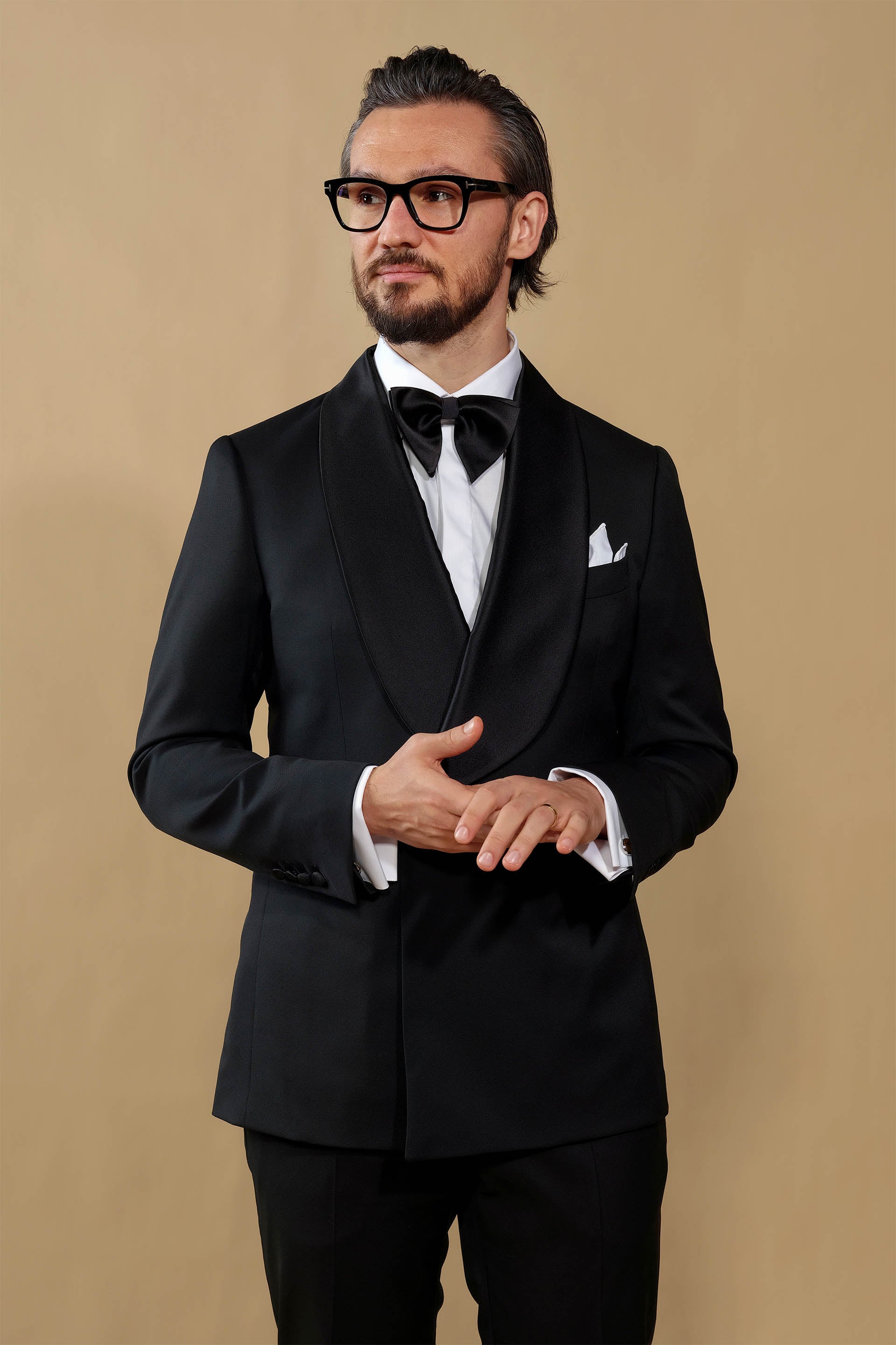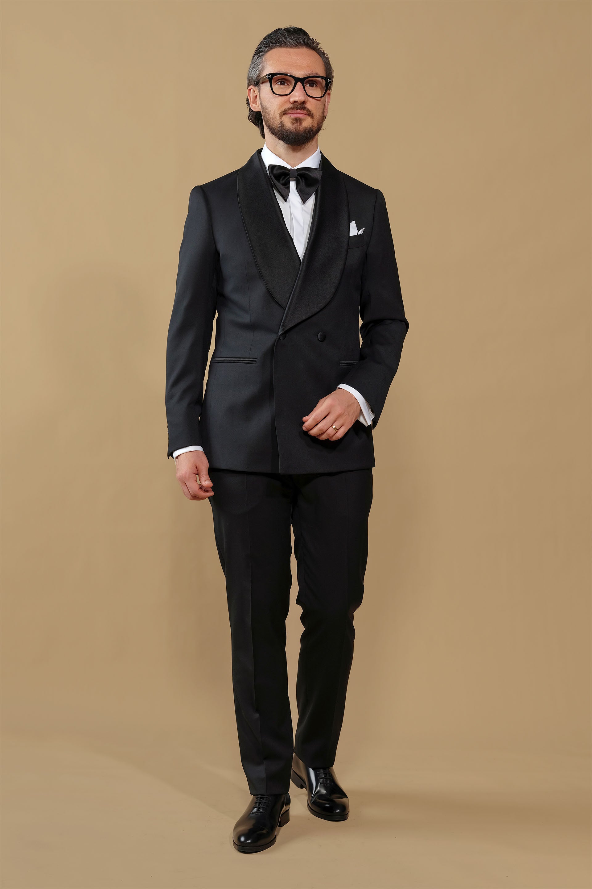 Smokingul cu rever de tip șal (rotunjit) oferă o eleganță clasică și discretă, un aer rafinat și subtil. Liniile sale rotunjite conferă fluiditate și simplitate, creând o siluetă impecabilă și sofisticată.