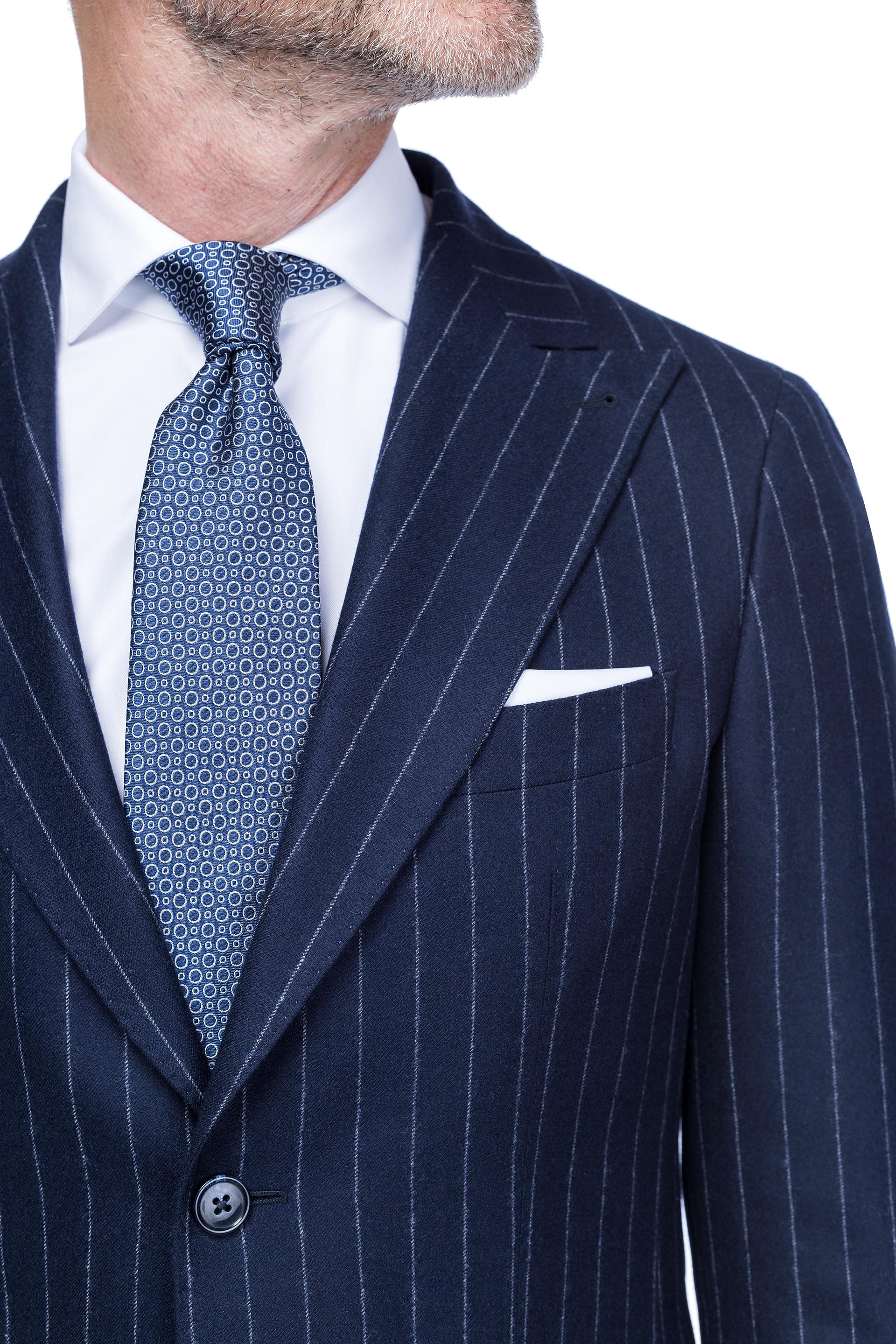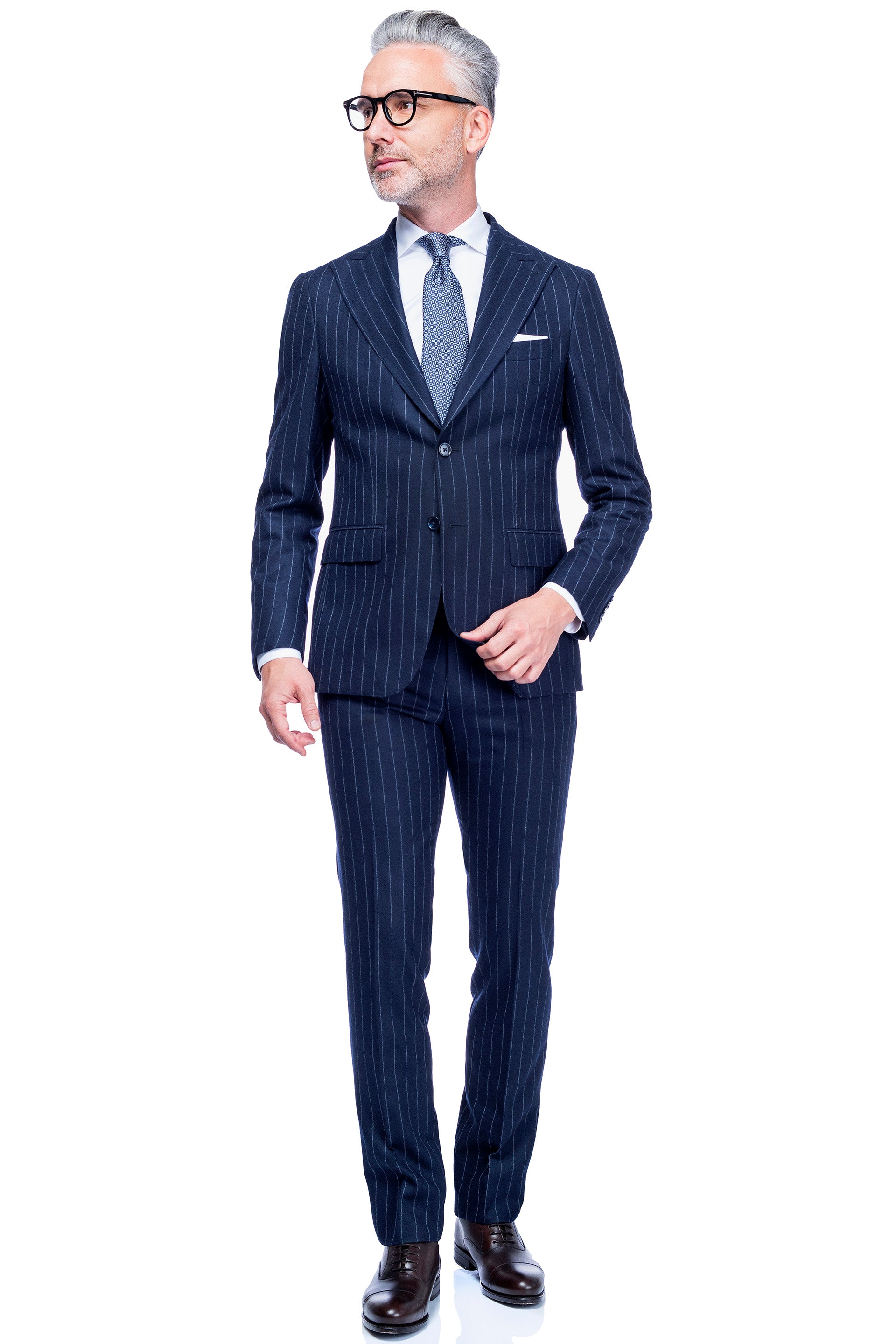 The Lefkada suit is a suit for the fall-winter season. It is cut from a navy blue striped flannel, one of the most classic fabrics for business suits.