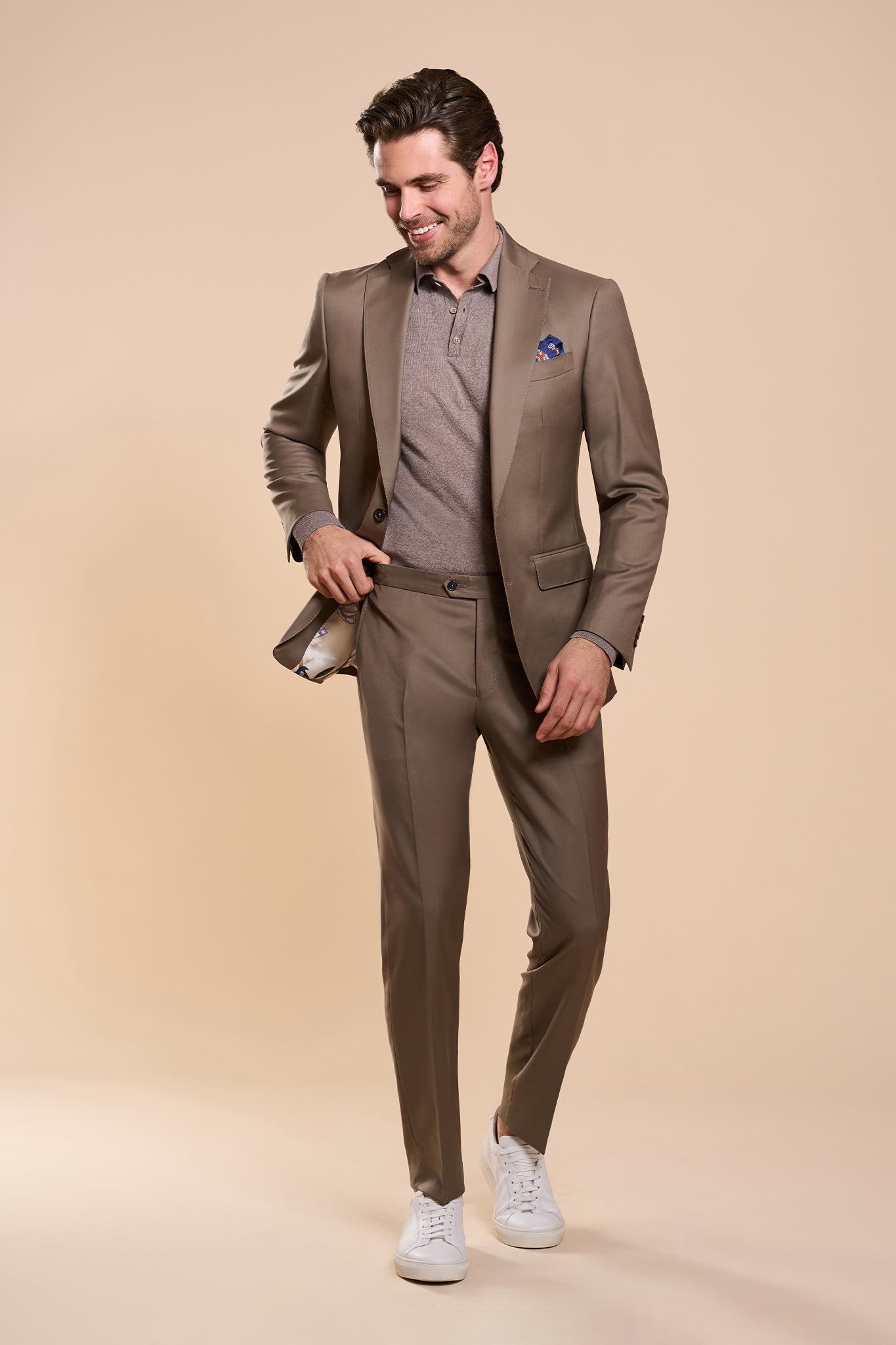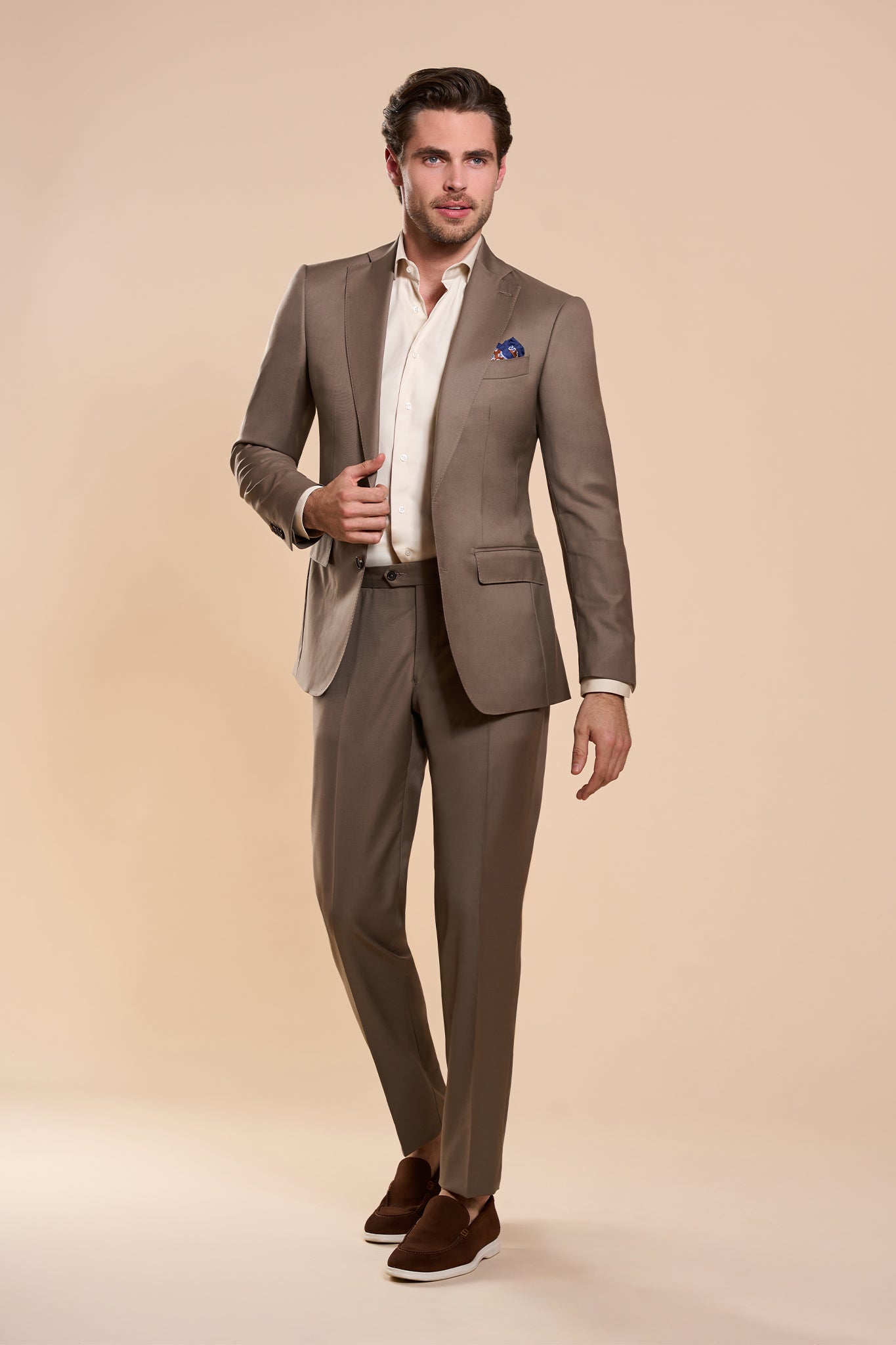 Costumul Melitene, într-o nuanță discretă de bej (cafe au lait), reprezintă esența eleganței simple. Modelul uni și lâna super fină fac din acest costum o alegere ideală pentru aparițiile notabile, unde subtilitatea și rafinamentul sunt la ordinea zilei. Melitene emană calm și încredere, fiind perfect pentru bărbatul care apreciază stilul clasic, dar distins.