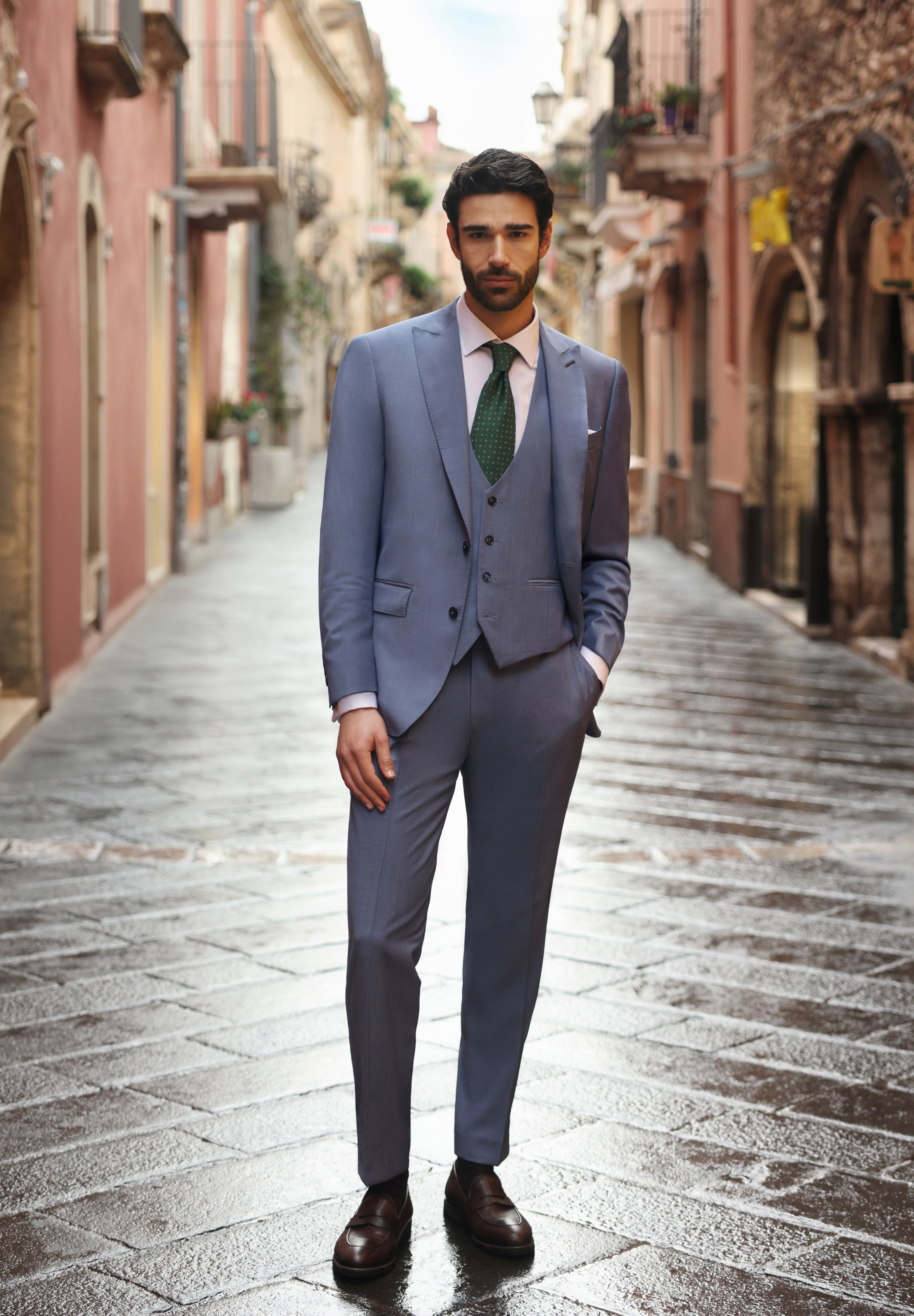 Cut: single-breasted jacket with soft shoulders and partial lining for a flowing silhouette; slim-fit vest with discreet buttons and hidden adjustment button; mid-rise trousers with perfect length, slightly tapered hem towards the ankle.