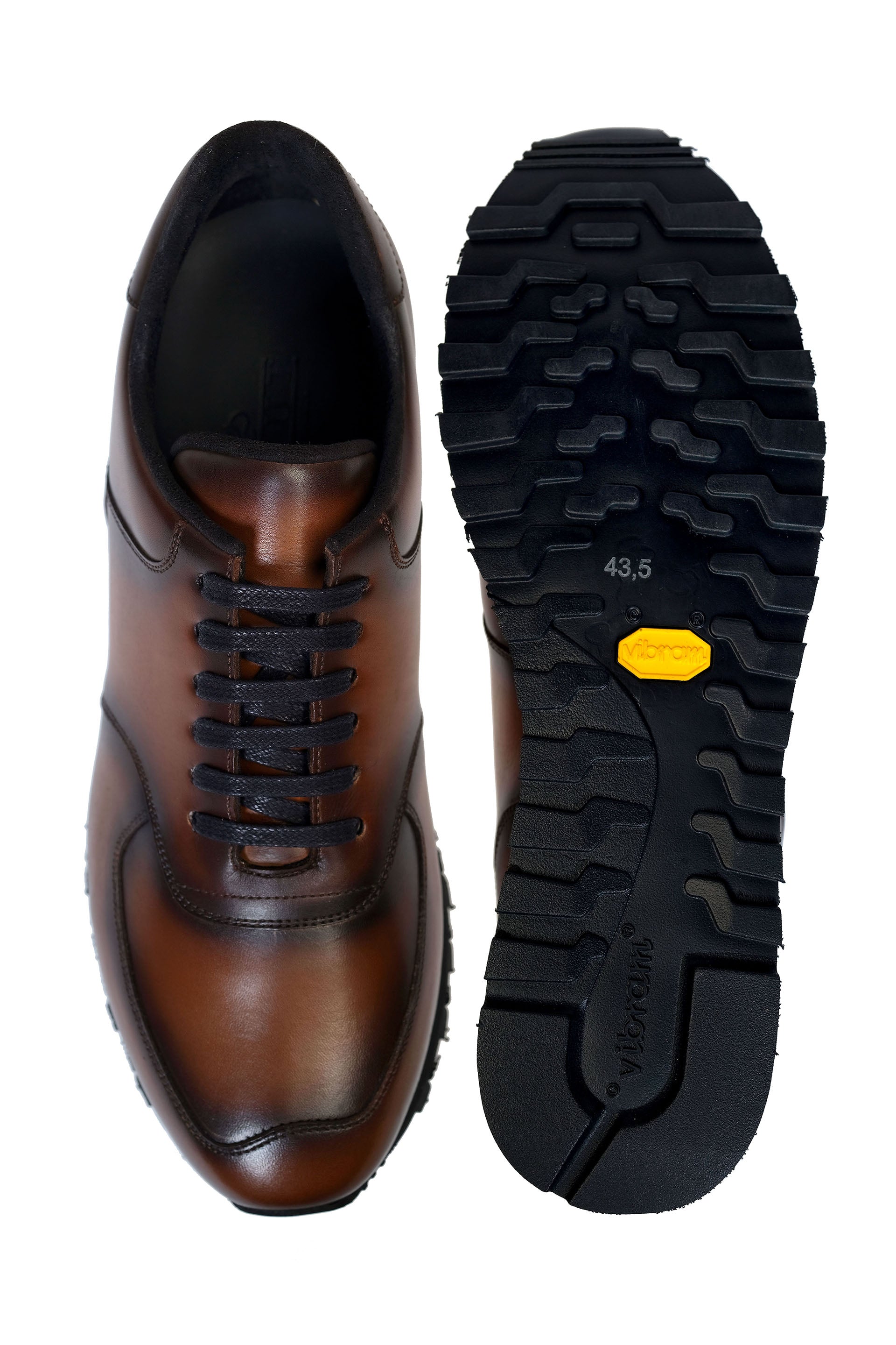 The MED BROWN calf leather with burnish effect takes them out of the ordinary of a pair of sports shoes. The Vibram sole is light and comfortable, but with increased grip, offering the wearer a remarkable ease of wearing.