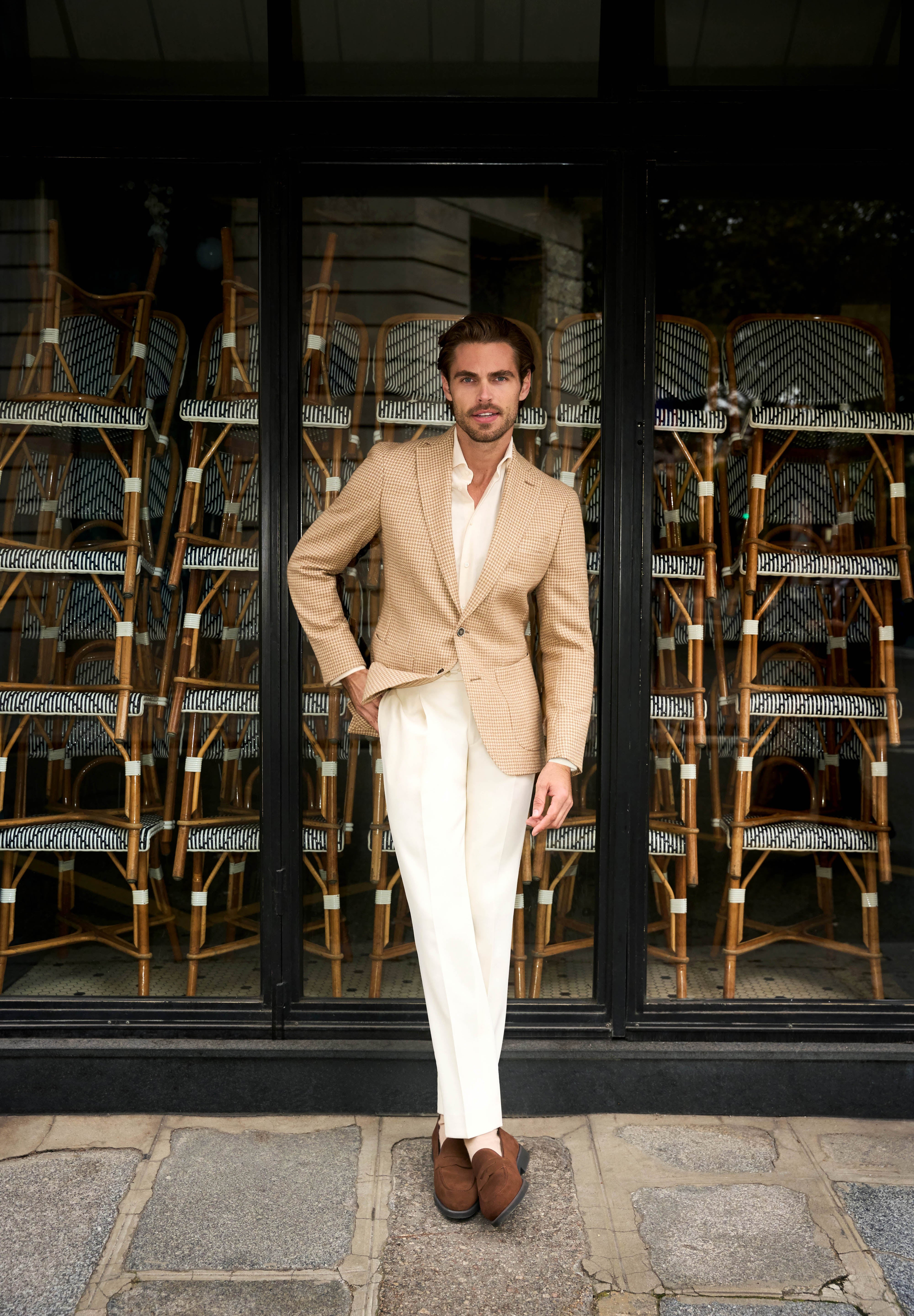 The Coudray trousers in the "Fall in Love, in Paris" Collection stand out for their unmistakable Carnet fabric, made of 100% wool, with a color and cut that exudes refinement, attention to detail, finesse and boldness.