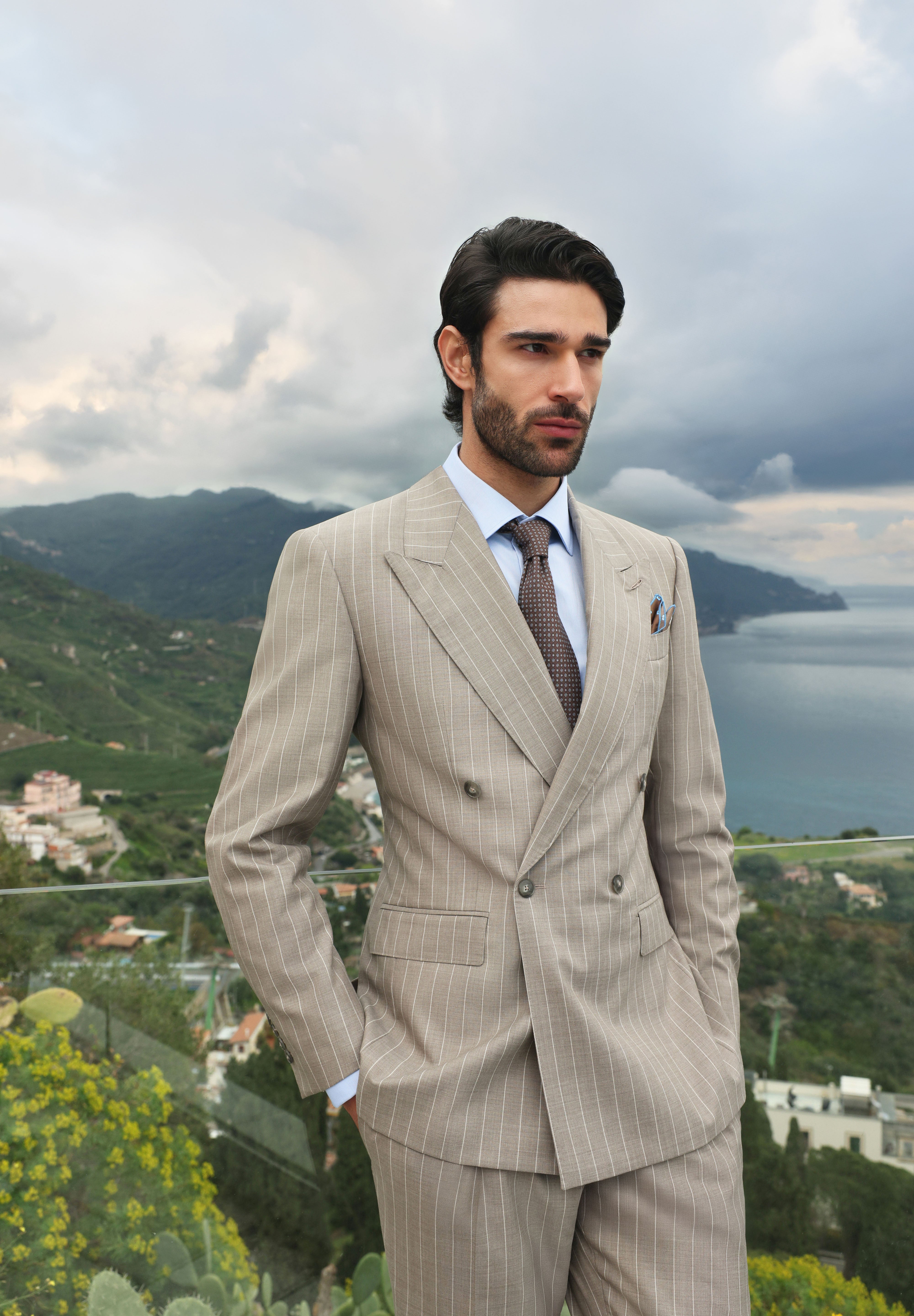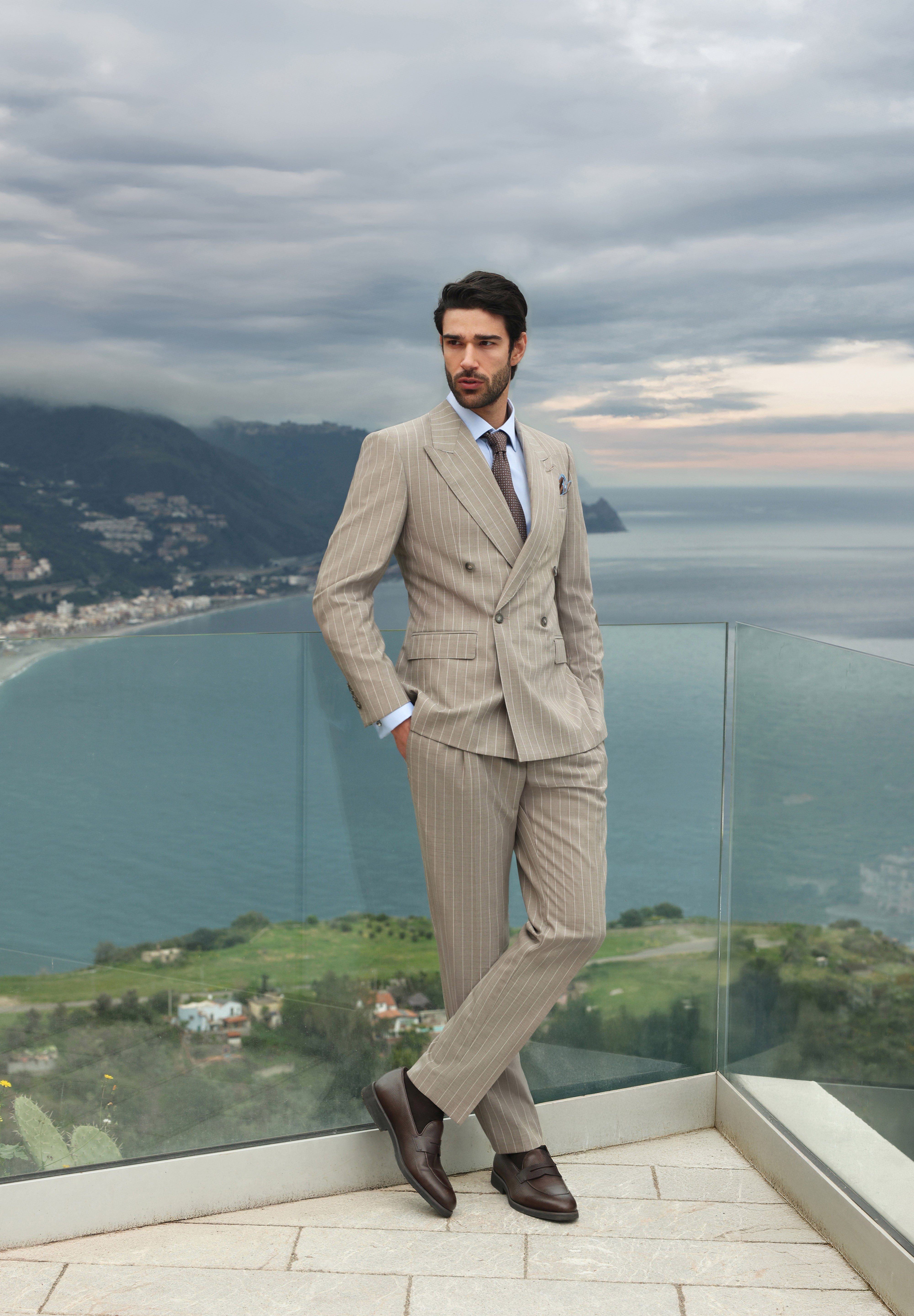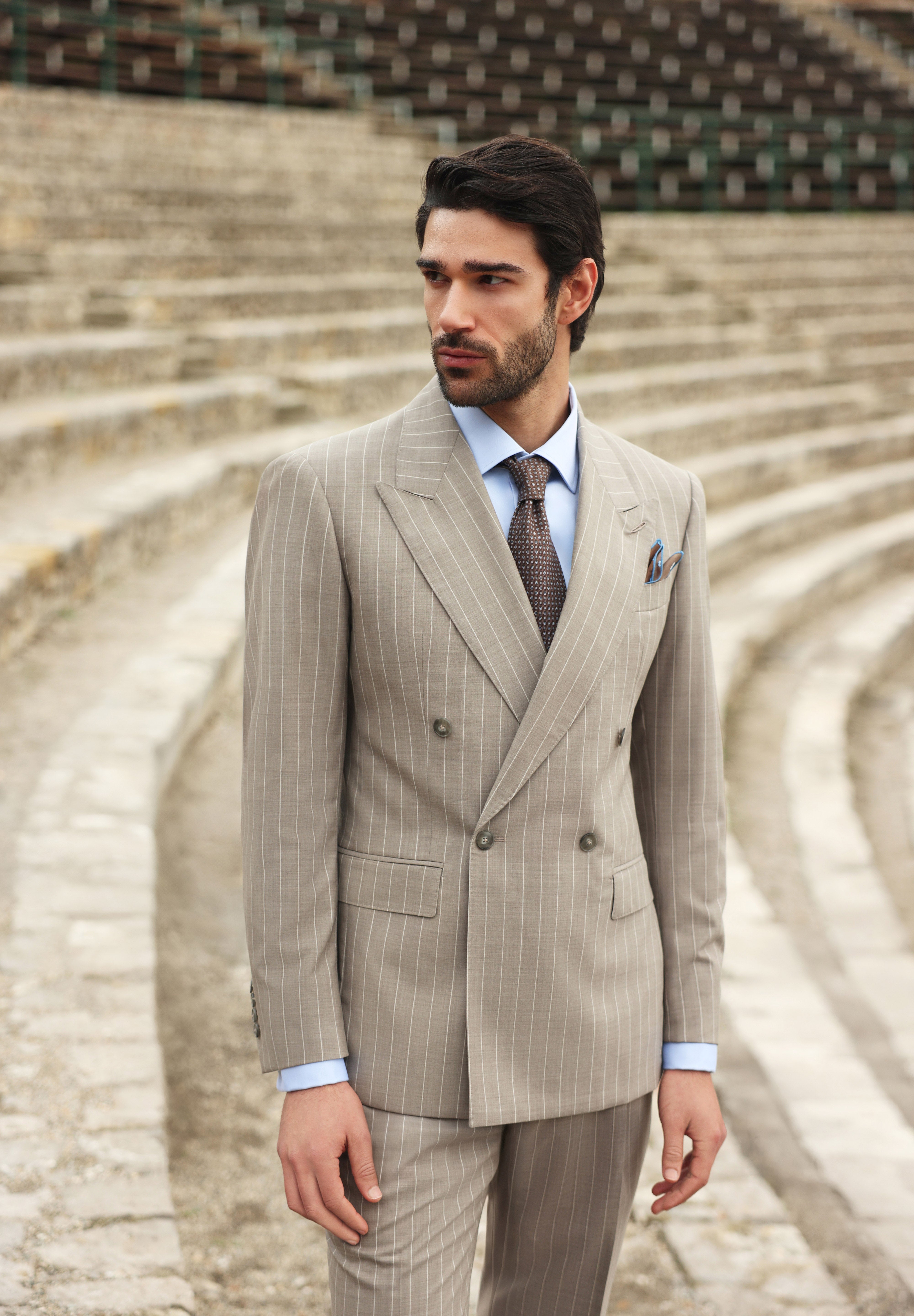 Este realizat dintr-o țesătura fină, 100% lână virgină de la renumita țesătorie Vitale Barberis, într‑o nuanță caldă nisipie, cu subtile dungi albe care adaugă verticalitate, subliniind înălțimea siluetei. Lâna fină Vitale Barberis asigură o respirabilitate optimă, o cădere fluidă și o rezistență naturală la șifonare.