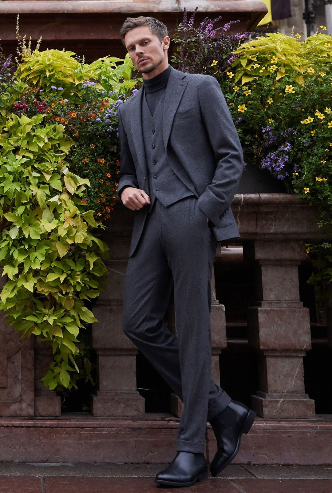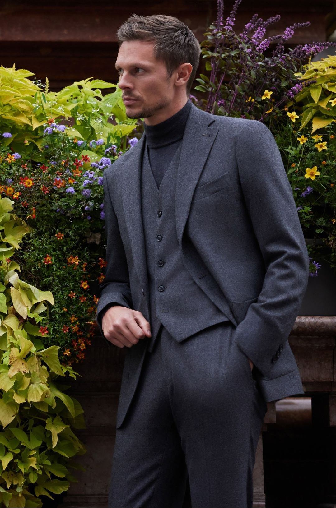 Un costum ce pare sculptat din liniștea unei dimineți de toamnă târzie. Flanela gri, moale și densă, îmbrățișează forma cu noblețe, conferind greutate fiecărui gest și profunzime fiecărui moment.