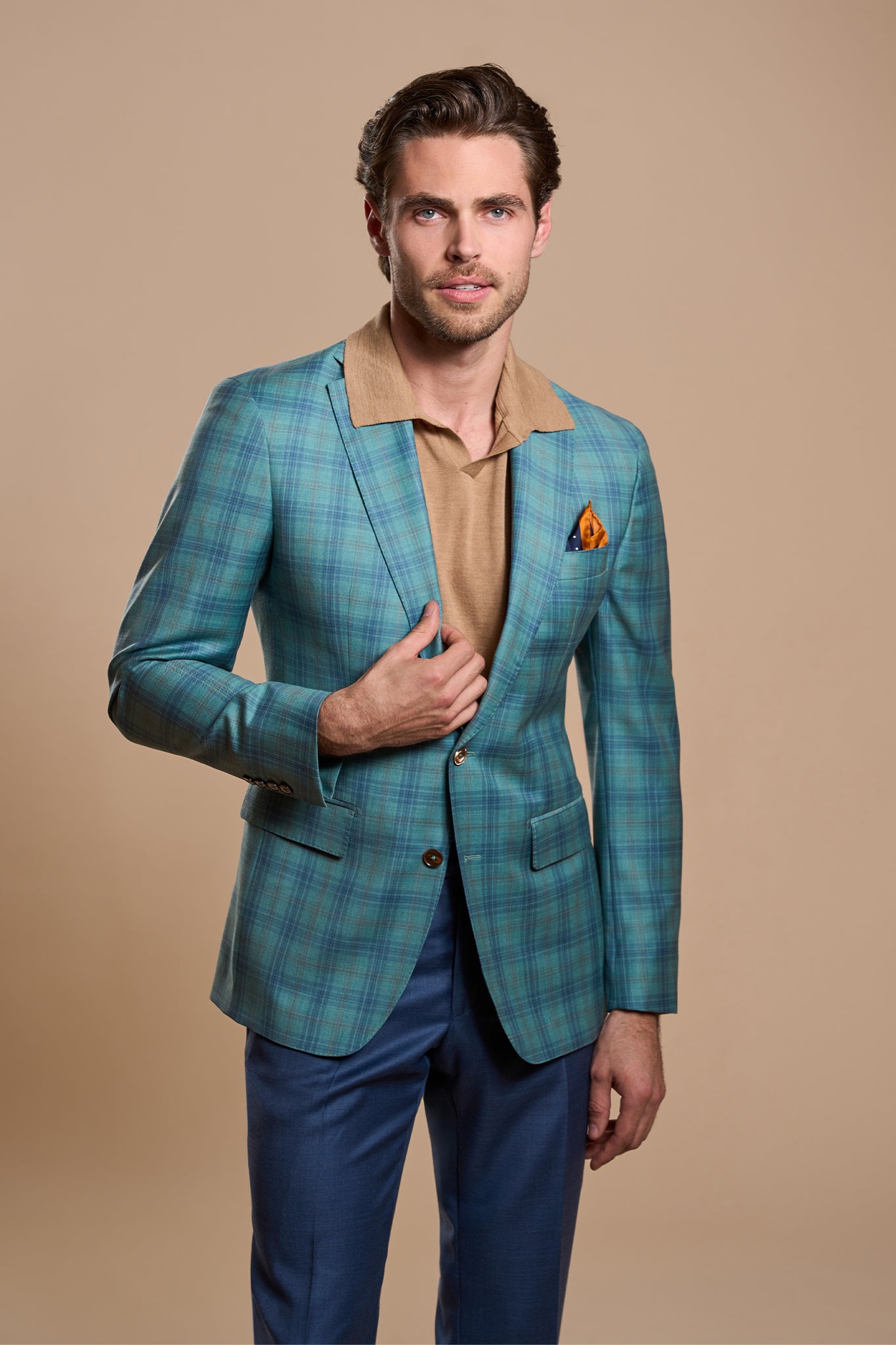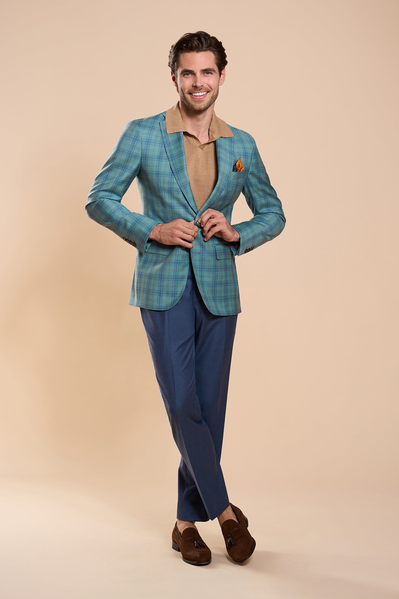 Modelul de un verde în carouri albastre, completate subtil cu bej, al costumului Kalchedon evocă o eleganță atemporală, perfectă pentru bărbatul sofisticat.
