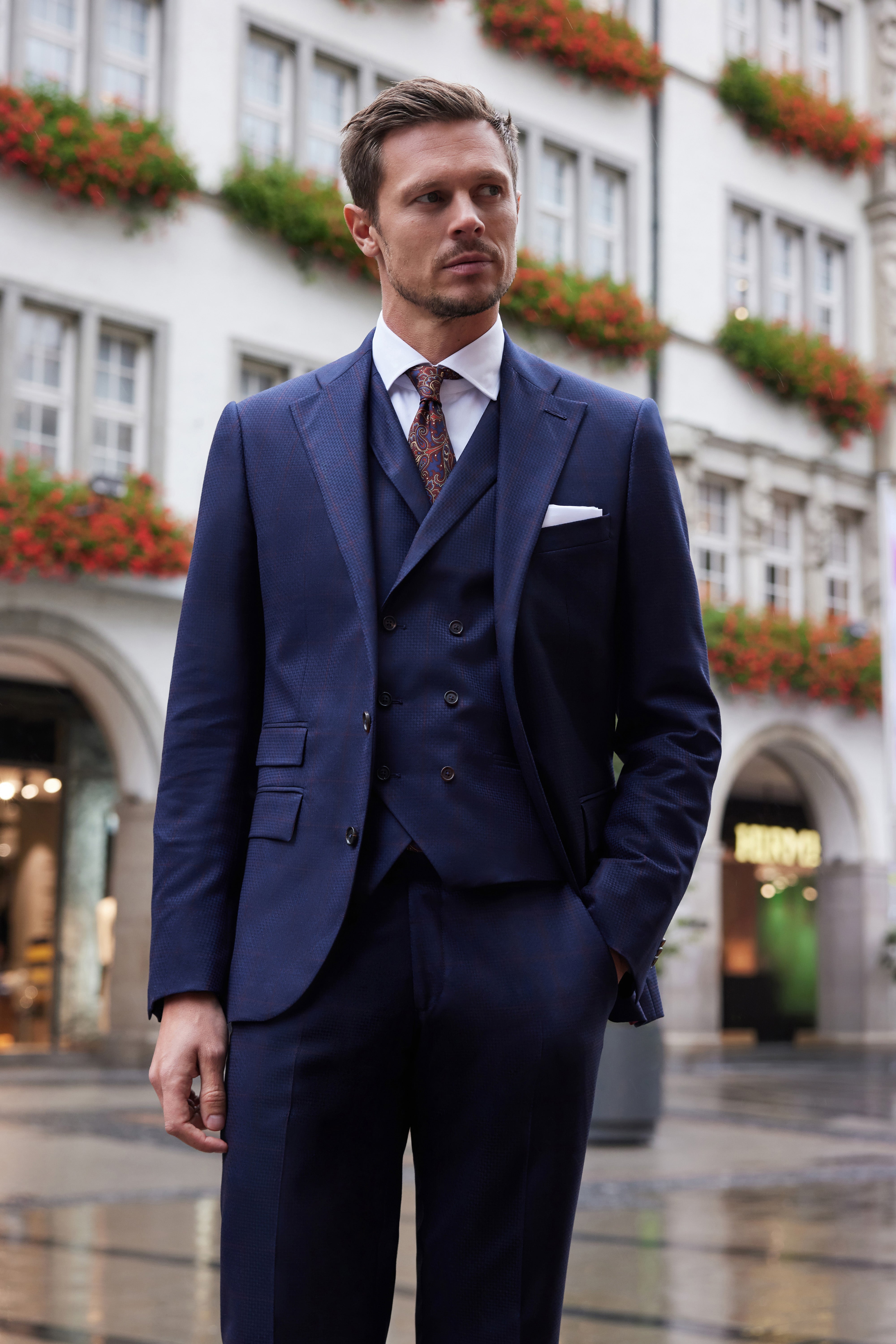 În adâncul lumii urbane, costumul Muse devine un manifest al eleganței artistice. Țesătura de lână și cașmir Scabal, născută din visul artiștilor și meșteșugul maeștrilor, prinde viață într-un joc subtil de carouri ce amintesc de viziunile onirice ale lui Dalí.