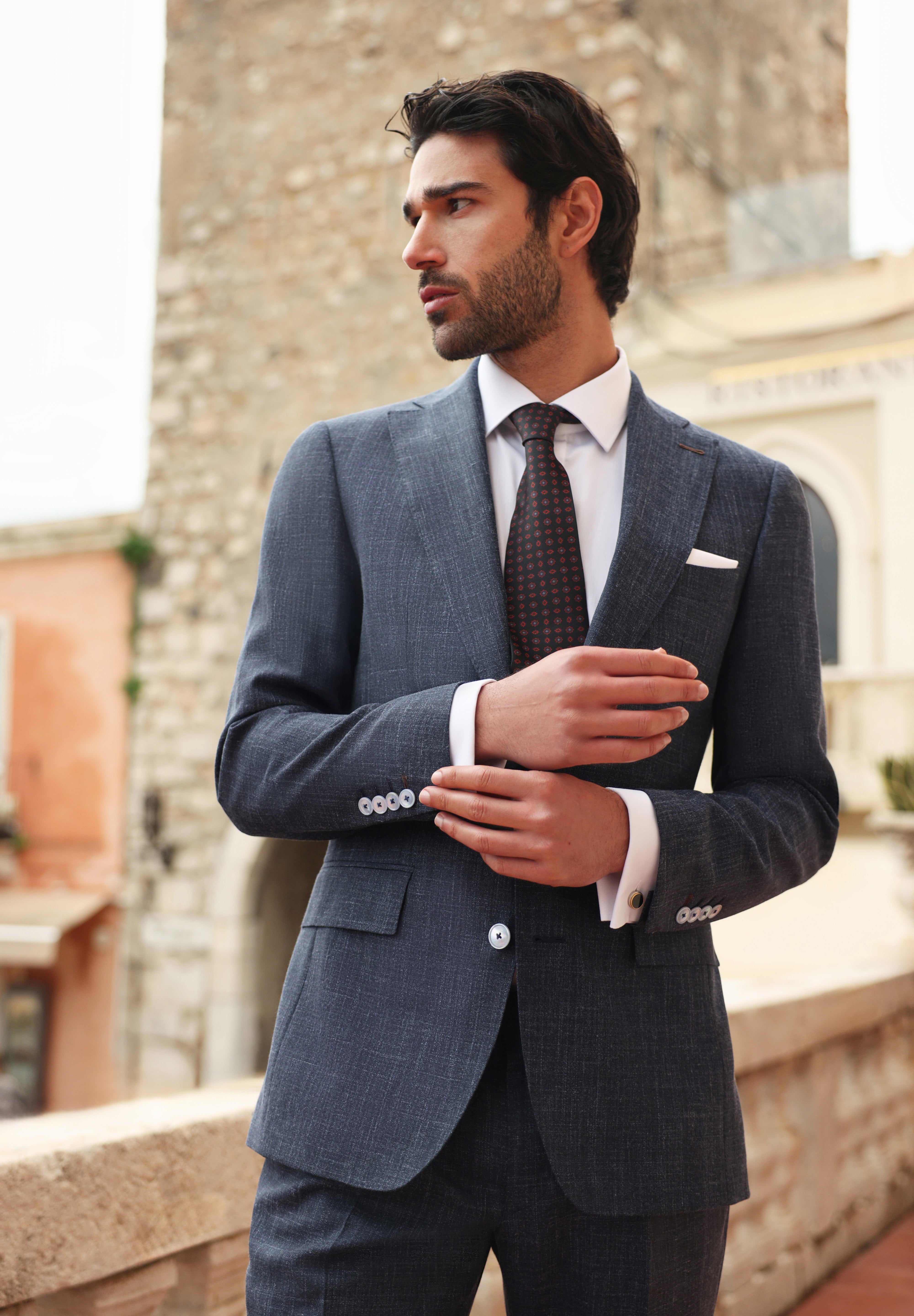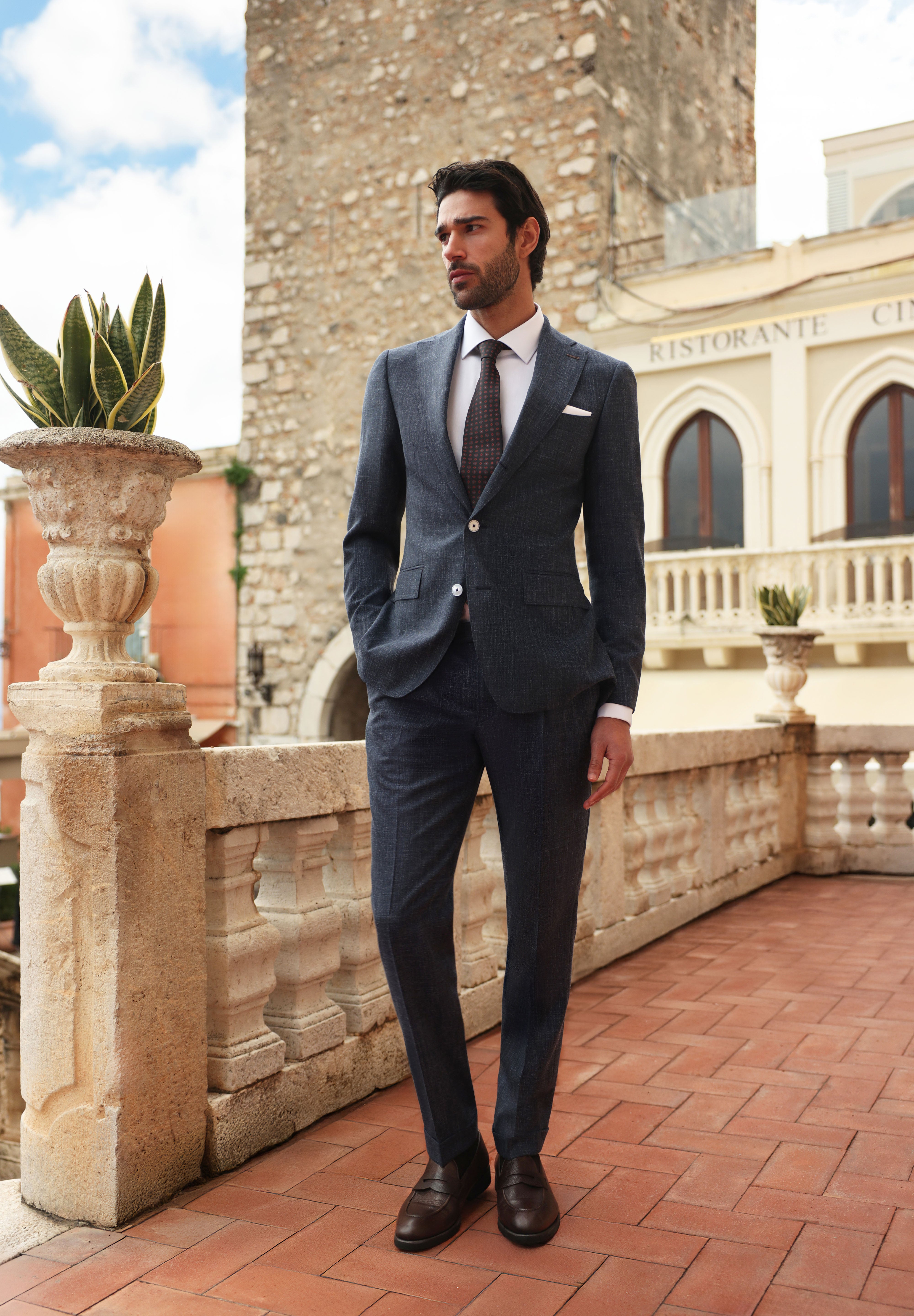 Fotografiile surprinse în inima Italiei, cu priveliști care par să împrumute nuanțele mării și ale cerului cald, întăresc ideea că Syracuse nu este un simplu costum, ci o experiență sartorială completă.