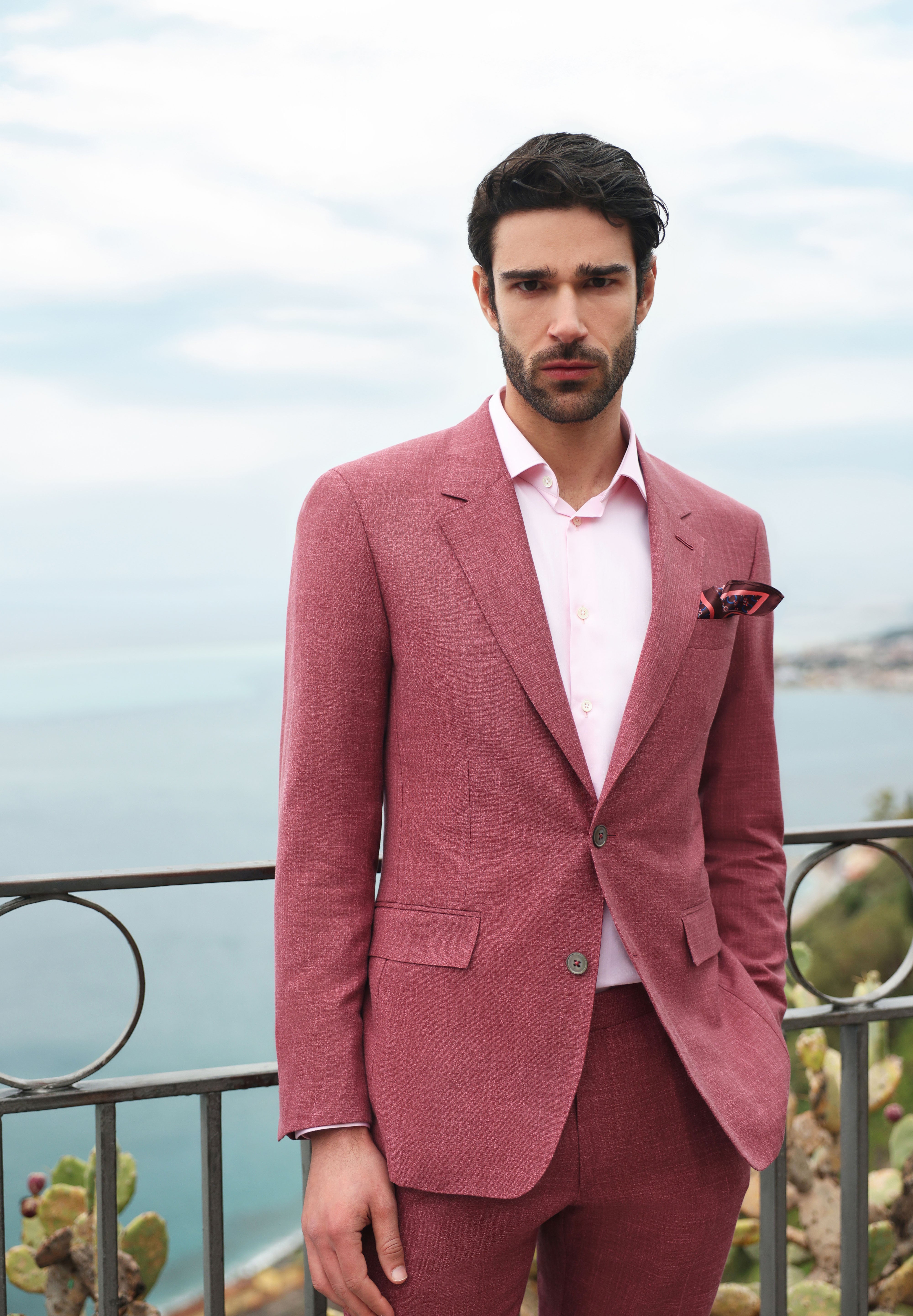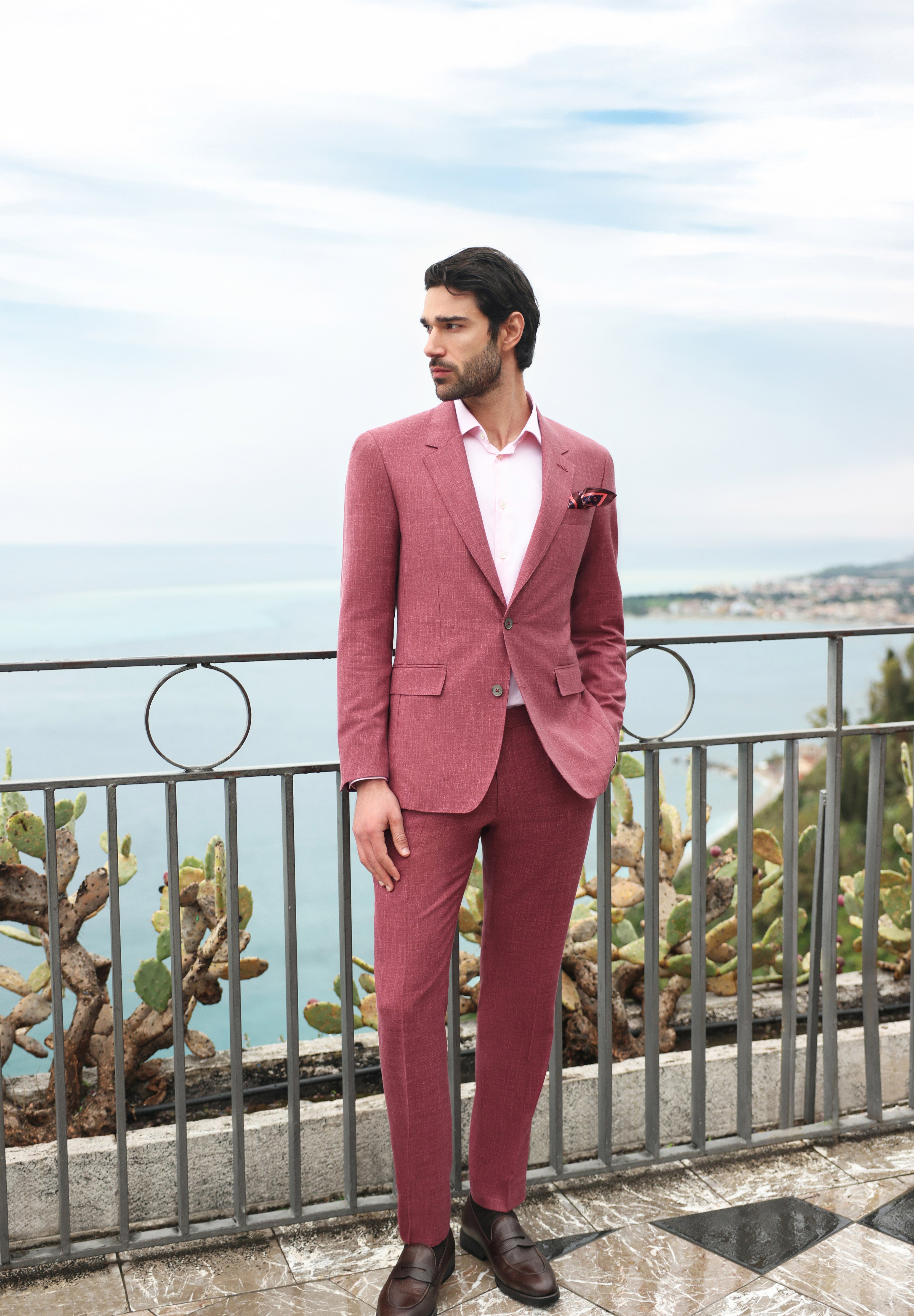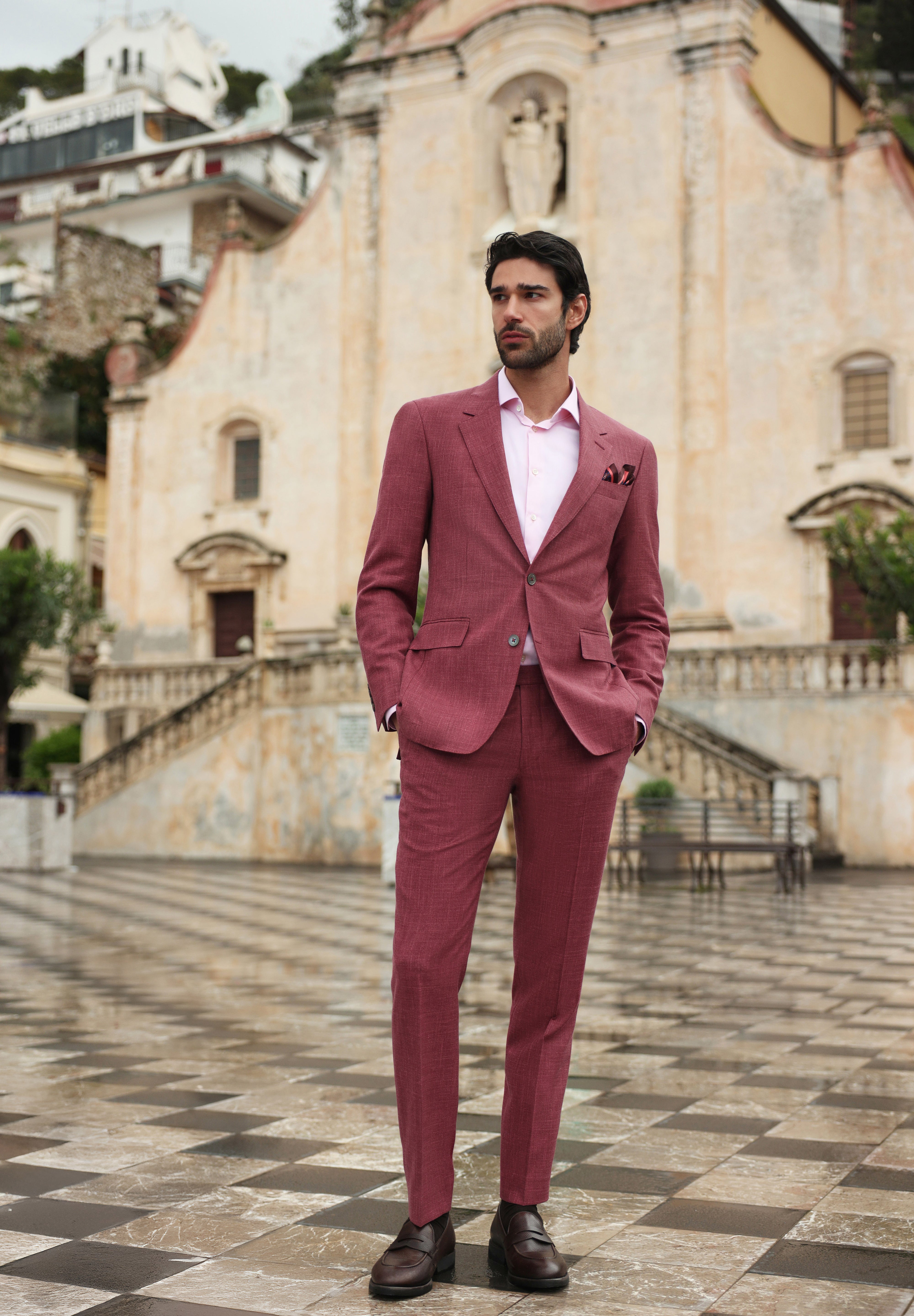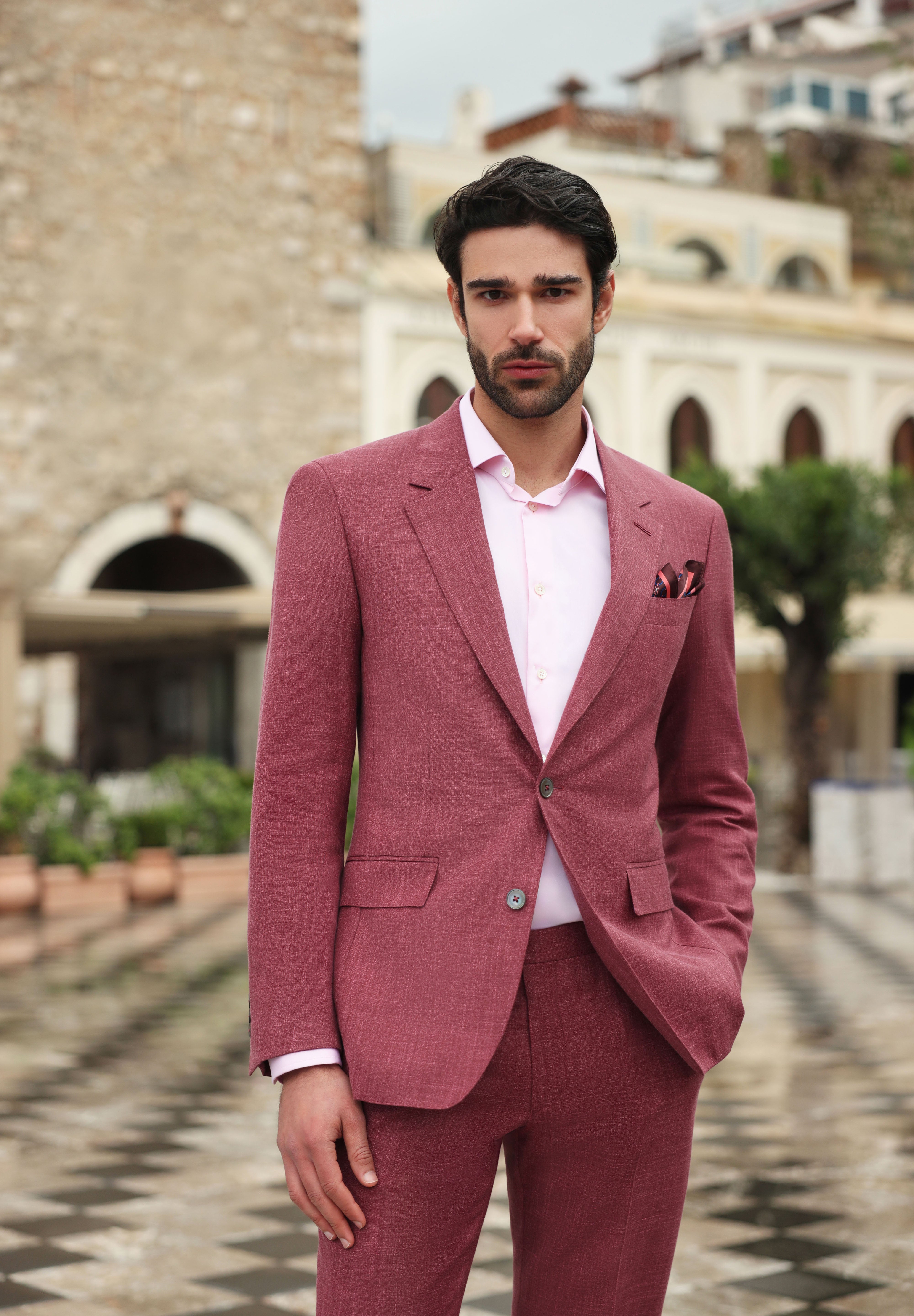 Croiala este modernă, conturând linia corpului cu precizie și naturalețe, iar nuanța profundă de zmeură adaugă un aer sofisticat și ușor seducător. Este un costum creat pentru bărbatul care înțelege puterea detaliului bine ales și care nu se teme să iasă în evidență cu grație.