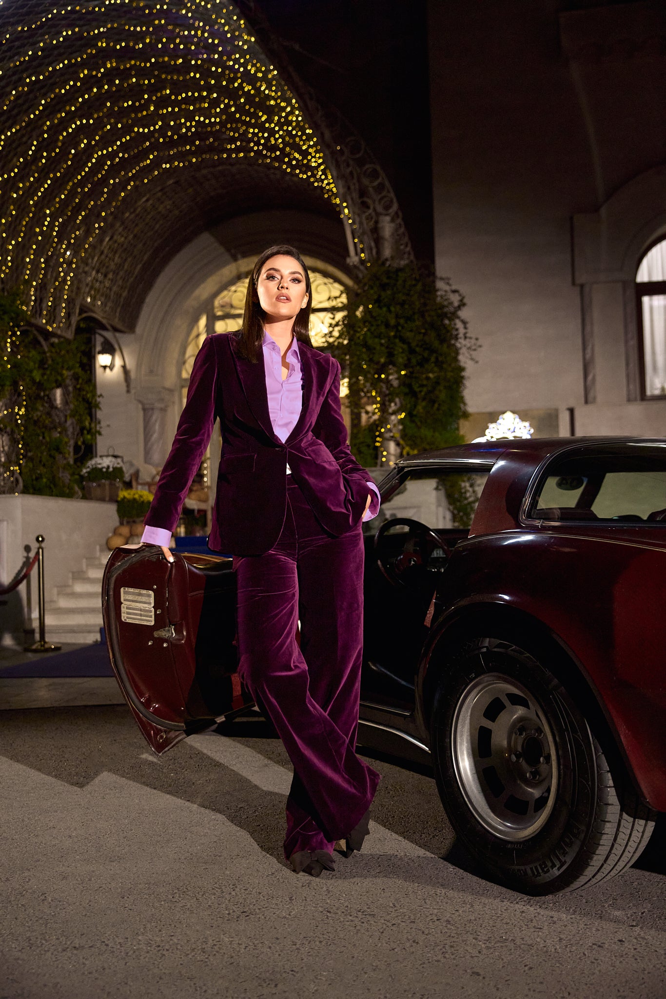 Costumul Purple Velvet din catifea regală, într-o nuanță intensă de mov, este un tribut adus puterii feminine care se exprimă prin rafinament.