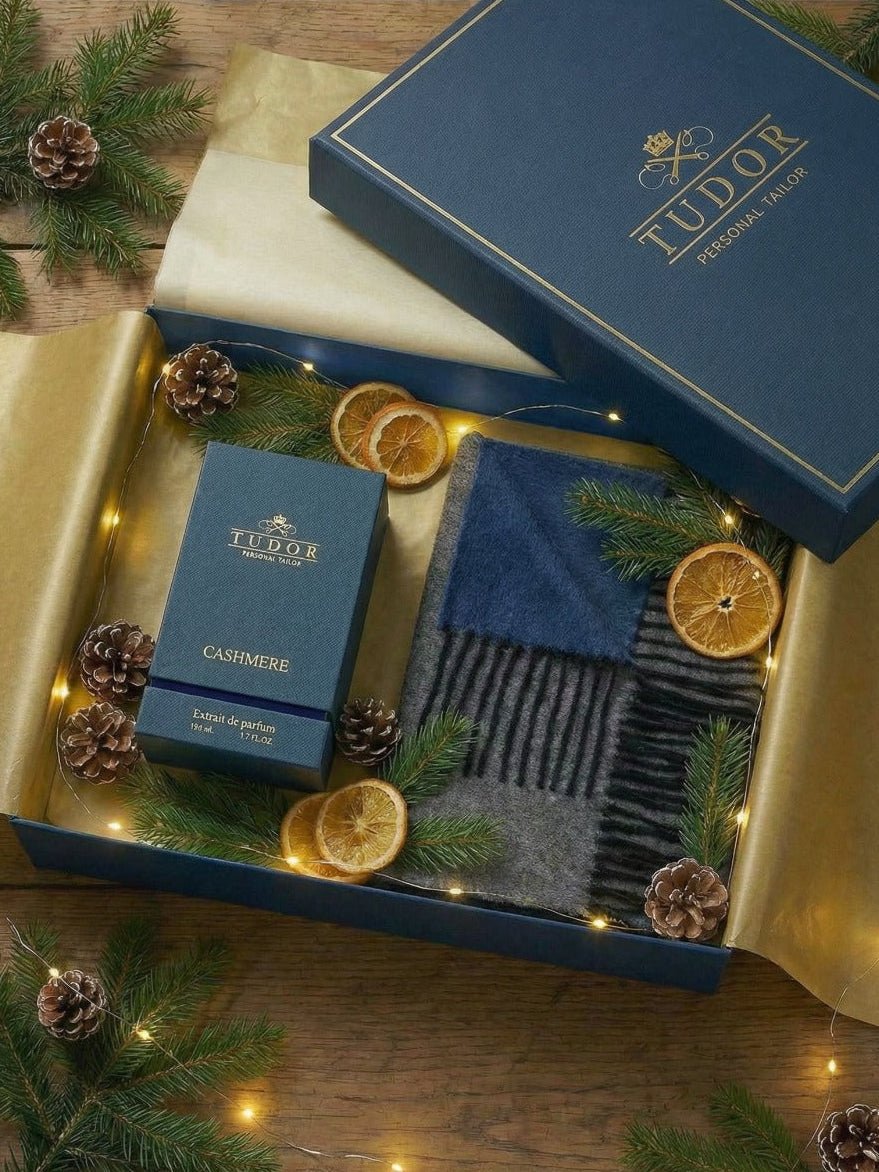 Aceasta este una dintre ele, și include un fular țesut dintr-un amestec nobil de cașmir și mătase de la renumita casă Piacenza, și o esență de parfum Tudor Tailor, care îmbracă pielea ca o țesătură fină de cașmir, cu note luminoase și calde.
