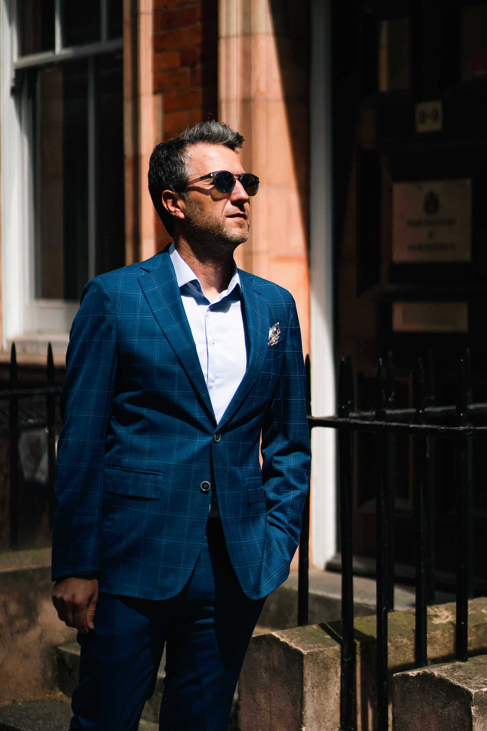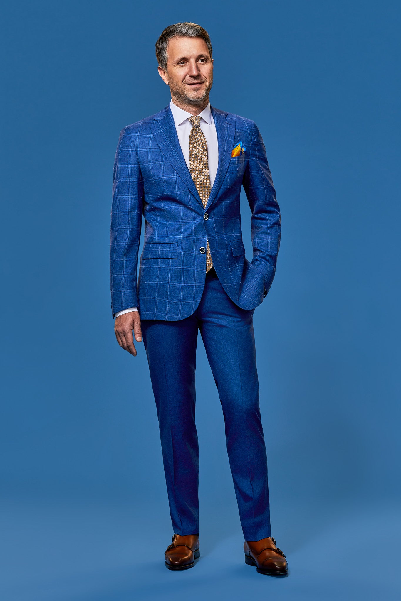 Ținuta NAUTILUS are ca piesă principală un sacou albastru cu carouri duble în contrast, prin care eleganța și îndrăzneala purtătorului vor fi plăcut remarcate.