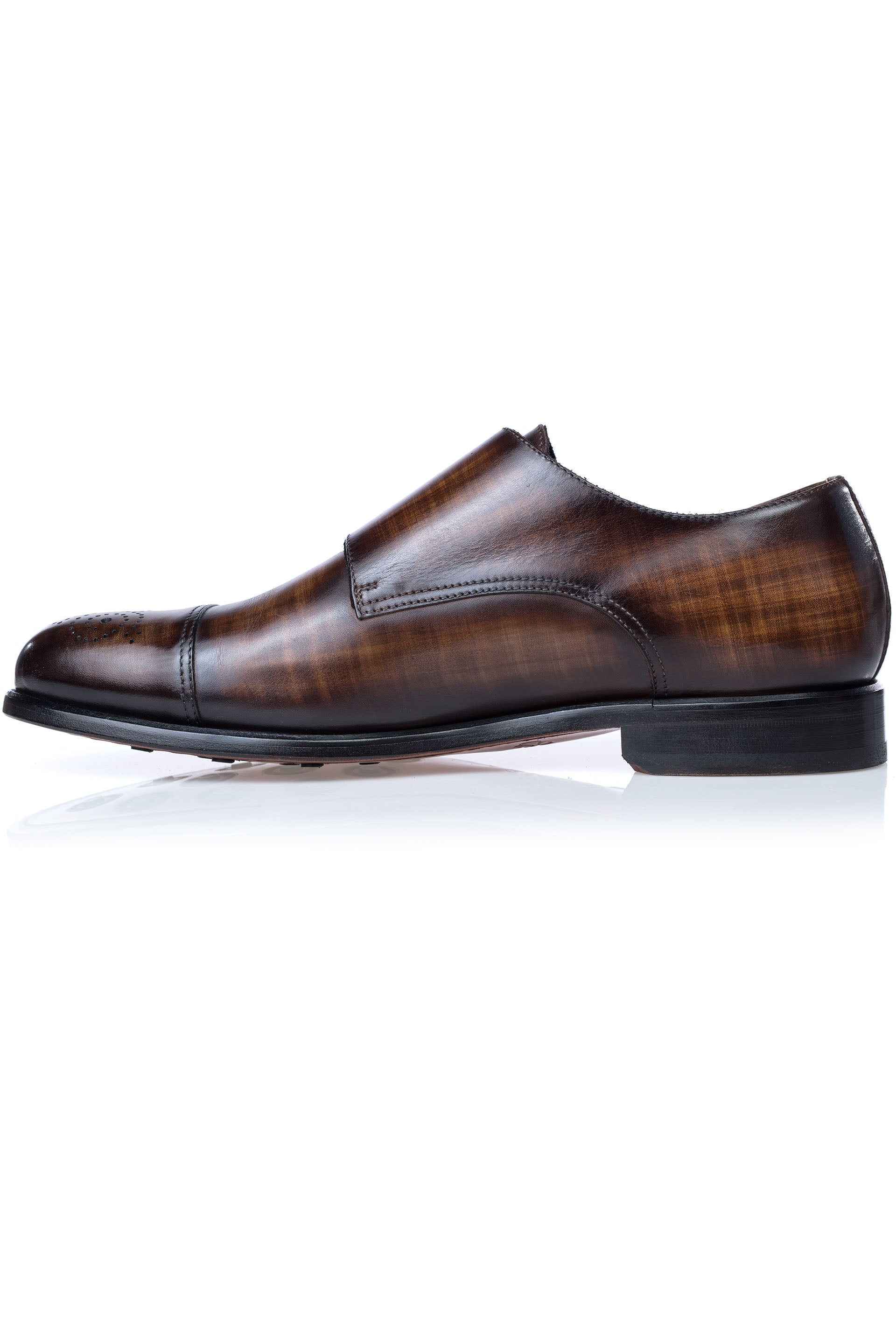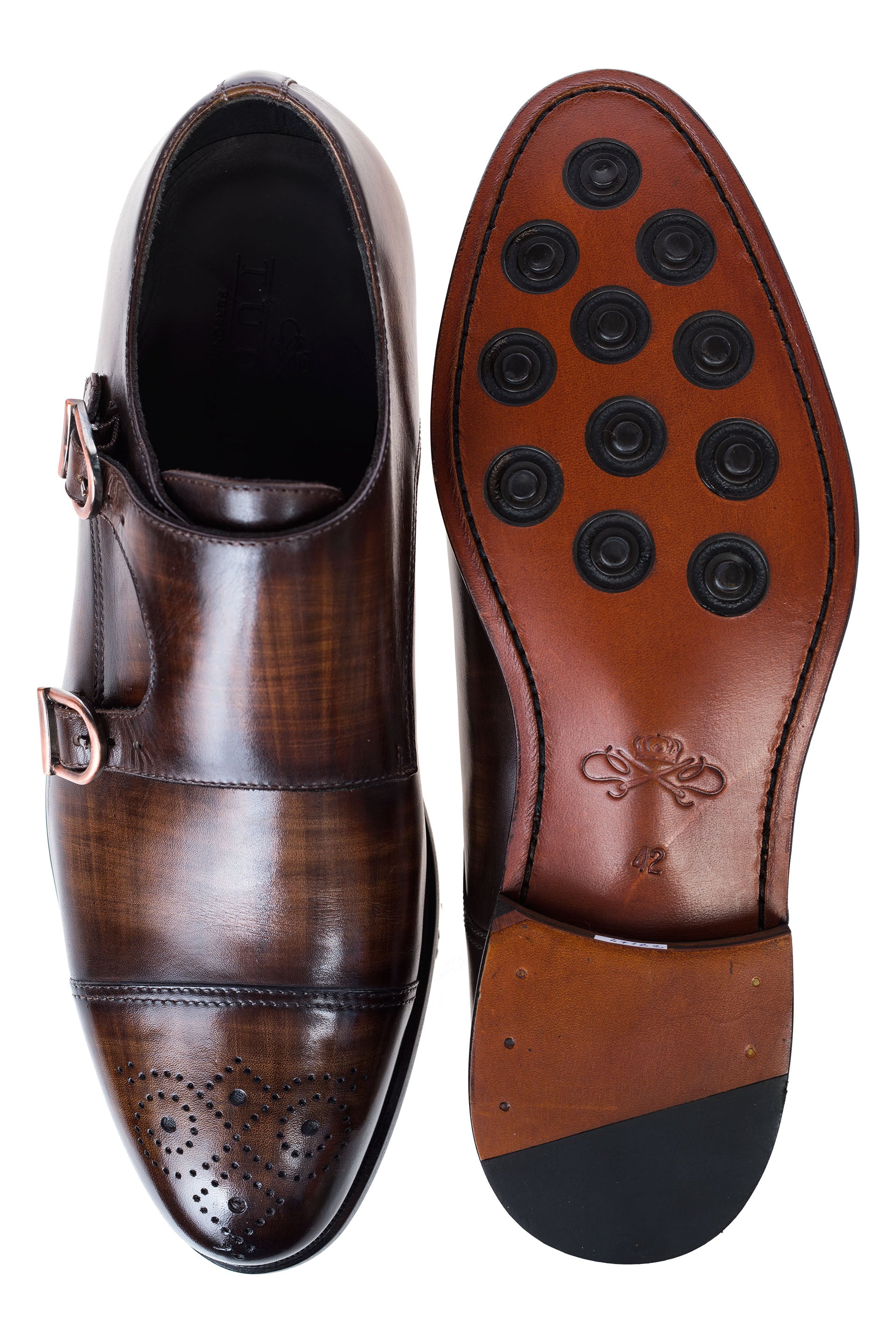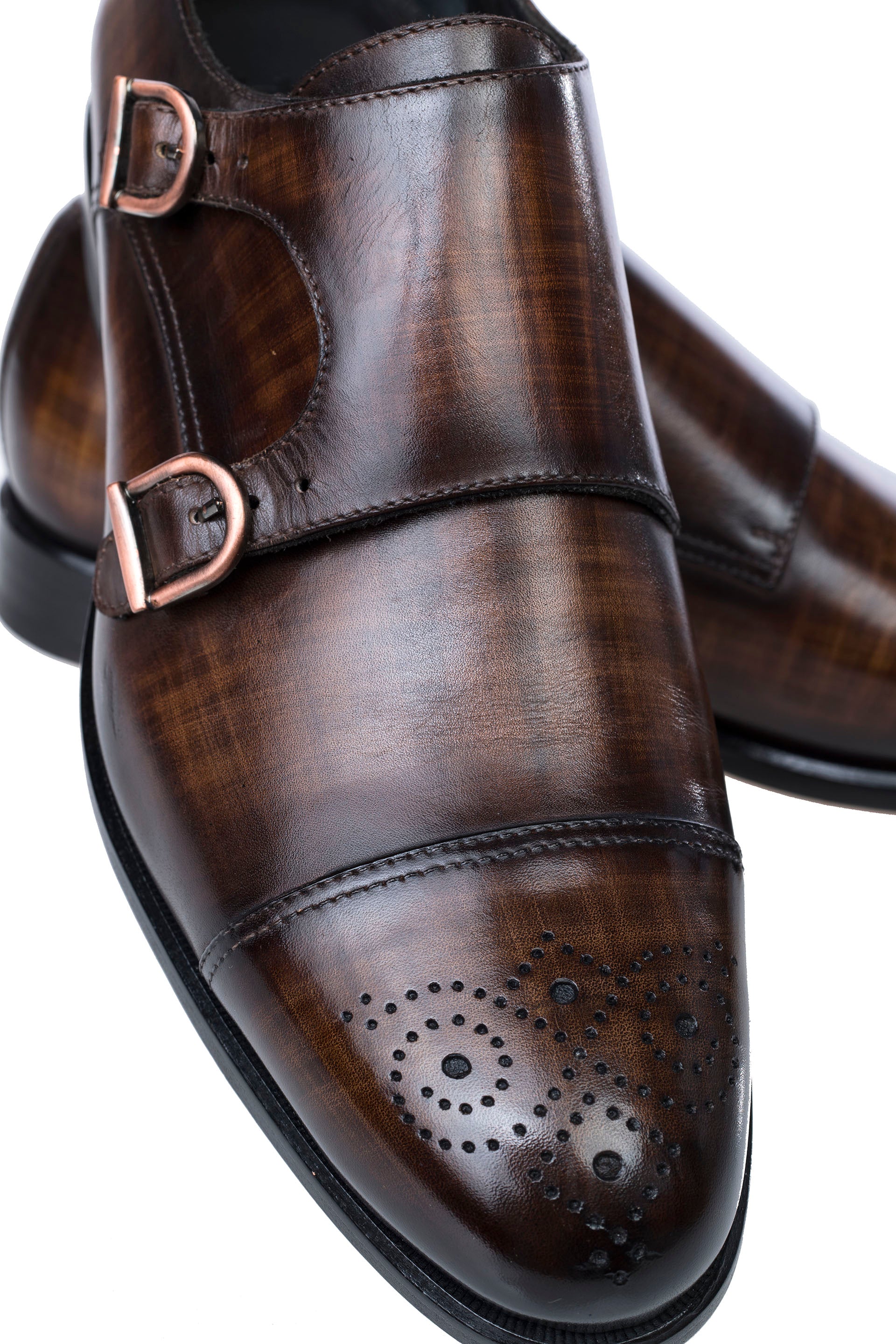 Pantofii Double-Monk Galahad, patinati de culoare maro sunt alegerea perfecta pentru gentlemanii care vor sa-si evidentieze stilul in societate, acestia fiind brodati pe bombeu si cu un finnish patinat ce confera pantofilor un plus de distinctie si eleganta, complimentele devenind o simpla inertie pentru domnii care ii poarta.