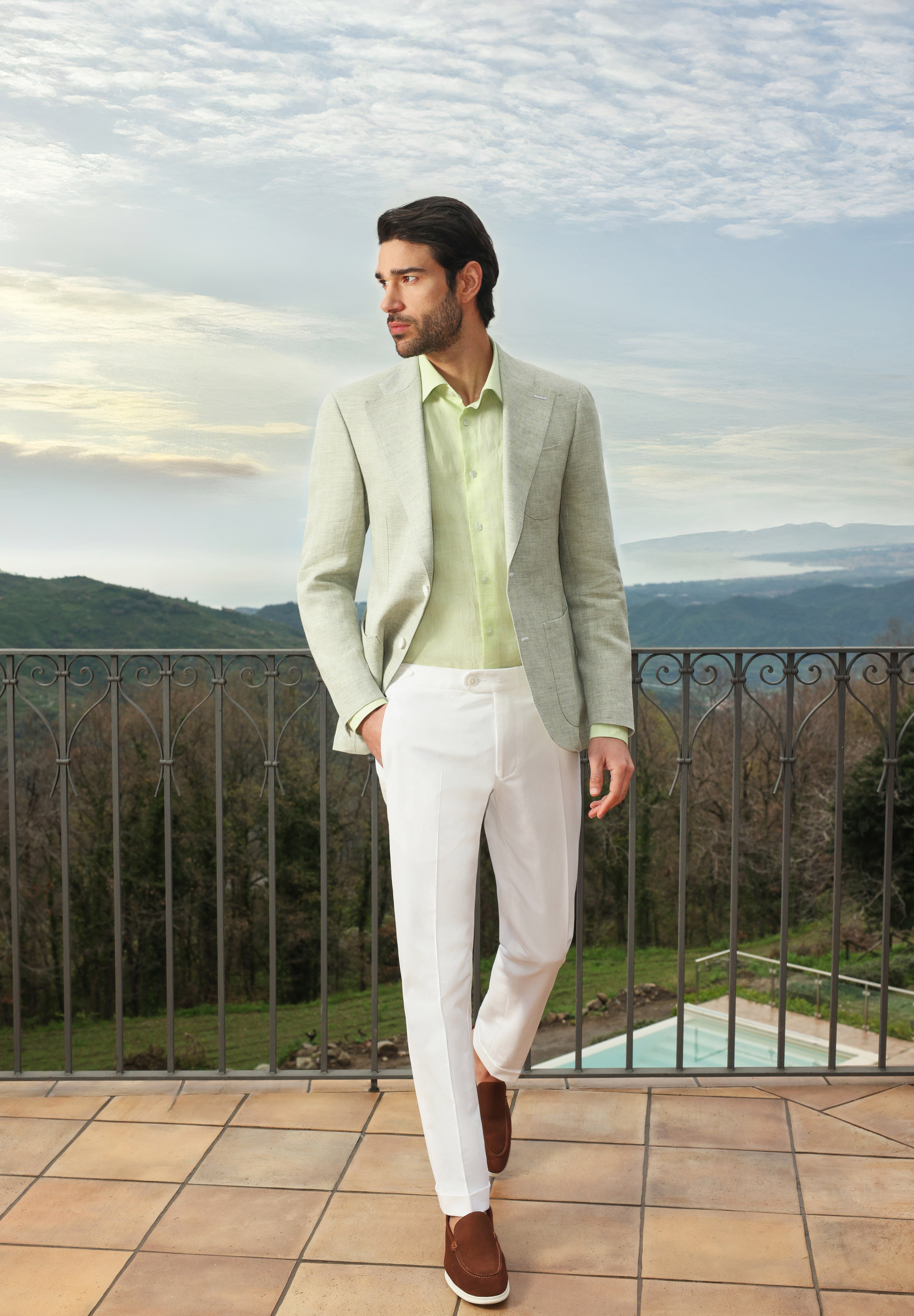 Inspirat de prospețimea brizelor marine și de texturile naturale ale coastei mediteraneene, acest sacou este realizat dintr-un blend rafinat de in și lână provenit de la renumita țesătorie italiană Drago.