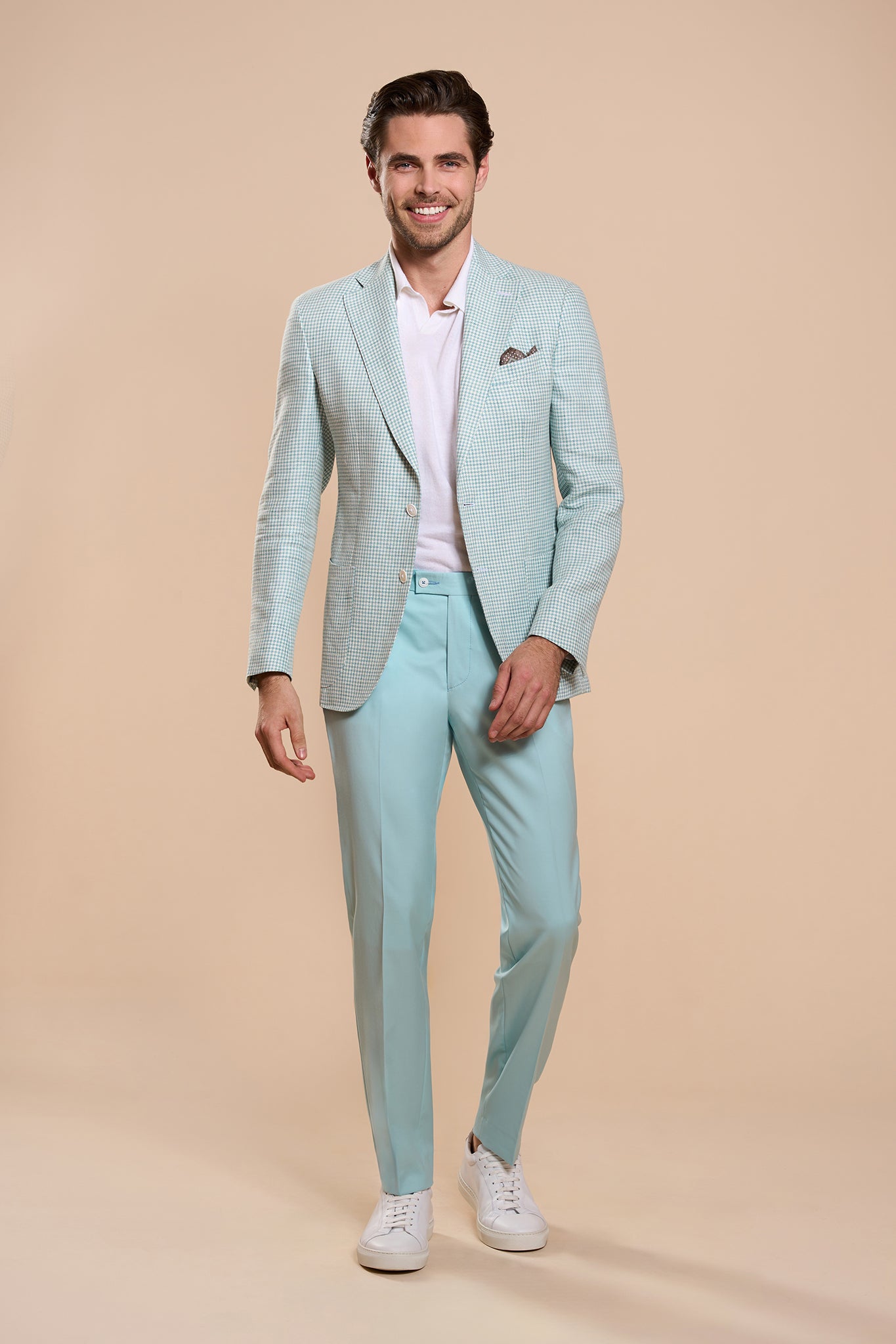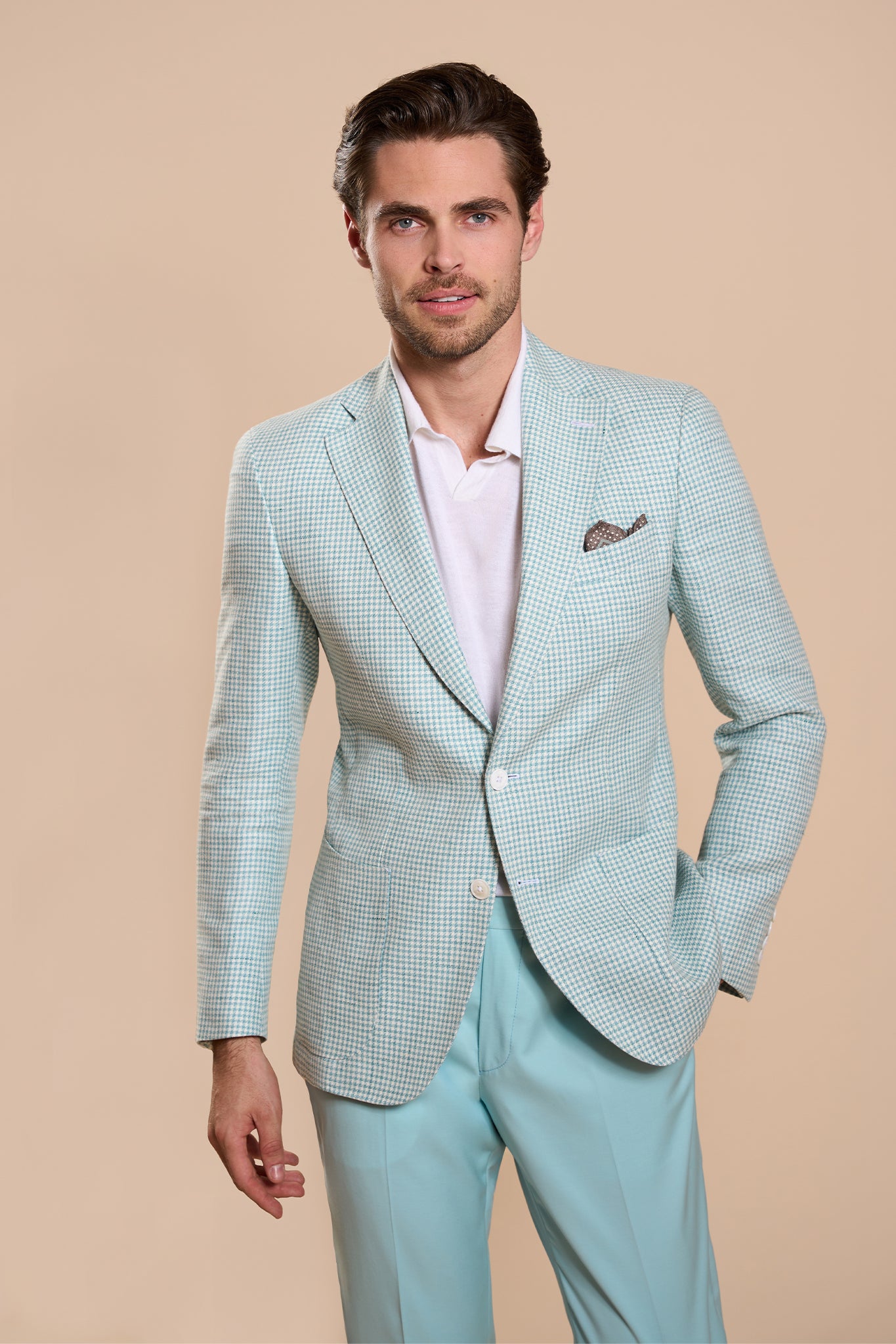 Sacoul Amastris se distinge printr-o nuanță rafinată de alb-mint, combinată cu un model clasic houndstooth. Confecționat dintr-o țesătură mixtă de lână și in, acest sacou oferă o respirabilitate excelentă și un confort superior, perfect pentru sezonul cald.