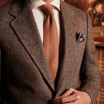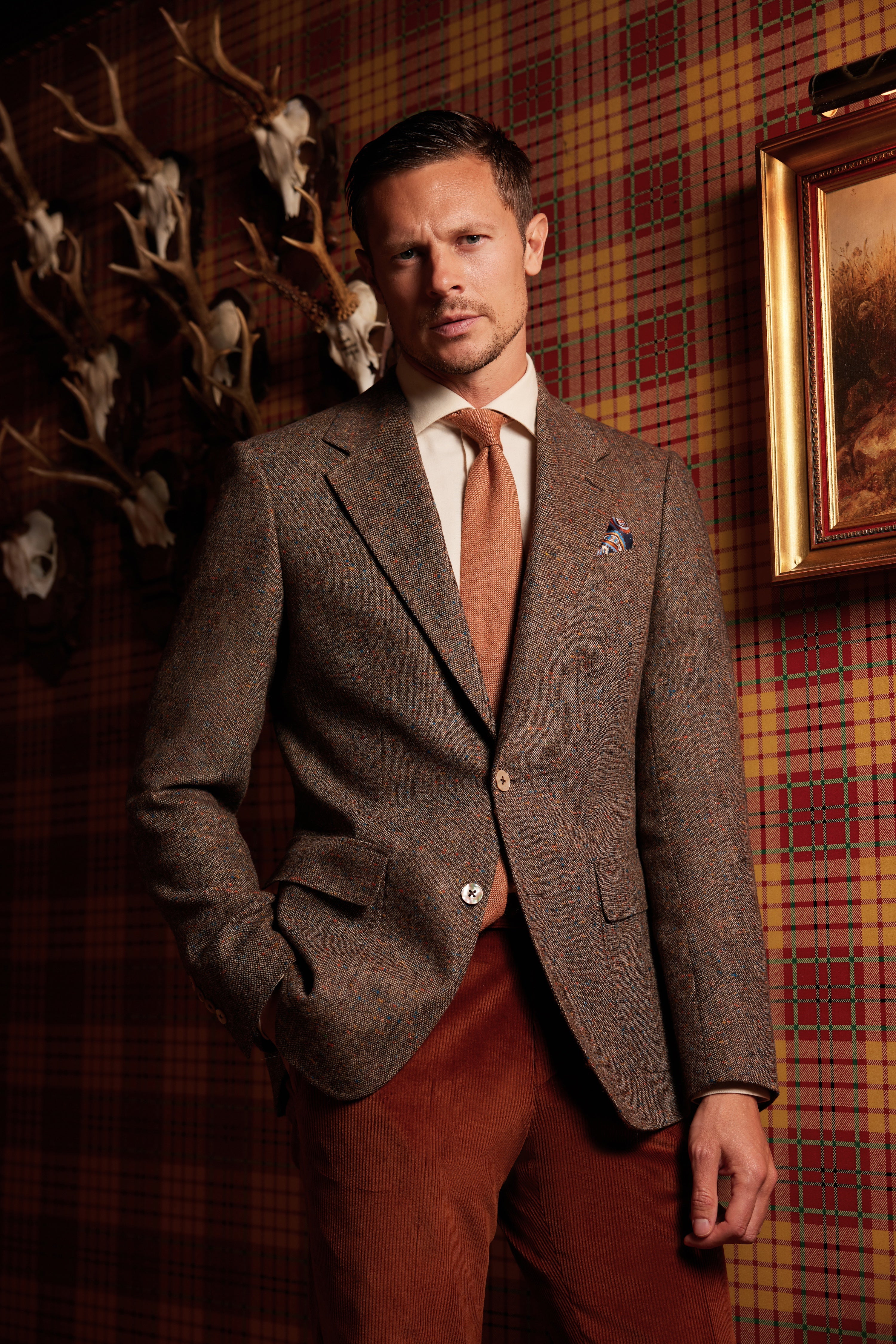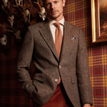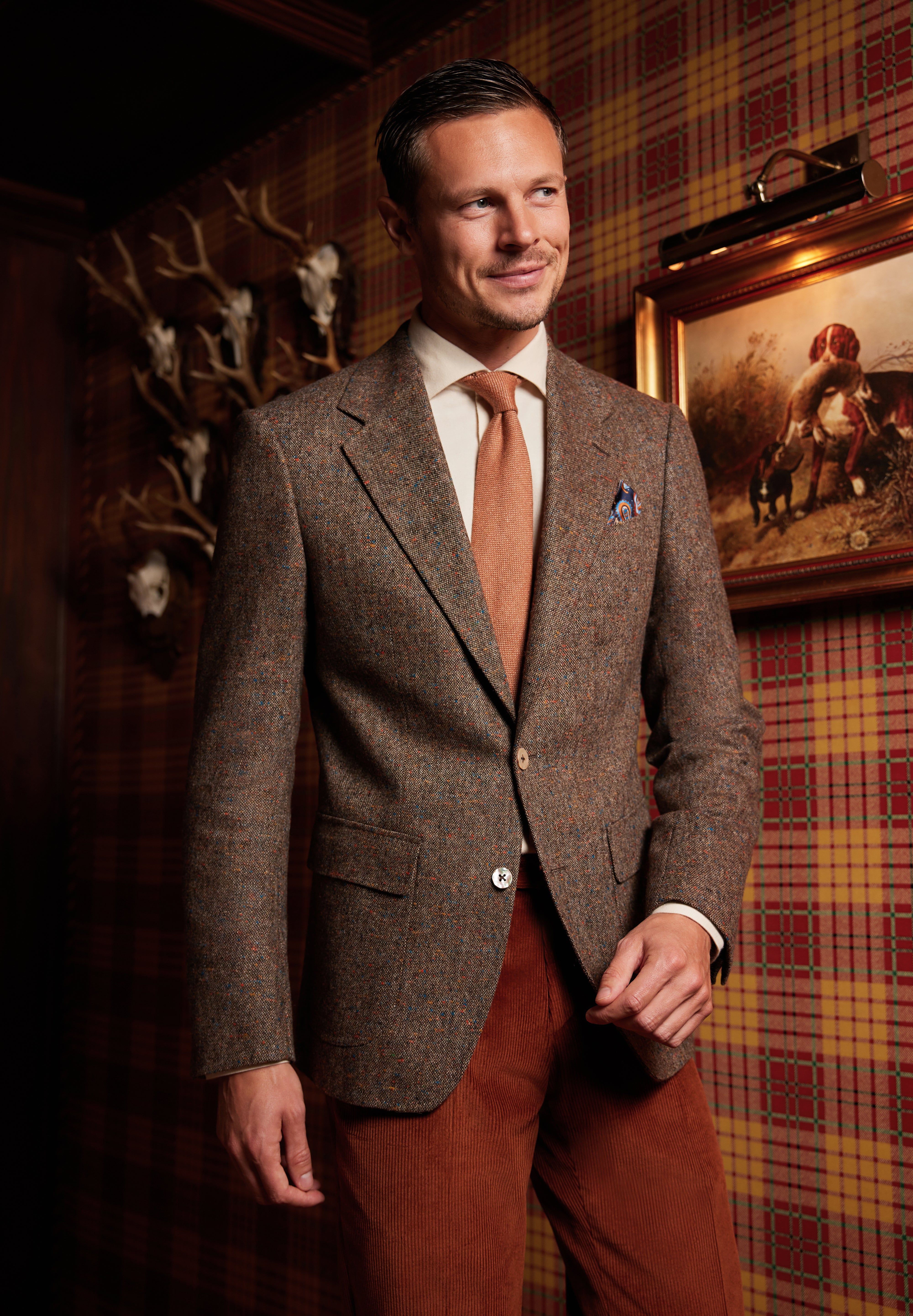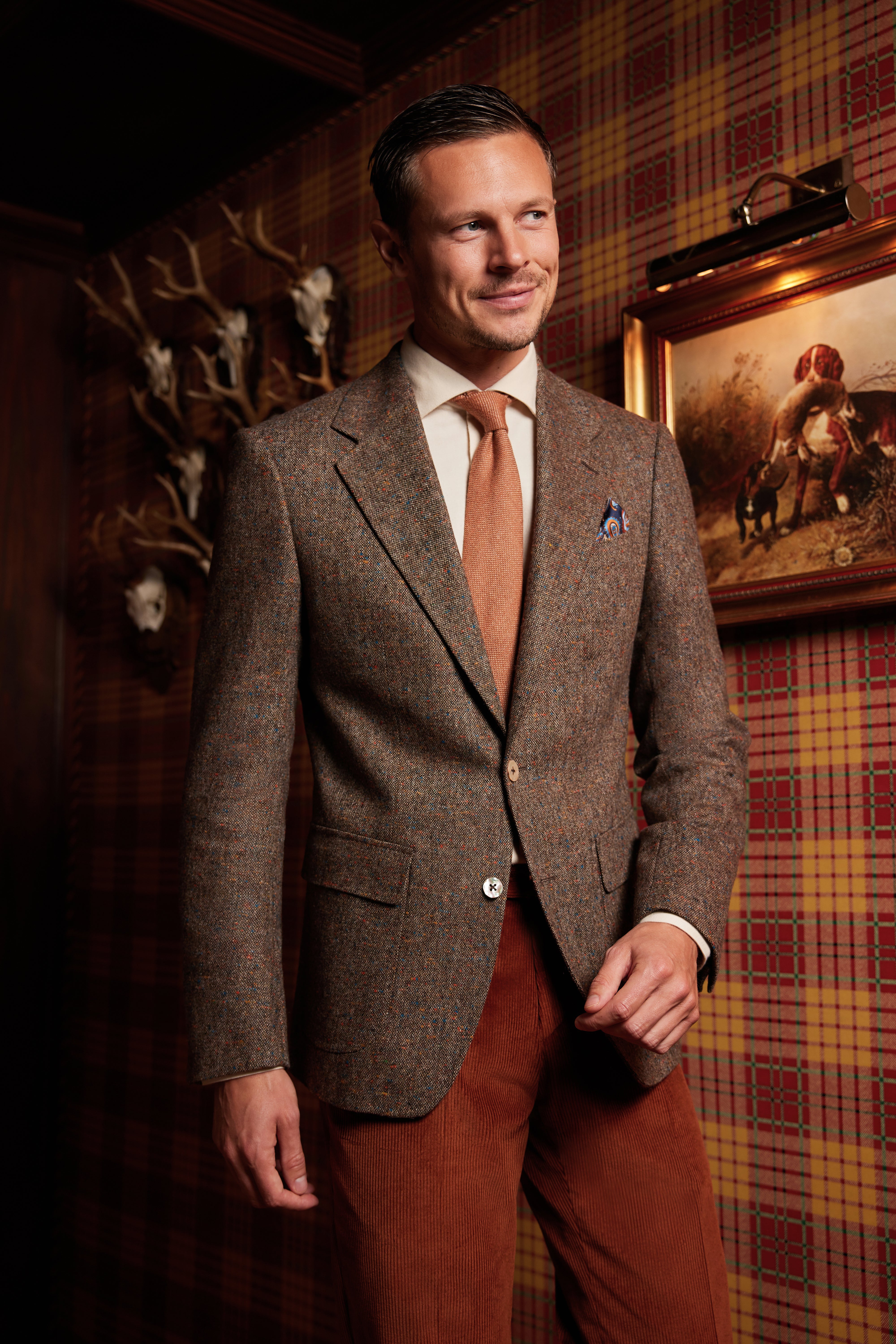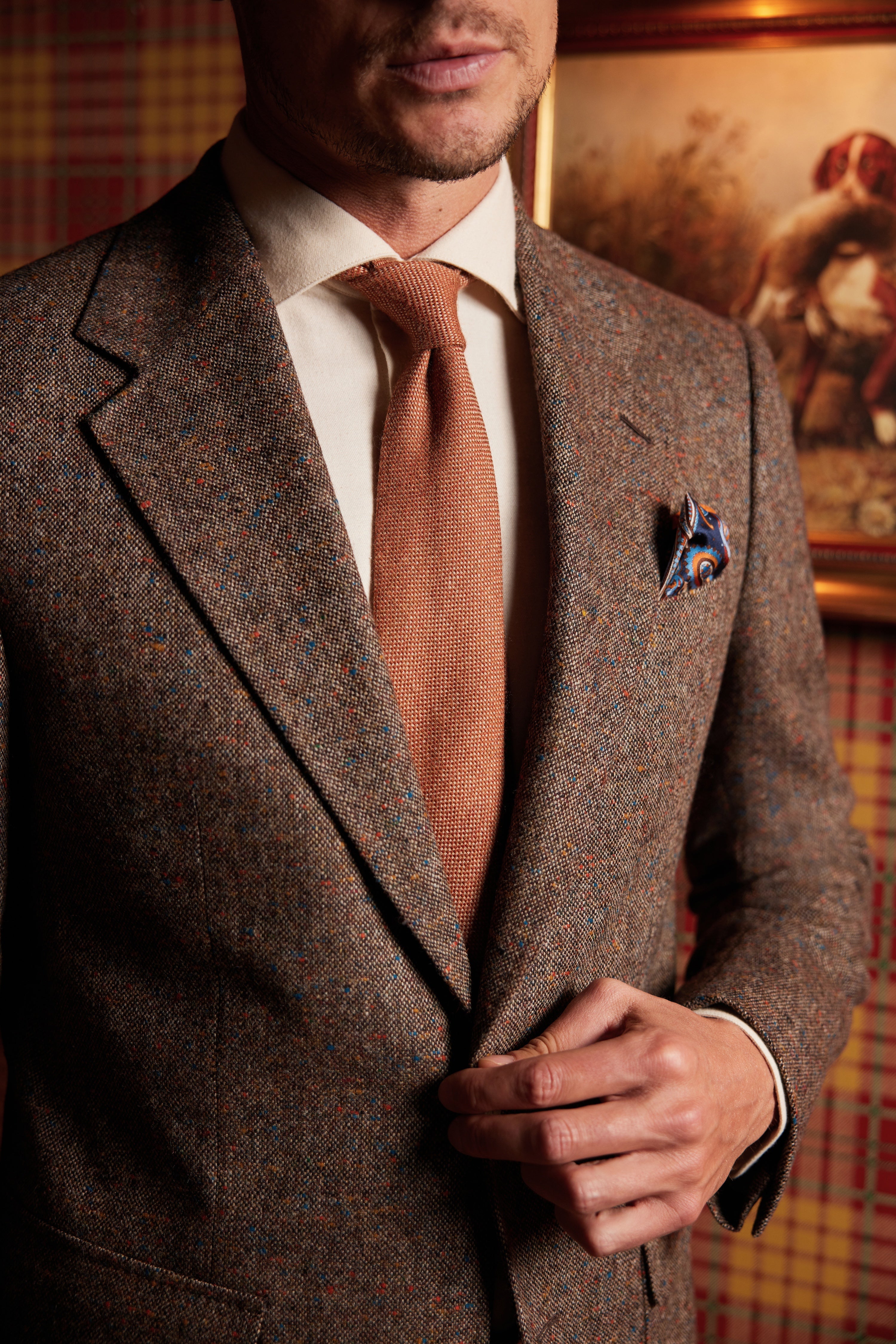 Textura bogată a tweedului din lână 100%, cu inserții coloristice discrete, în nuanțe de cupru, pământ și verde pădure, aduce profunzime și căldură unei croieli clasice. O piesă autentică, născută din peisajele aspre ale Irlandei și adaptată ritmului rafinat al vieții moderne.