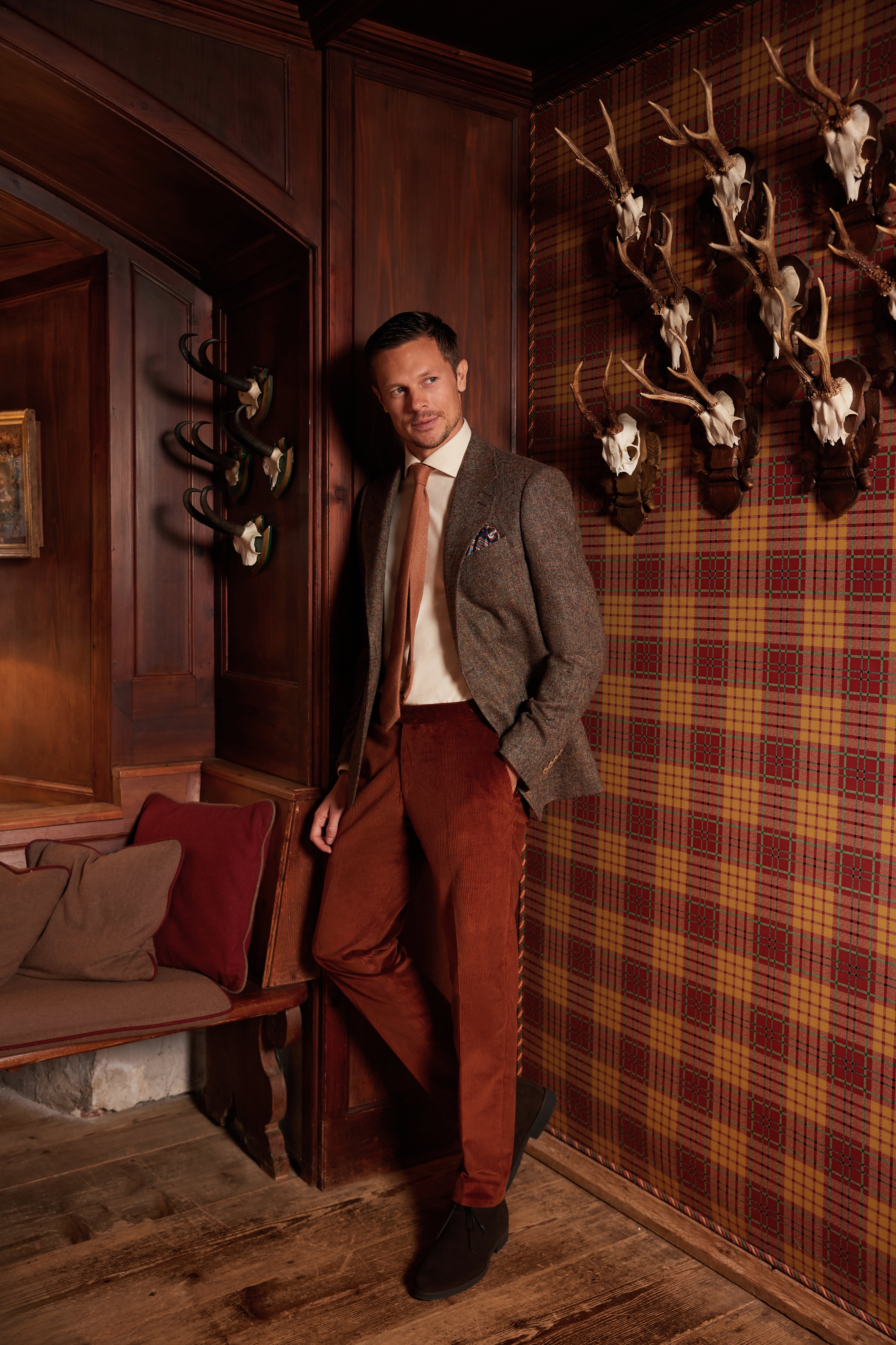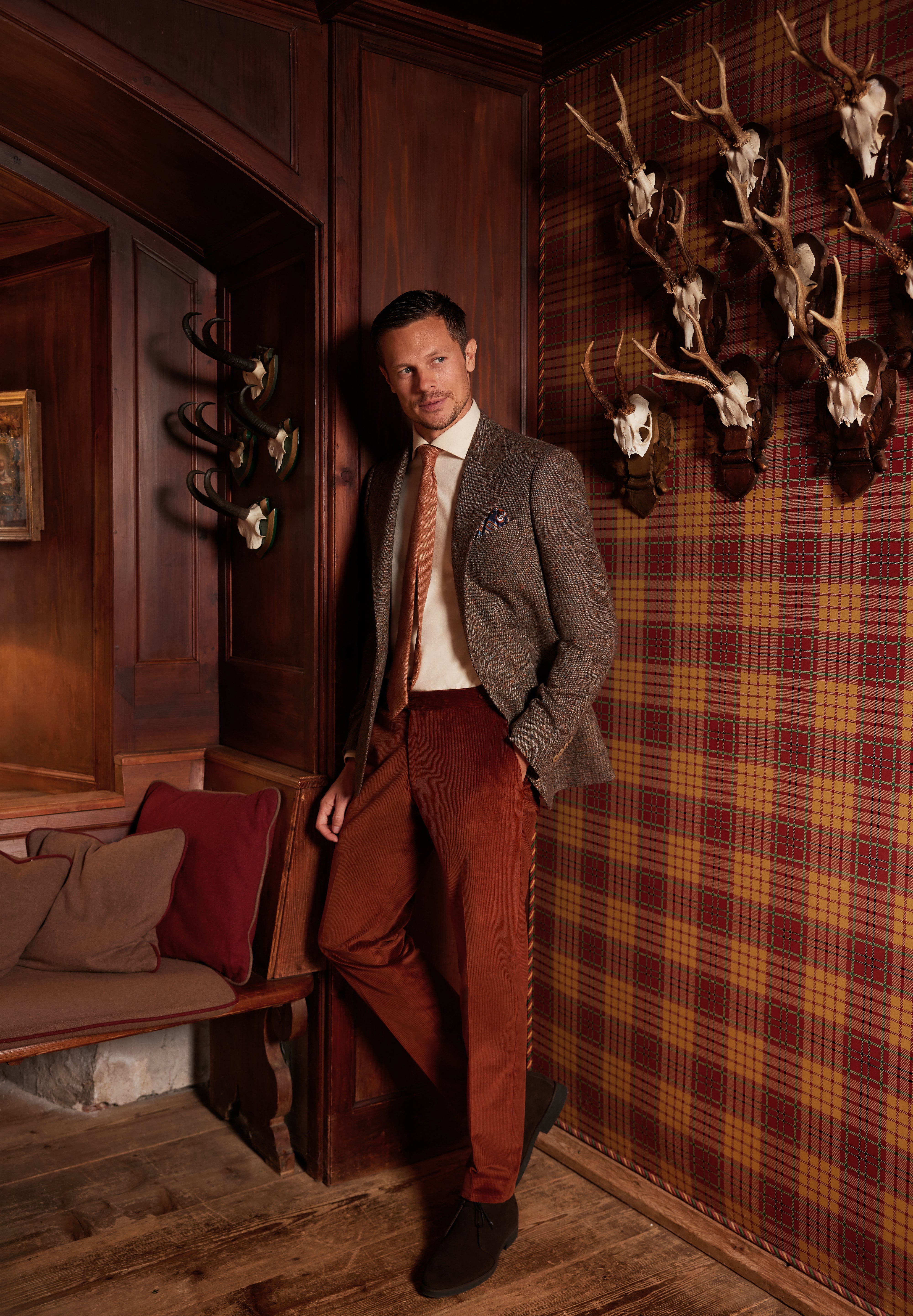 * Pantalonii din catifea reiată fină (corduroy) de la celebra țesătorie Duca Visconti, într-o nuanță caldă de scorțișoară, completează ansamblul cu un aer de confort sofisticat, redând ideea de lux care se trăiește, nu doar se poartă.