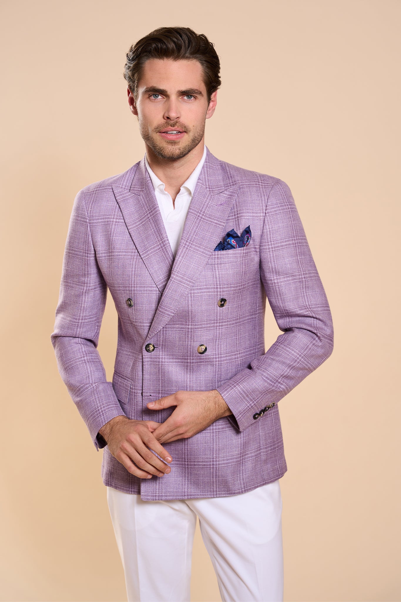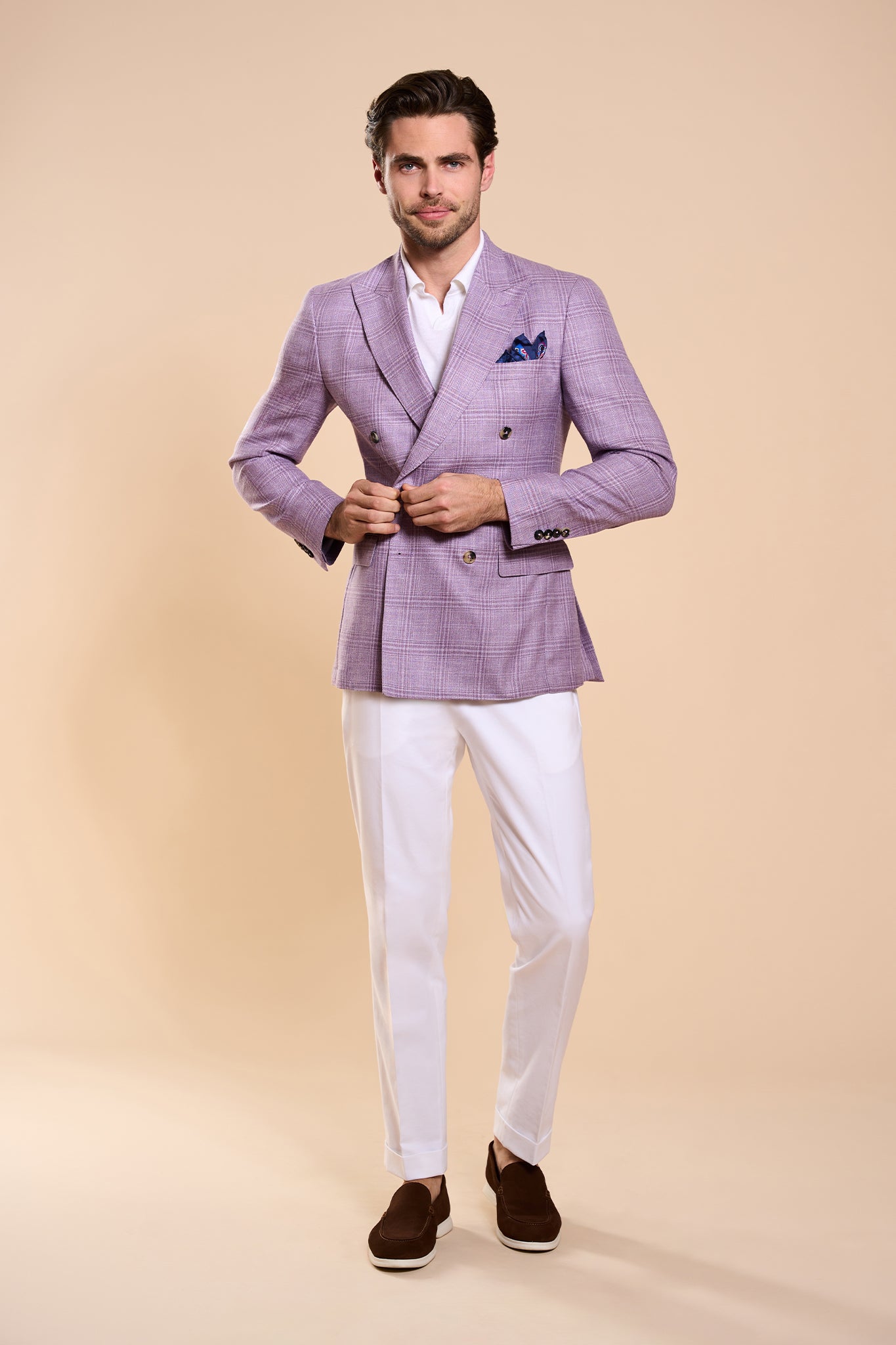 Sacoul Byblus impresionează prin nuanța sa lila sofisticată, completată de un model de carouri subtil.