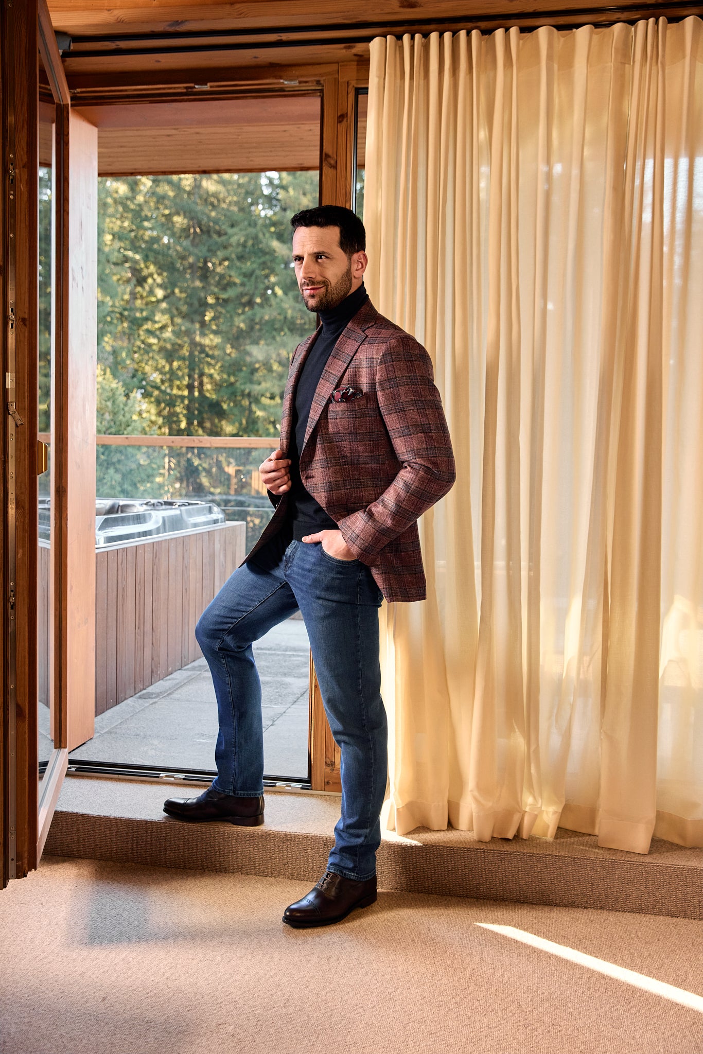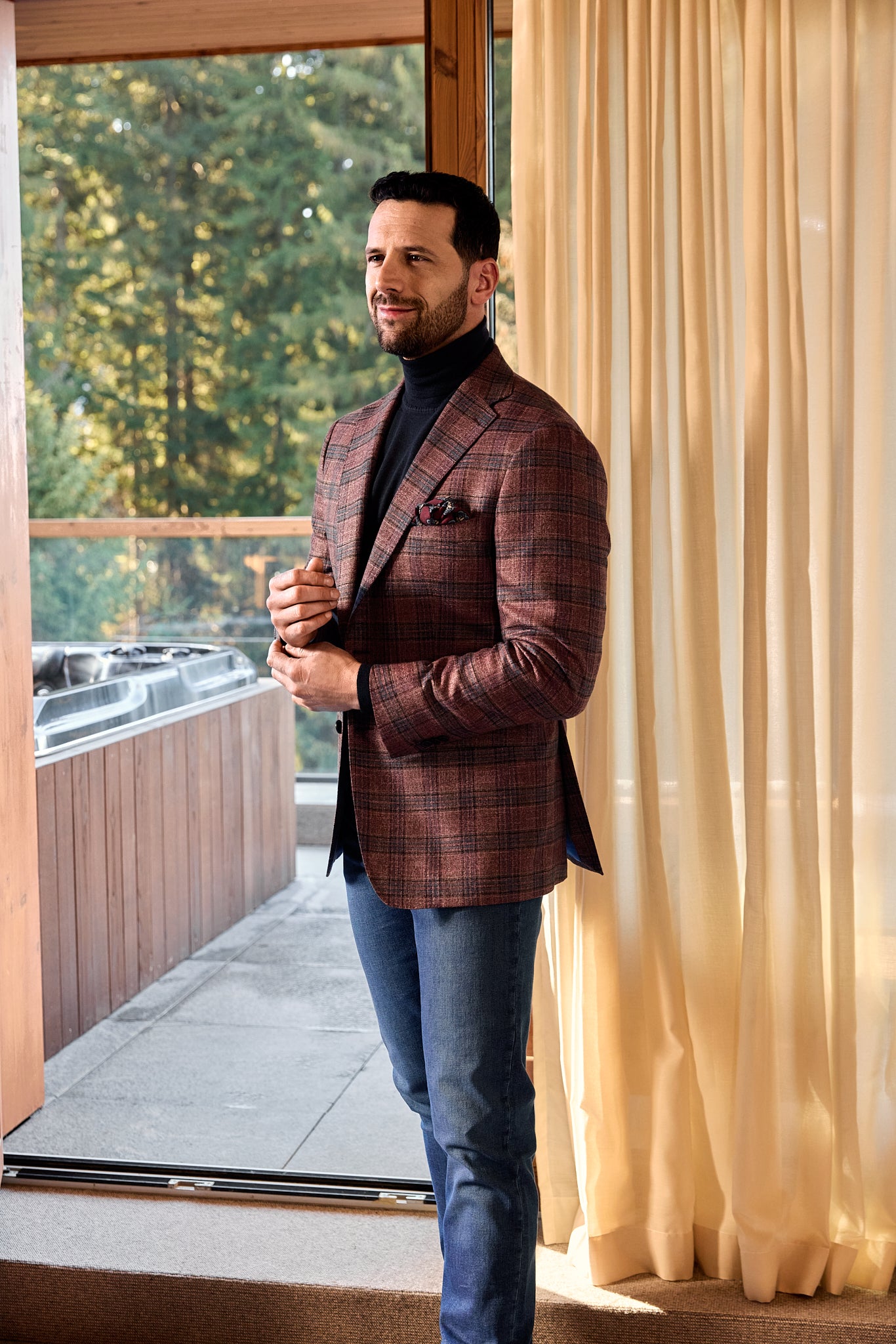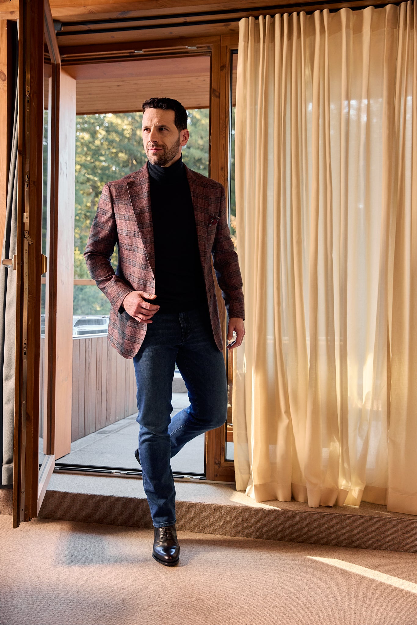 Sacoul are în compoziție 69% lână, 28% bambus și 3% in, și prezintă un pattern în carouri discrete, cu tonuri calde de maro și burgundy, completate de accente subtile de albastru și gri. Această combinație cromatică îi oferă versatilitate și un aer sofisticat, perfect pentru ocazii semi-formale, ieșiri de weekend sau întâlniri business casual.