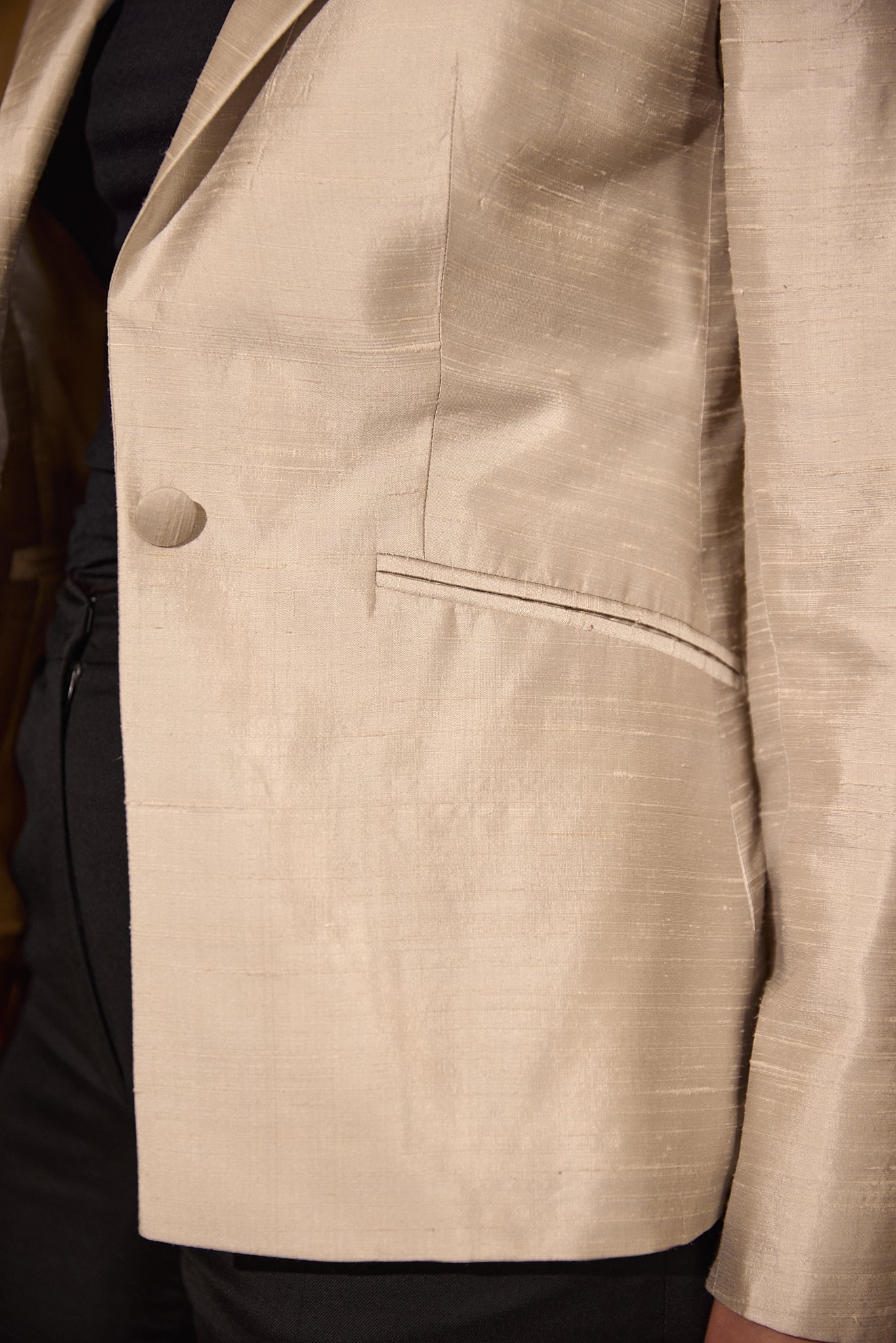 Textura subtil lucioasă a mătăsii, completată de nuanța sa champagne perlat, conferă acestui sacou o aură prețioasă, dar discretă, potrivită pentru femeia care își poartă eleganța cu subtilitate.
