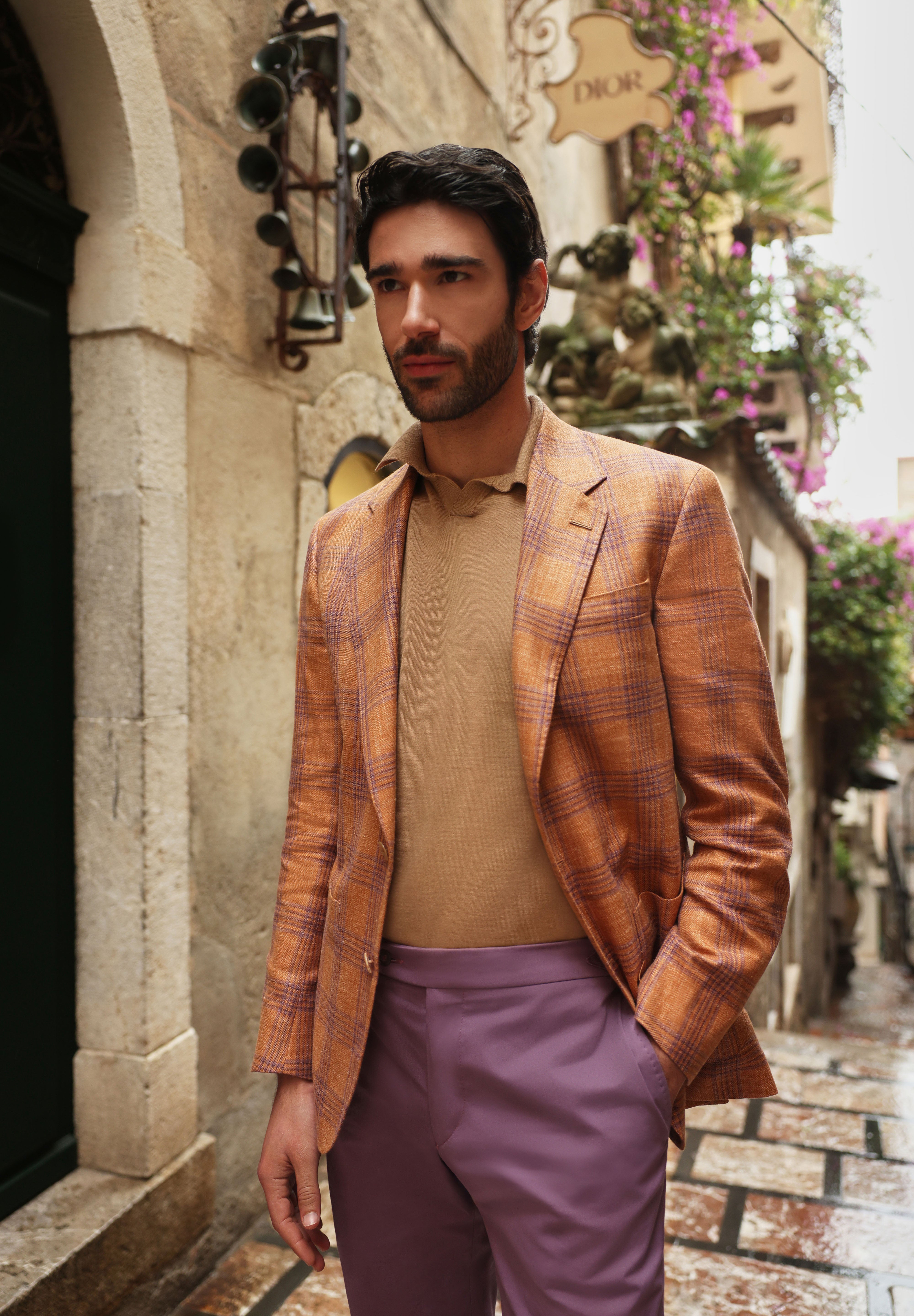 Sacoul Mazzaro este o capodoperă a fineței textile, creat dintr-un mix sofisticat de 38% lână, 34% mătase și 28% in de la prestigioasa țesătorie Scabal. Împletirea lânei cu mătasea îi oferă o strălucire discretă și o cădere fluidă, în timp ce inul adaugă textură și rezistență naturală.