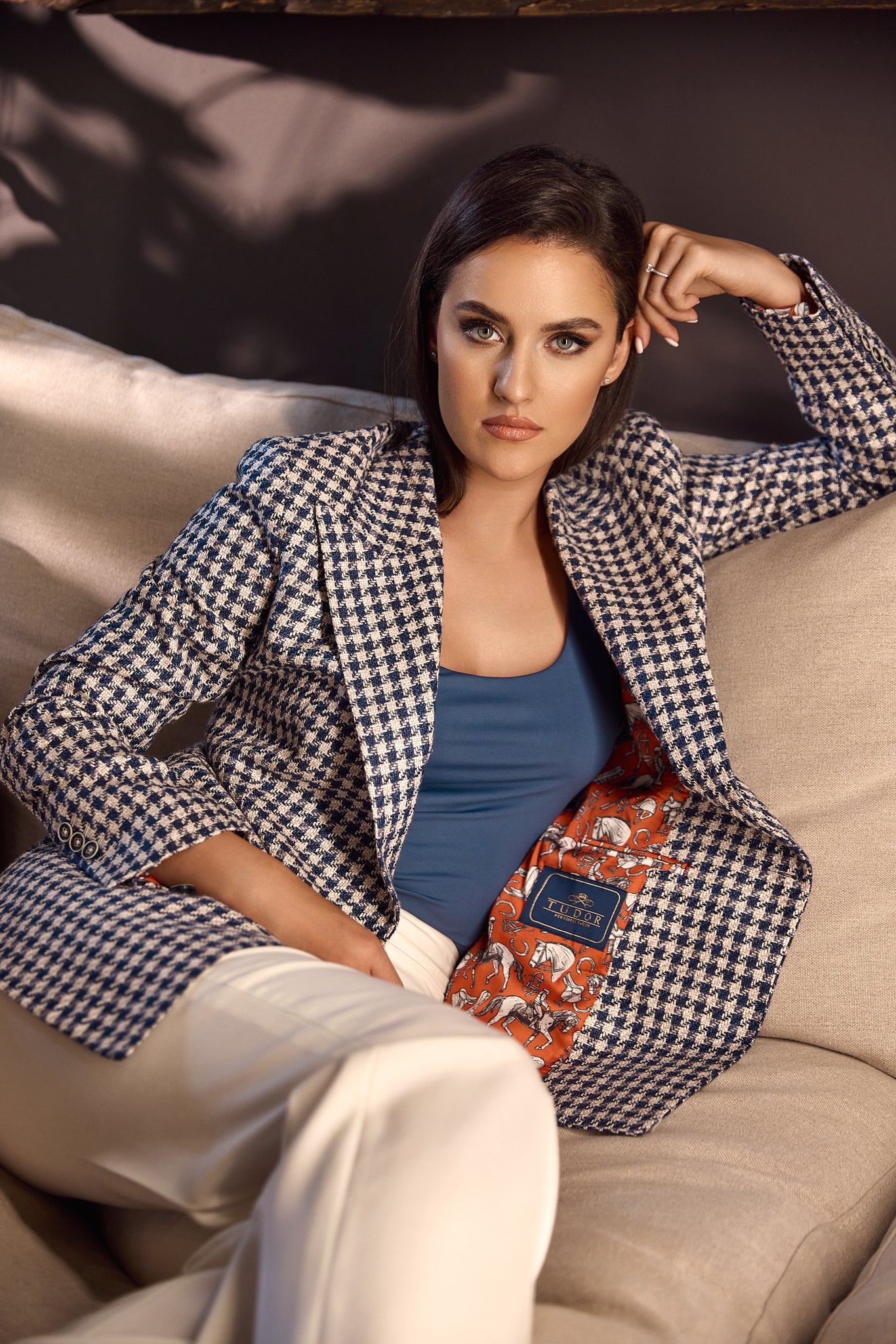 Modelul pied-de-poule reinterpretat în tonuri de bleumarin și crem îmbină clasicul cu avangarda. Acest pattern emblematic, asociat de-a lungul timpului cu sofisticarea aristocratică, este aici modernizat prin structură și cromatică, oferind sacoului o estetică vibrantă, dar perfect echilibrată.