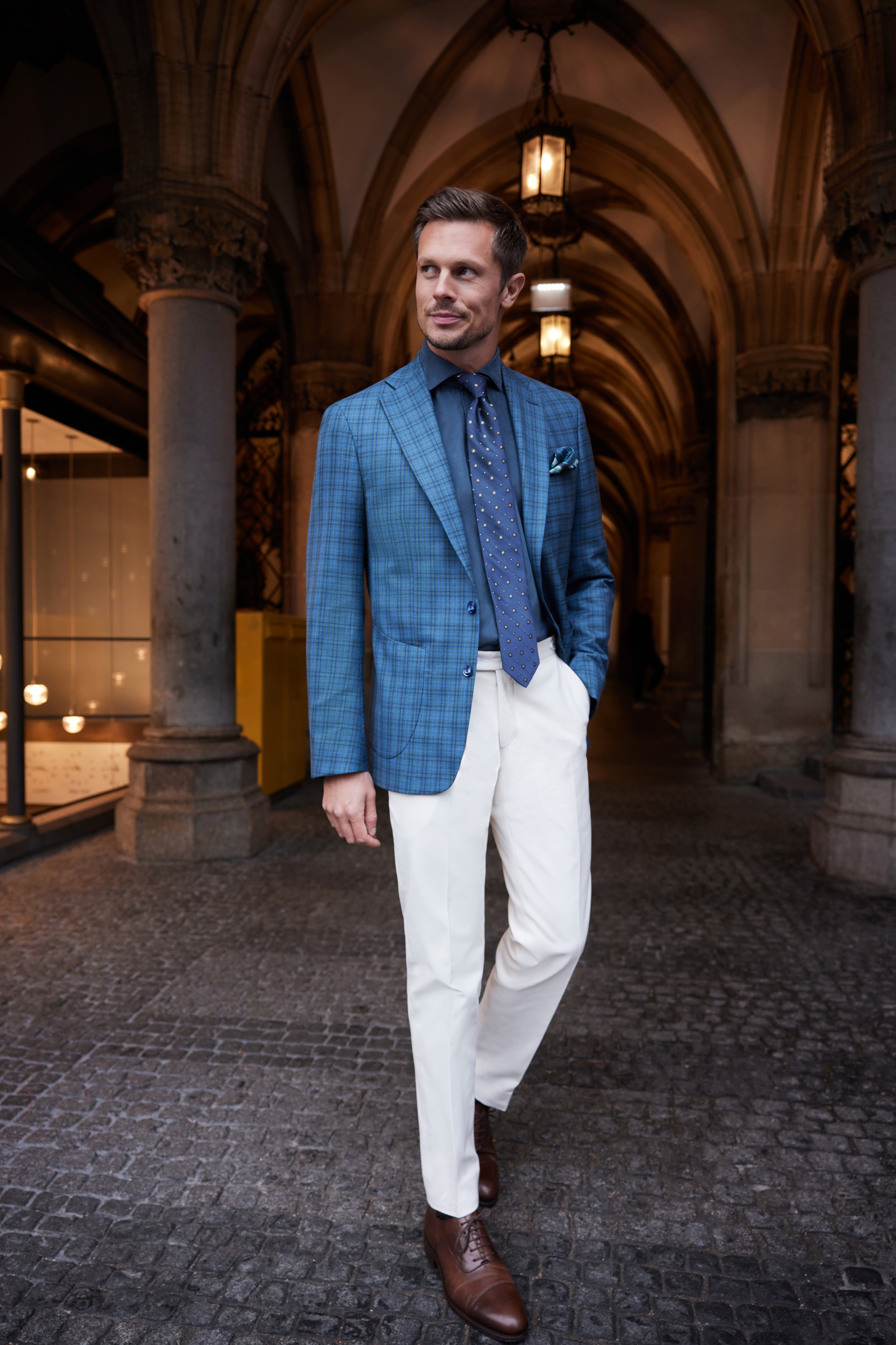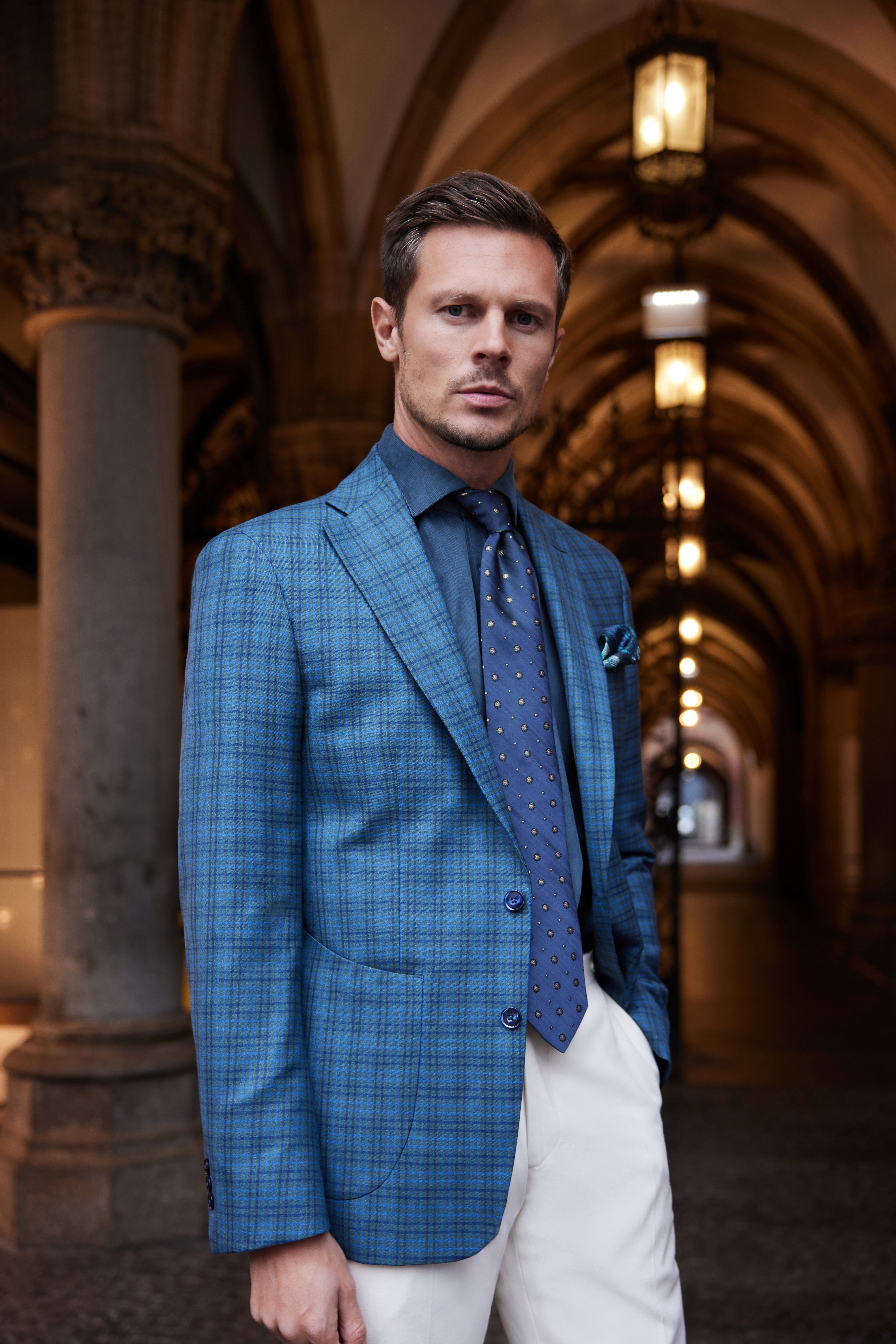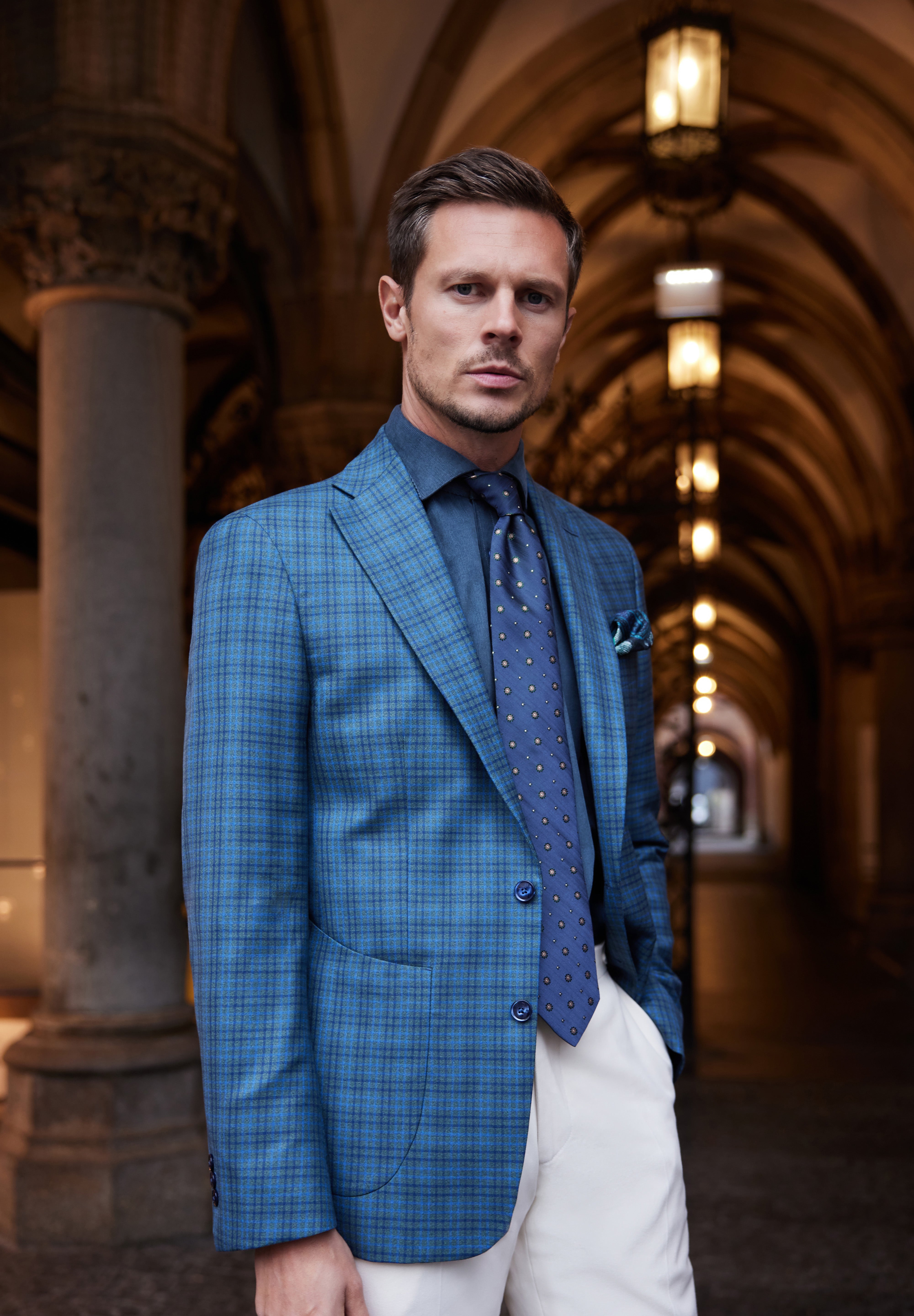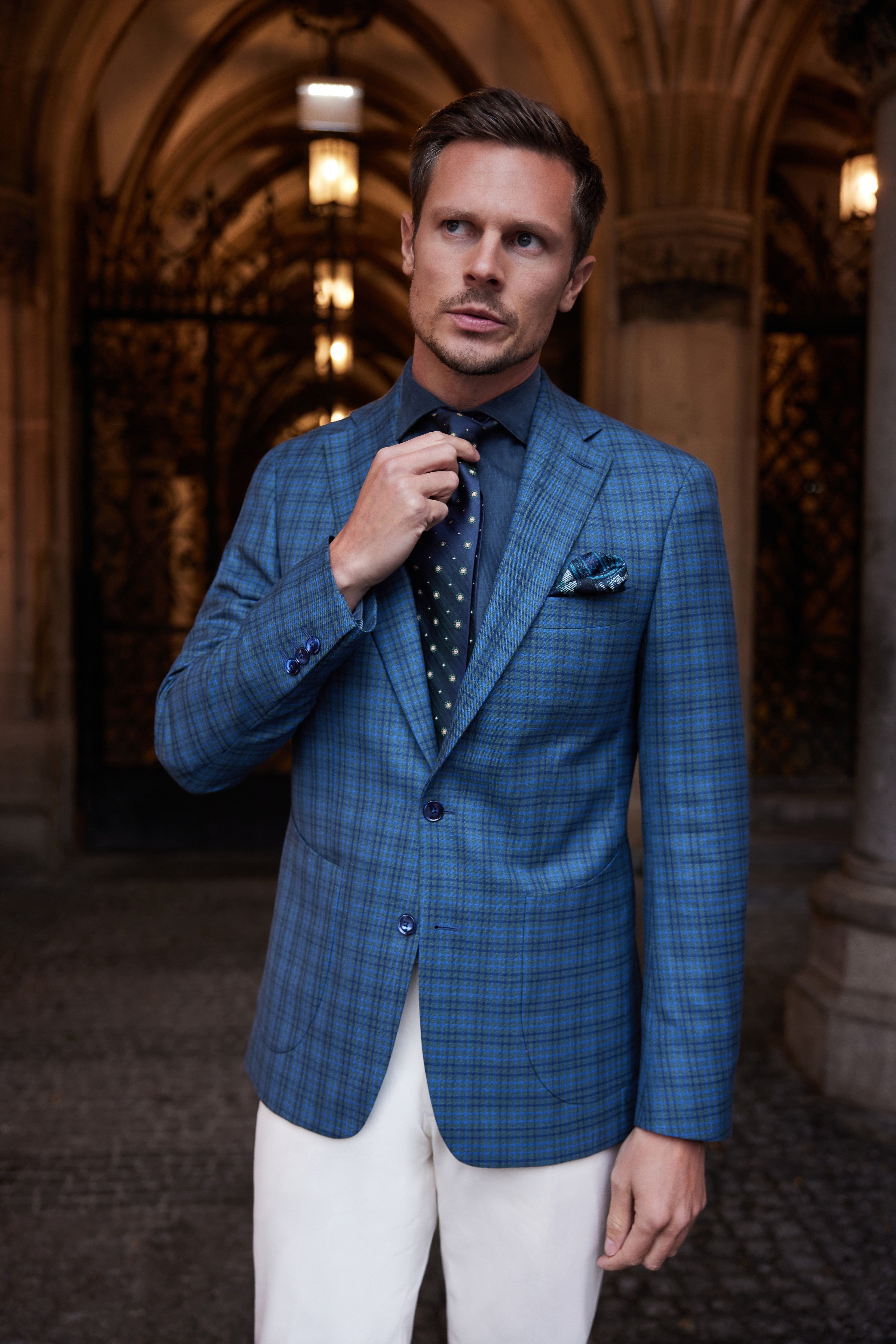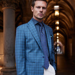 Textura sa delicată, străbătută de carouri fine, evocă echilibrul perfect dintre tradiție și libertate. Ideal pentru întâlniri de afaceri într-un cadru informal, seri culturale sau o plimbare printr-un oraș european la apus, acest sacou nu impune — ci exprimă.