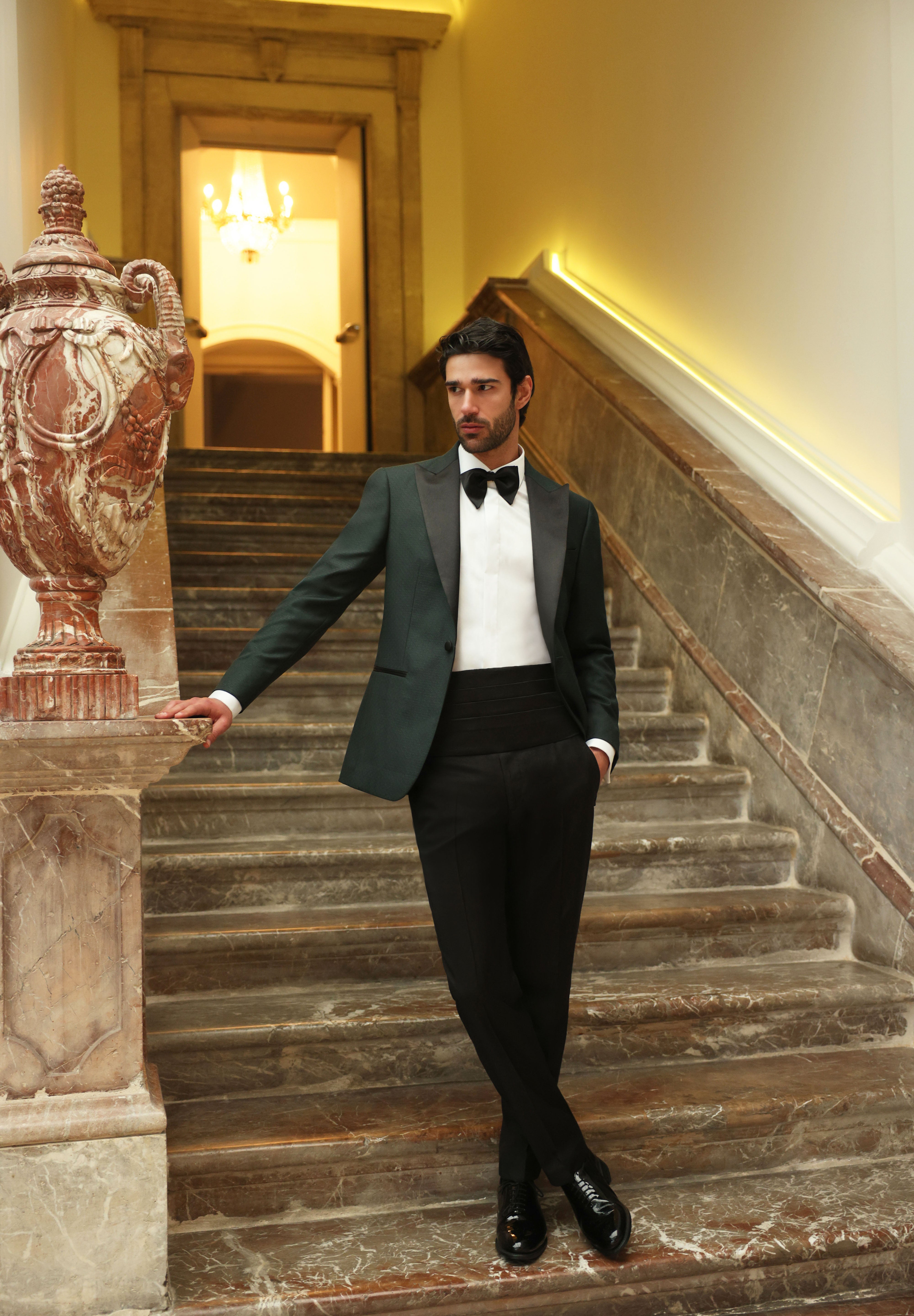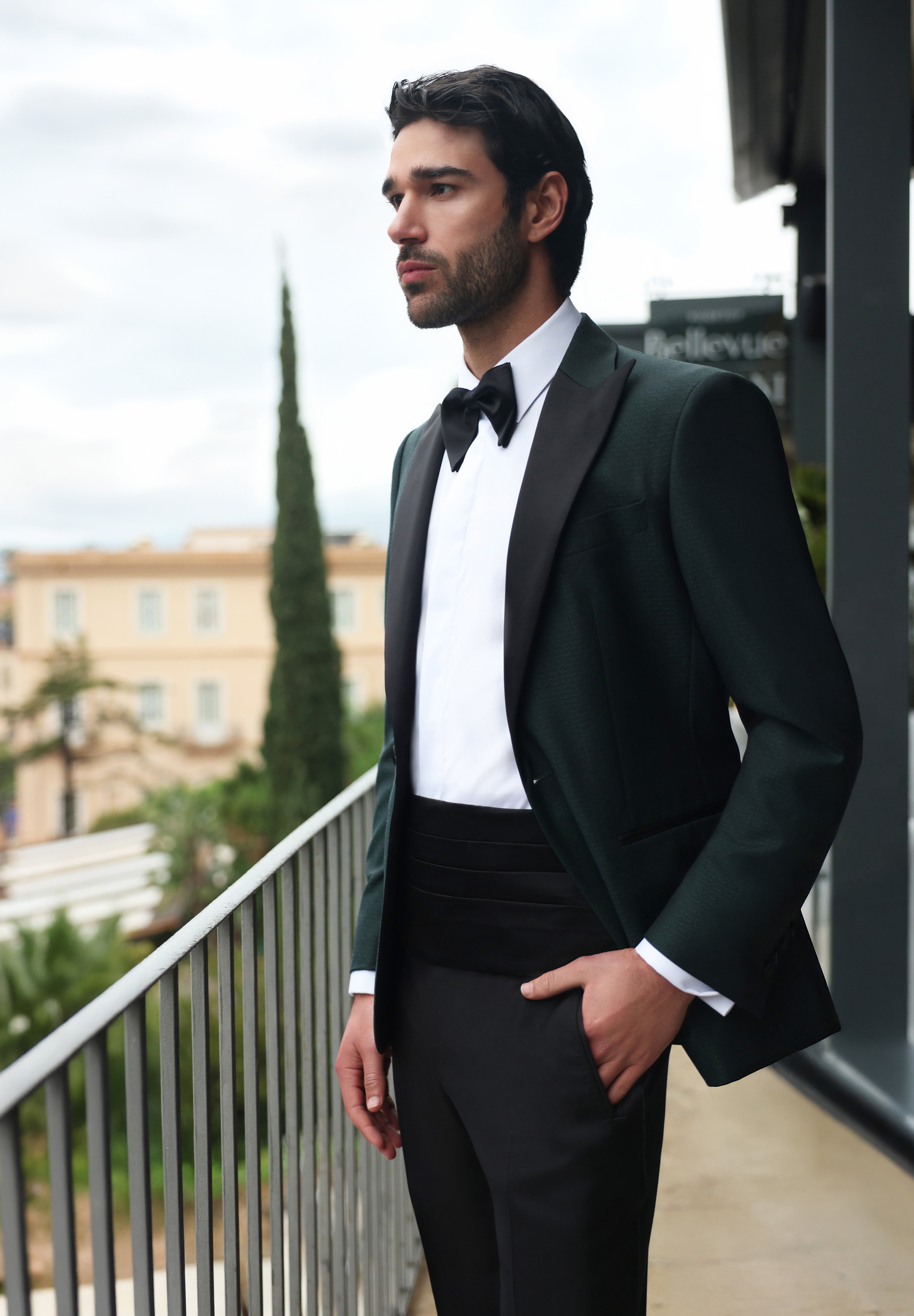 Acest costum brocart, croit pe comandă în sistem made-to-measure, transpune eleganța atemporală într-o nuanță profundă de verde smarald, strălucind discret sub lumina ambientală.