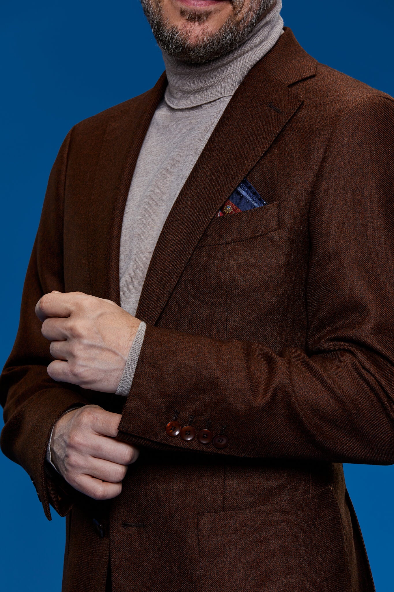 Un costum în tonuri de toamnă, într-o construcție casual, cu un touche moale și confortabil